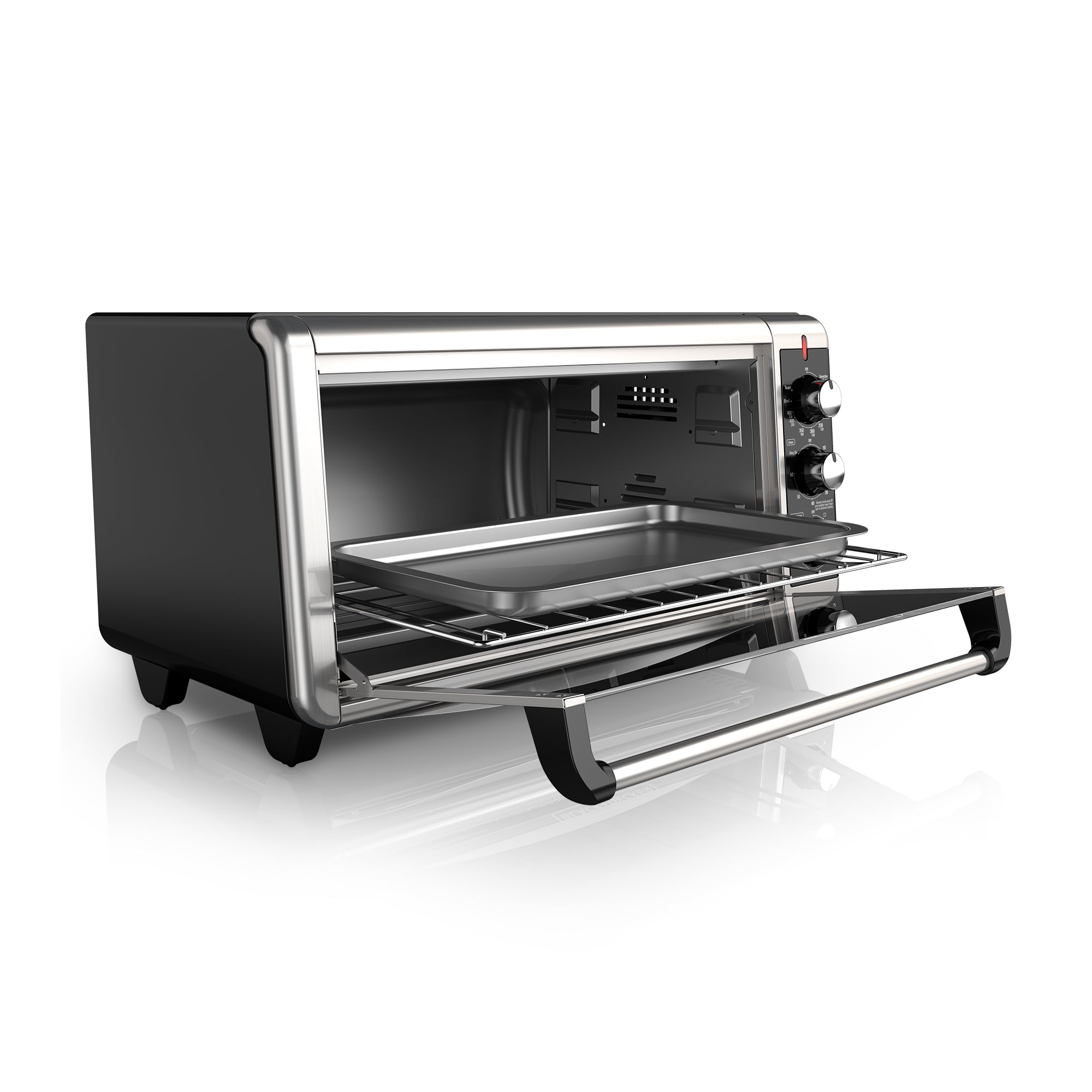 Fits Most Oven Pans – Use the pans you already have. This spacious oven fits most standard 9”x13” oven pans with handles. That means you can go from straight from oven to table. Plus, the included baking/broiling pan fits perfectly, making it easy to insert and remove food. Toasting rack also included. Convection Heating – The powerful convection fan circulates warm air throughout the oven for fast, even baking. Other functions include: baking, broiling, toasting, and keeping food warm.Dedicated Toast Timer – Get perfect toast every time using the dedicated toast timer. It allows for predictable shade selection with every use. Temperatures in the oven will be lower than your set point. This is due to advanced heating elements used in this oven. Temperature dial settings have been calibrated to provide expected results for most recipes taking into account the advanced heating elements. 60-minute Timer – The 60-minute precision timer features stay-on functionality for longer baking tasks. Dedicated precision toast timer. 3 rack positions for improved cooking flexibility 3 rack positions for improved cooking flexibility Removable crumb tray for easy cleaning. Larger size fits up to 8 slices of toast or a 12 inch pizza; Bright Indicator Light – So you know its on Internal Dimensions – 16.5 Inches x 12.5 Inches x 9.5 Inches Three Control Knobs – Temperature, Time, Toast Shade 1500 Watts