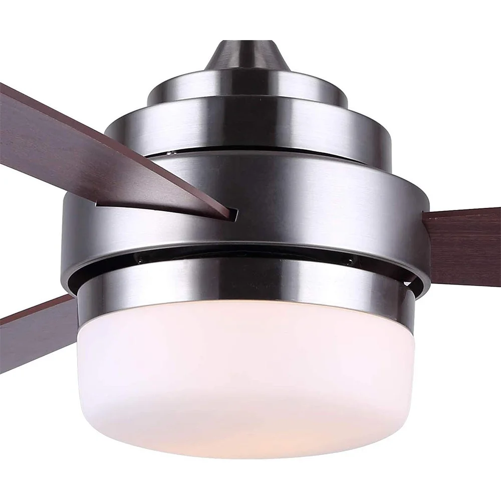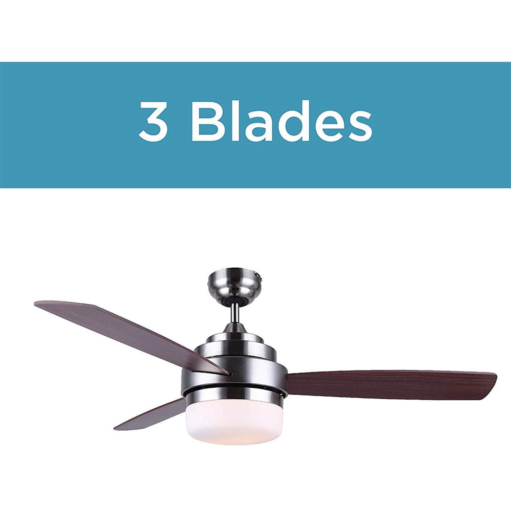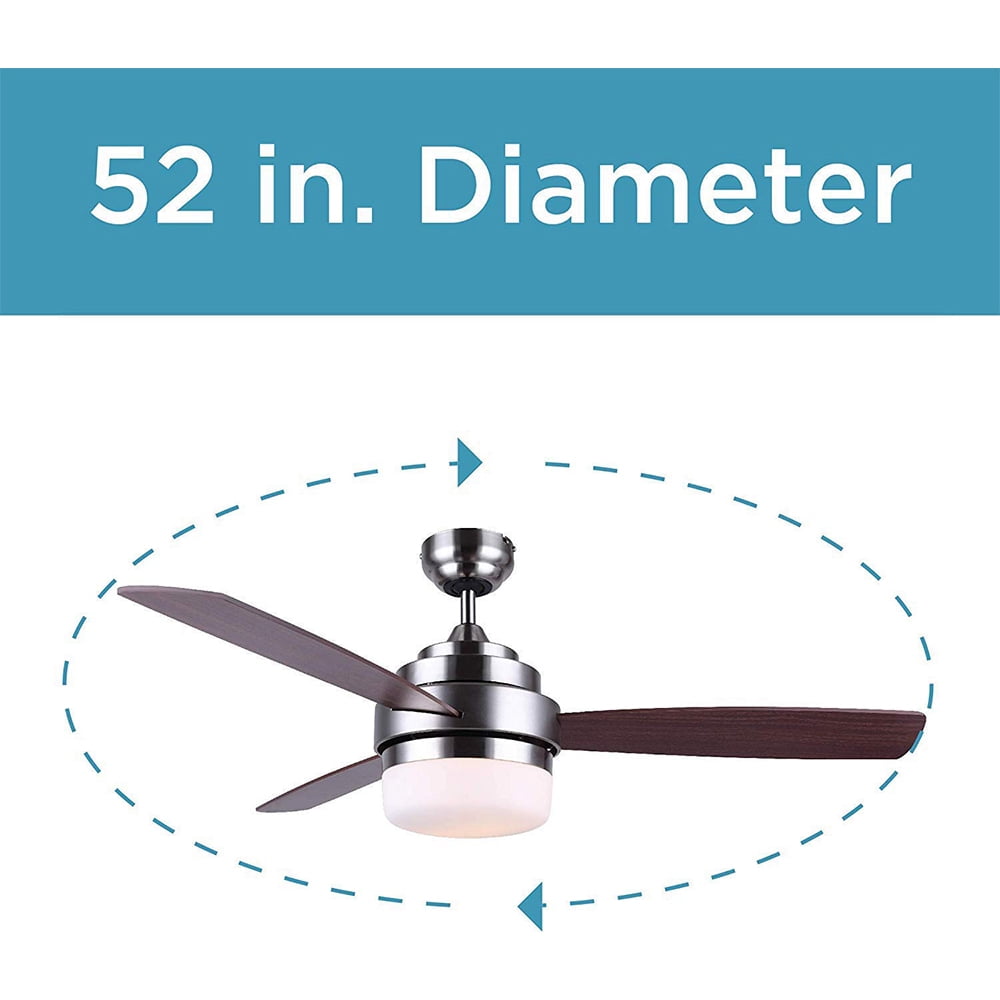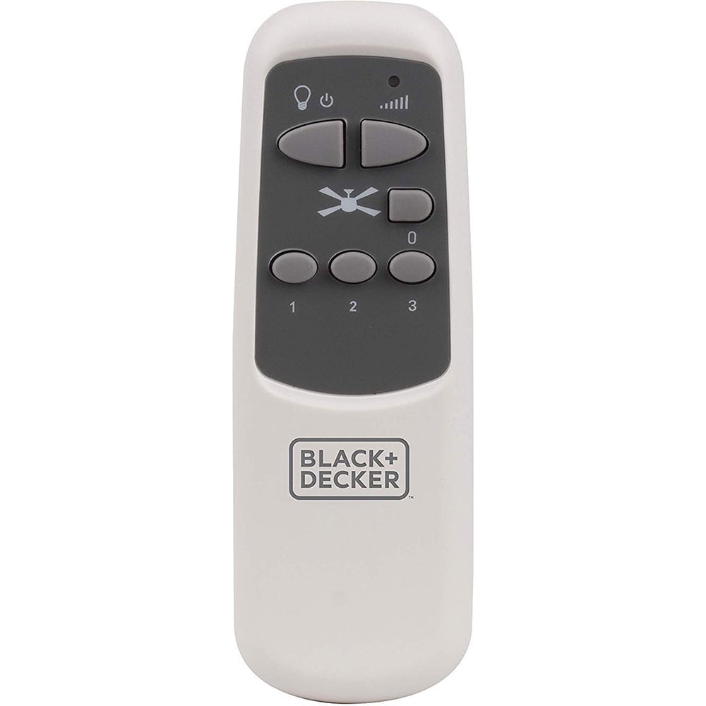 The BLACK+DECKER 52 In. Remote Controllable Ceiling Fan with 3 reversible plywood blades has a gorgeous brushed nickel finish. This ceiling fan has white frosted glass and 3-speed air flow rate. The BLACK+DECKER fan comes with a remote control and manual.