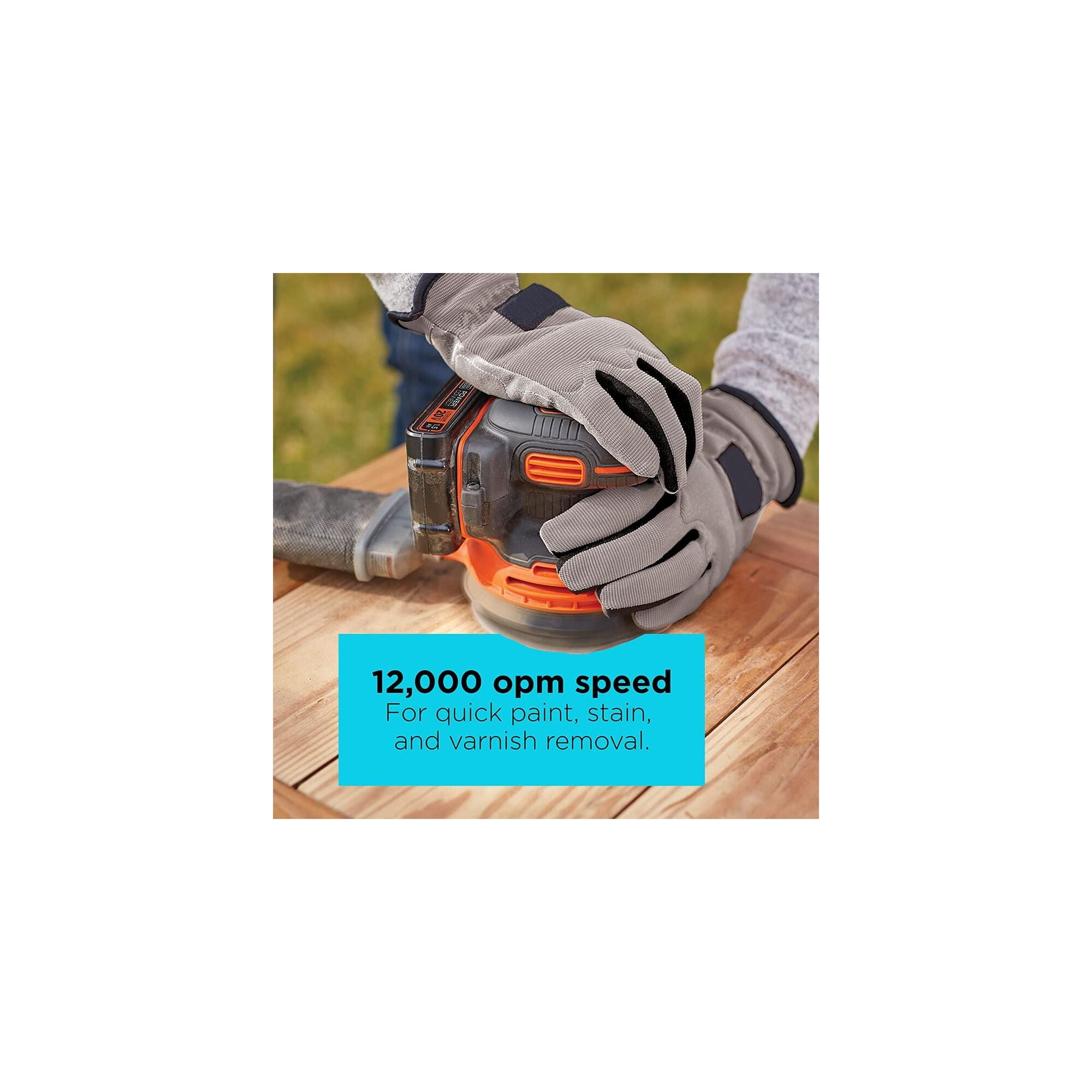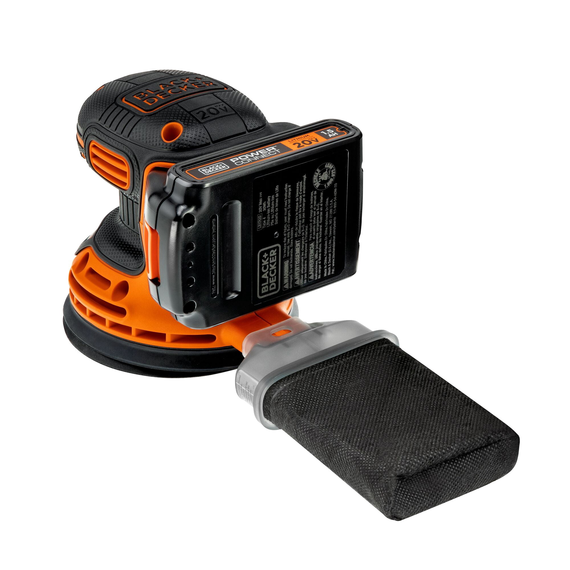 BLACK+DECKER BDRO20C, 20V, 1.5A Cordless Random Orbital Power Sander, 12000 OPM The 20V MAX* Random Orbit Sander offers cordless convenience for small projects and quick touches 30% more compact than leading competitors, making it easier to manoeuvre in tight spaces 12,000 OPM provides the speed needed to quickly remove material, paint, or stain Integrated dust collection helps keep the work surface clean during use The hook and loop system facilitates easy paper changes for efficient sanding