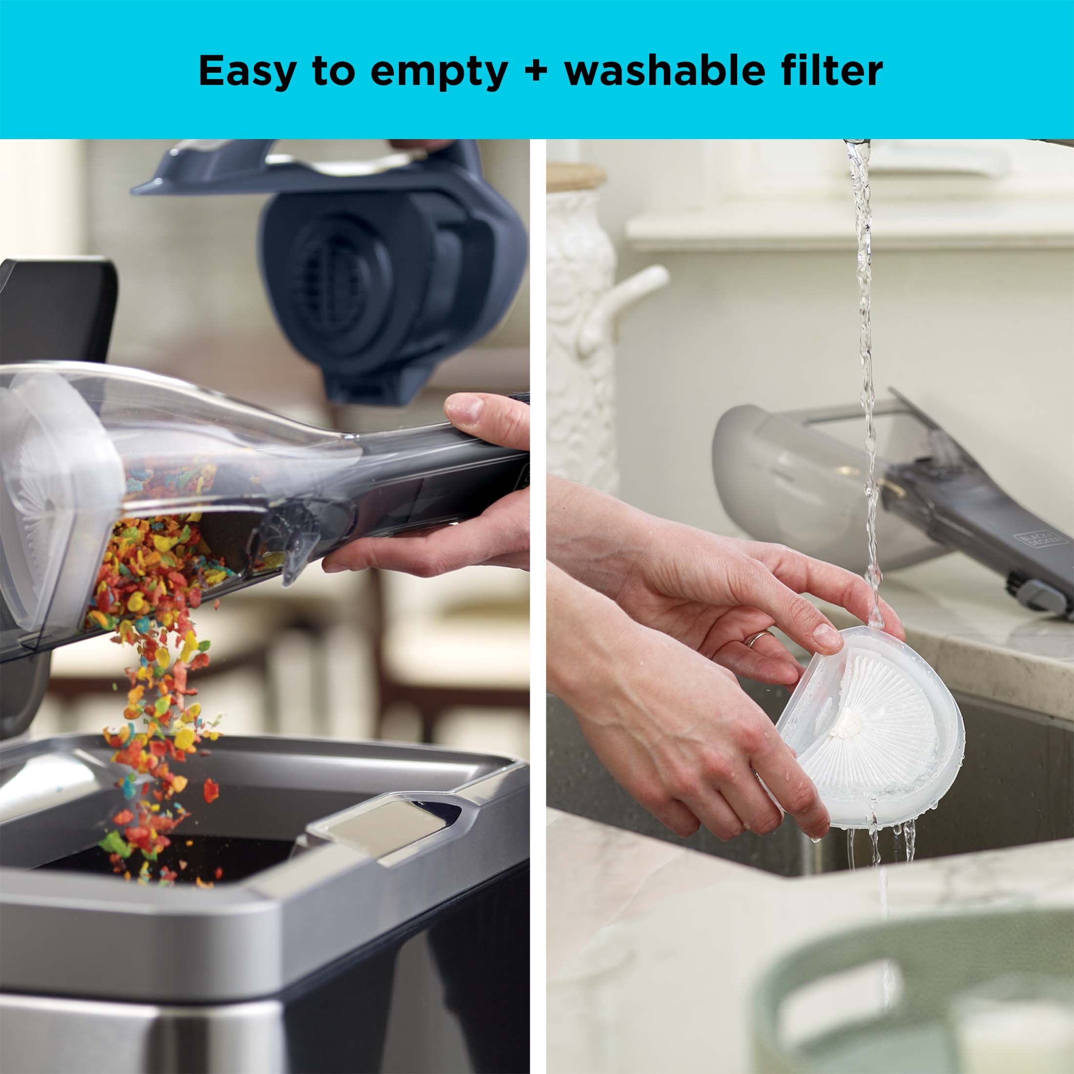 Easy empty dustbin prevents you from having to touch dirt. Lithium technology for strong suction and long battery life. Washable bowl and filter for thorough cleaning. Clear bagless dirt bowl is easy to see dirt and easy to empty. Pull-out crevice tool for hard to reach areas. Flip-Up brush for dusting and upholstery. Charging indicator light notifies you when vacuum is charging and/or fully charged. Wall mount for versatile storage solution. Compatible with: BLACK+DECKER VF110 Dustbuster Replacement Filter