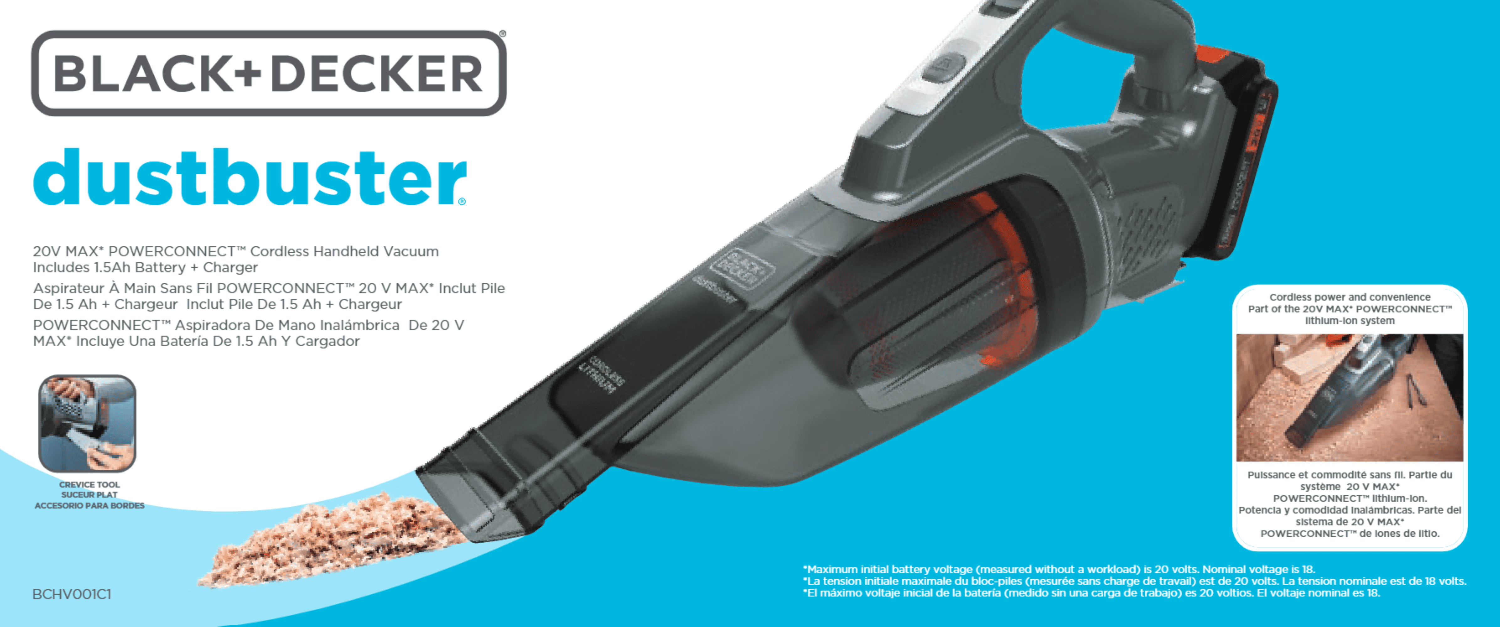 #1 brand hand vacuums** Optimal performance: 20V MAX* lithium ion battery provides high power suction and performance Cordless convenience: portable, rechargeable, and lightweight for use around your home and in your vehicle Up to 40% more suction power*** to help pick up debris and dirt 20V MAX* POWERCONNECT™ system compatibility: works with BLACK+DECKER™ 20V MAX* Lithium-Ion Battery System Maintain suction power with help from 2-stage filtration Reach tight and hard-to-access spaces with the included crevice tool, which conveniently stores onboard when not in use Designed for less frequent emptying with an extra-large dustbin design