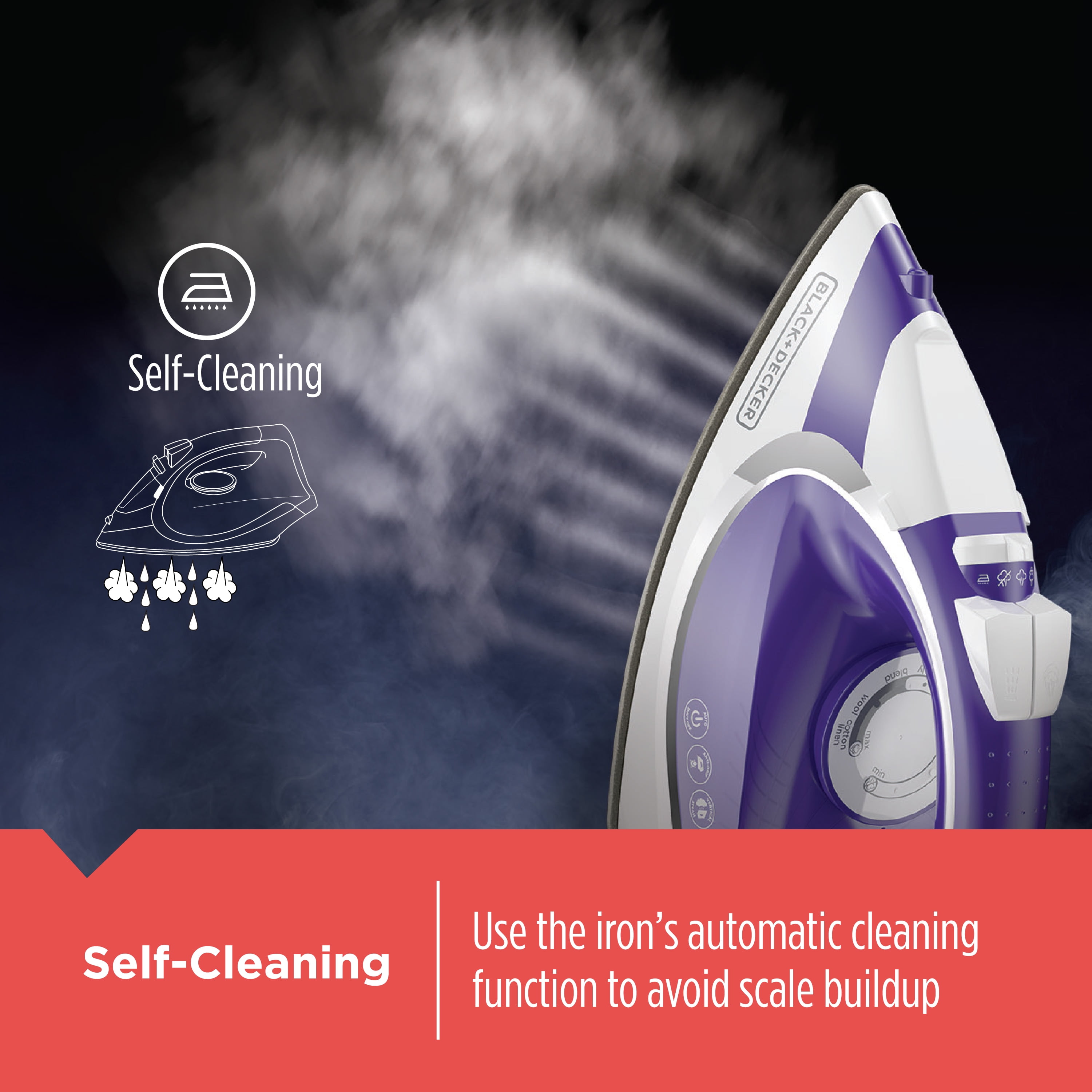 Discover a new way to iron! The BLACK+DECKER Light ‘N Go Cordless Iron makes it simple to remove wrinkles without the hassle that comes with traditional corded irons. The cordless design gives you the freedom of movement, with no power cord to tangle or get caught up on the ironing board. It’s all possible with the charging base, which heats up the iron fast and includes a light ring that indicates when the iron needs to recharge and when it’s ready to use. The nonstick ceramic soleplate retains heat well and smooths out wrinkles on a variety of ironable fabrics, and the steam and spray mist controls let you quickly remove tough creases and wrinkles. Other features include: 1500 watts, vertical steam, auto shutoff, large water tank, self-cleaning function, 1.8m (~6ft) power cord, 2-year limited warranty.