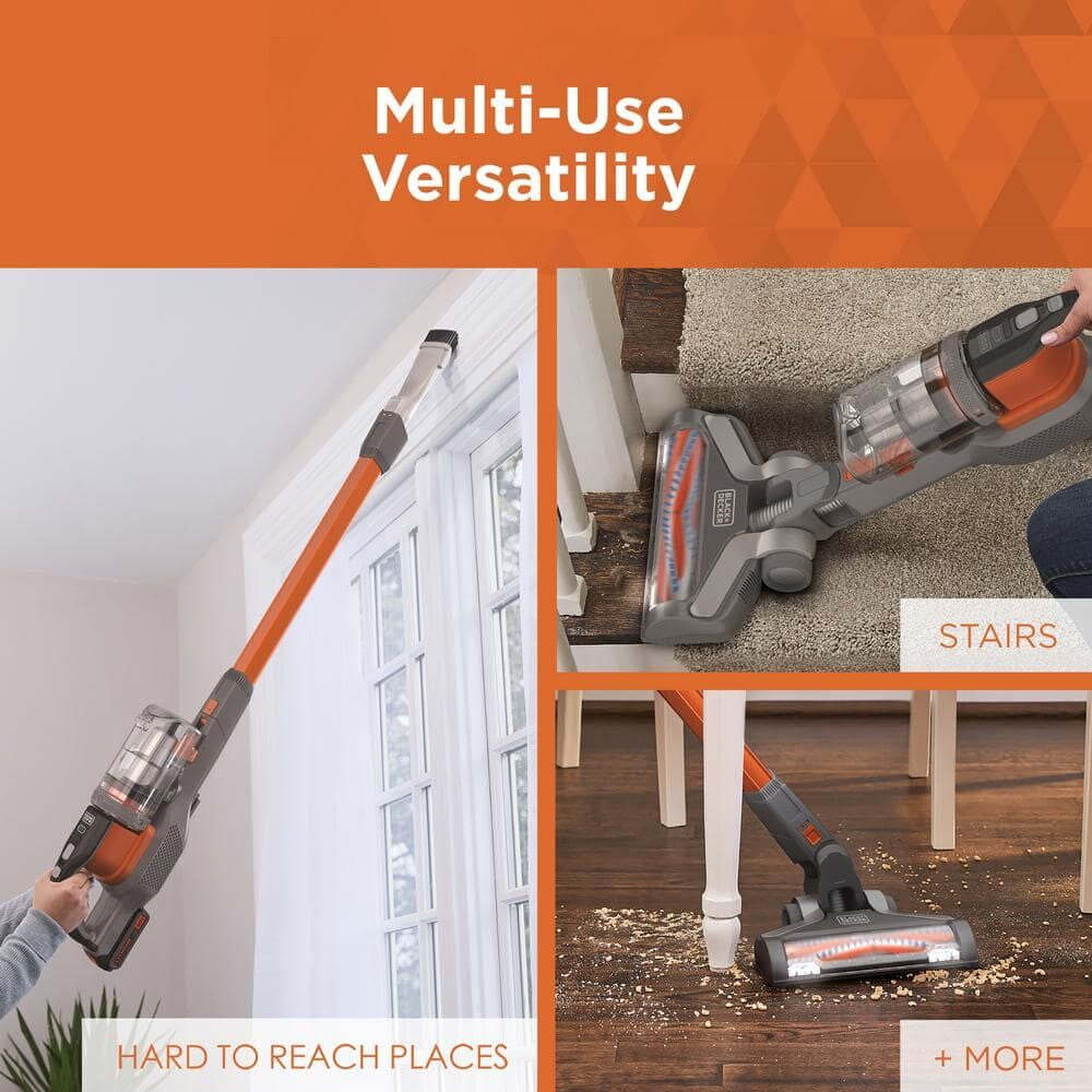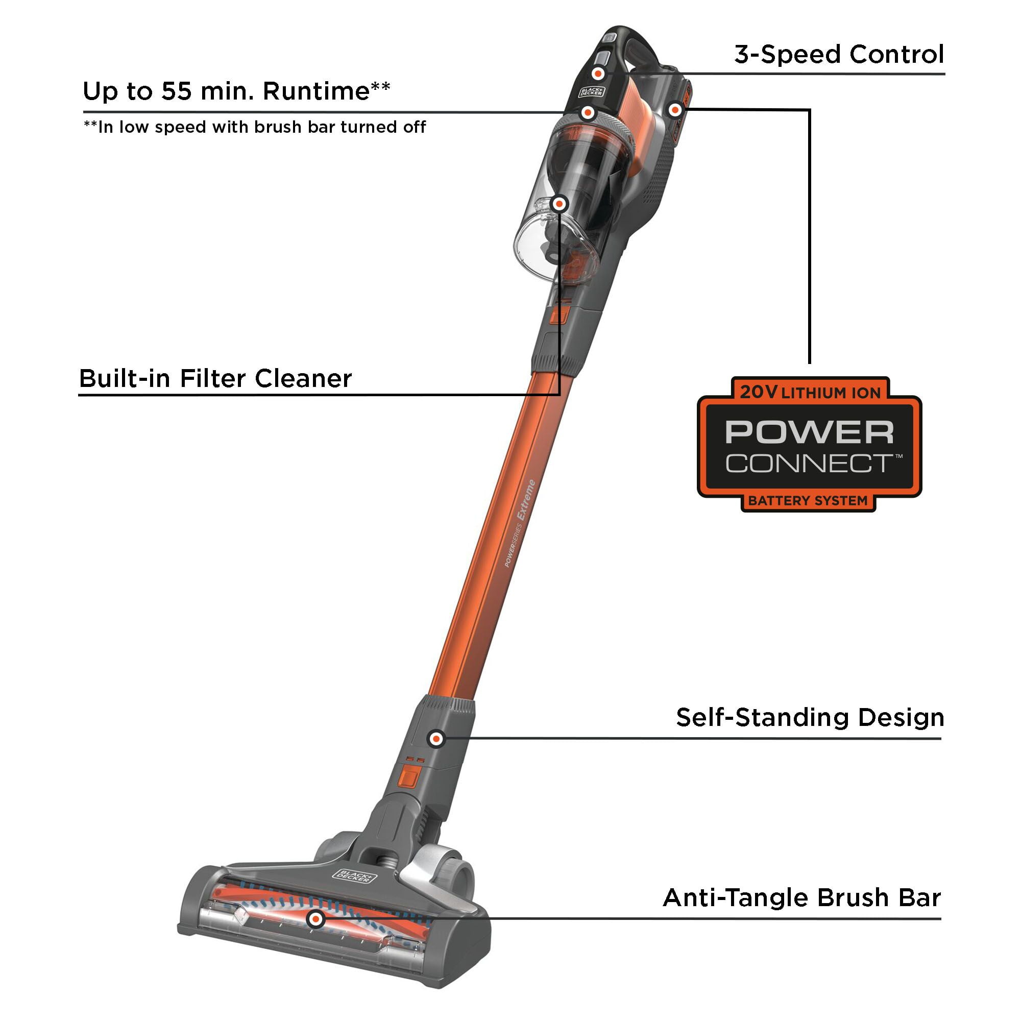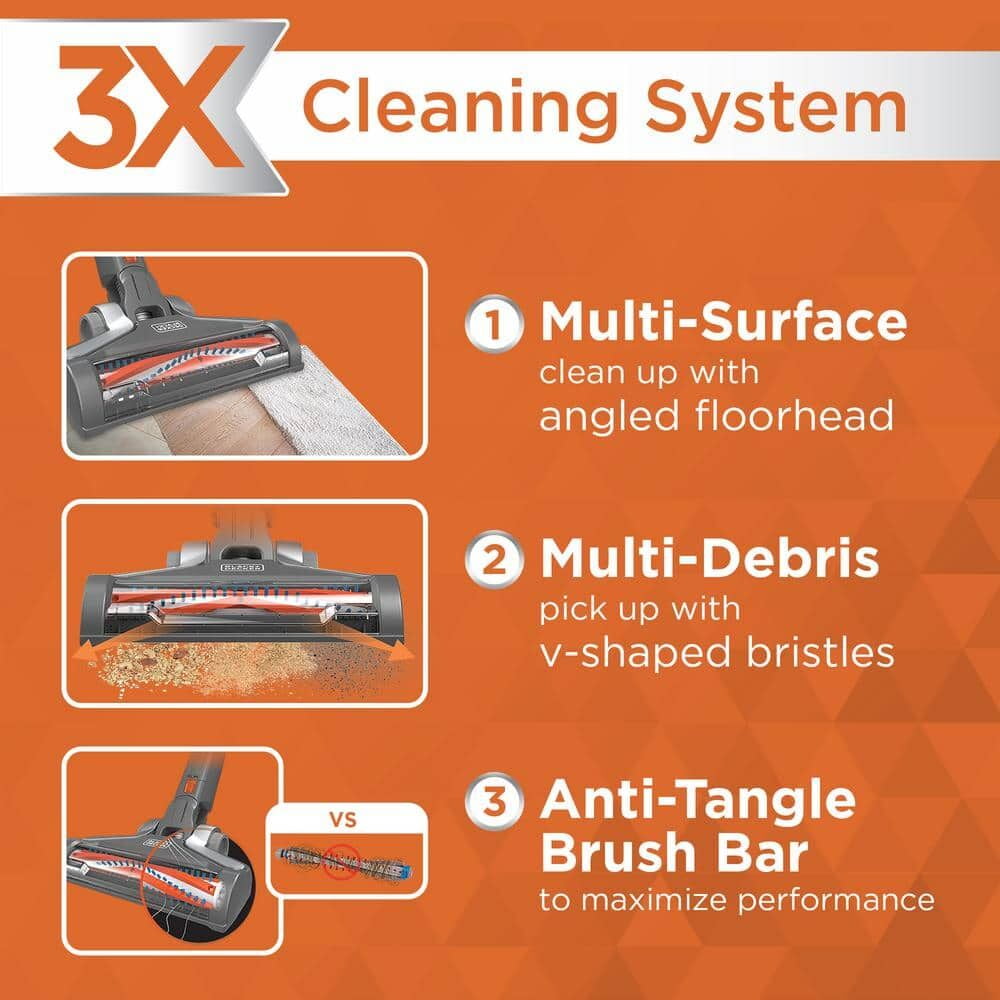 3X cleaning system designed for multi-surface clean up, multi-debris pick up, and an anti-tangle brush bar. Up to 75% better pick up on carpet Twist to clean: built-in filter cleaner provides up to twice the suction. Removable battery for convenient charging in or out of the vacuum. Up to 55 minutes of runtime**. 3-speed control for cleaning hard floors, area rugs, and carpet Self-standing design – no leaning necessary. Front-facing dustbin gives quick access when emptying and allows vacuum to lay flat for hard-to-reach areas. Convert to use as hand vacuum for versatile cleaning on stairs, furniture, hard-to-reach areas, and more. Easily empty dustbin with one touch. Part of the BLACK+DECKER® 20V MAX* battery system Cordless 20 V