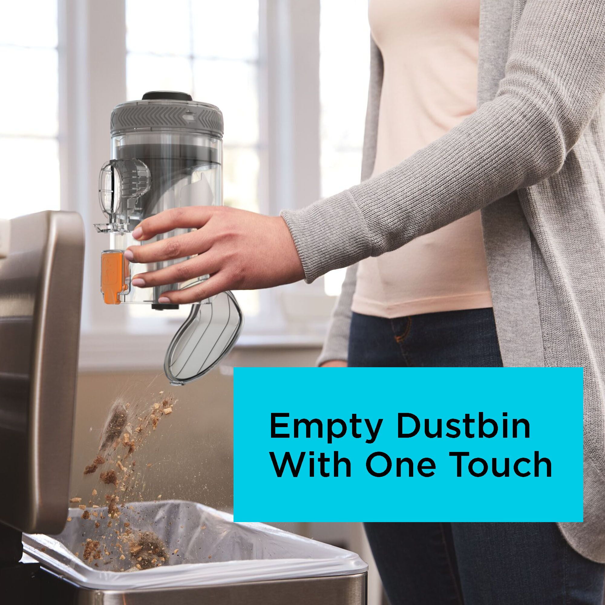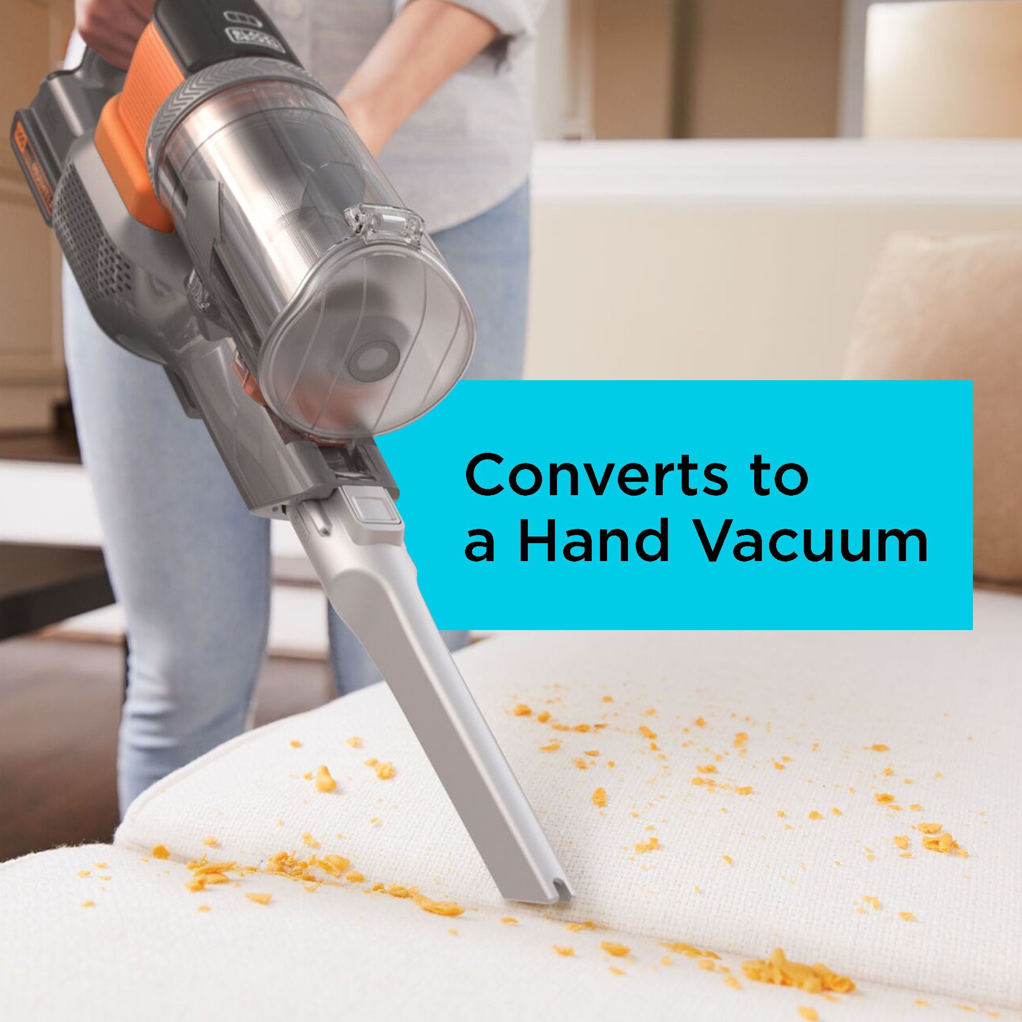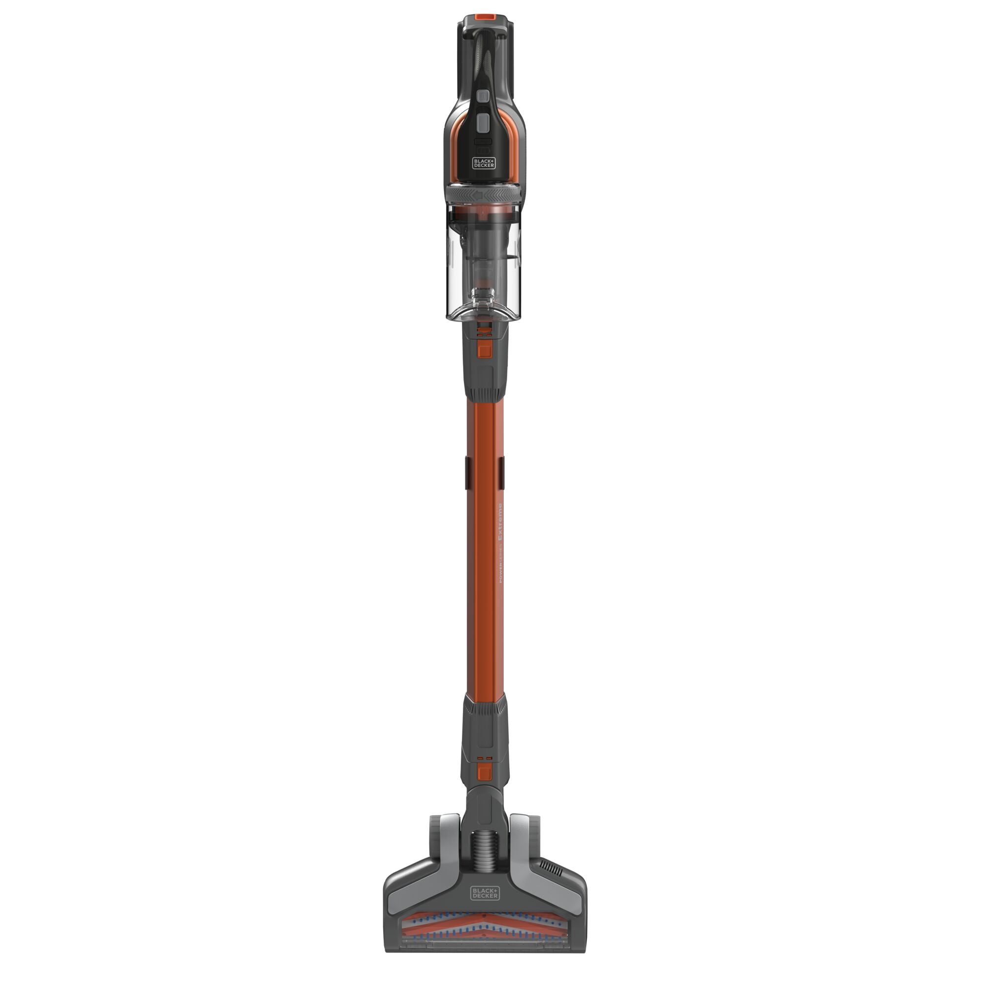 3X cleaning system designed for multi-surface clean up, multi-debris pick up, and an anti-tangle brush bar. Up to 75% better pick up on carpet Twist to clean: built-in filter cleaner provides up to twice the suction. Removable battery for convenient charging in or out of the vacuum. Up to 55 minutes of runtime**. 3-speed control for cleaning hard floors, area rugs, and carpet Self-standing design – no leaning necessary. Front-facing dustbin gives quick access when emptying and allows vacuum to lay flat for hard-to-reach areas. Convert to use as hand vacuum for versatile cleaning on stairs, furniture, hard-to-reach areas, and more. Easily empty dustbin with one touch. Part of the BLACK+DECKER® 20V MAX* battery system Cordless 20 V