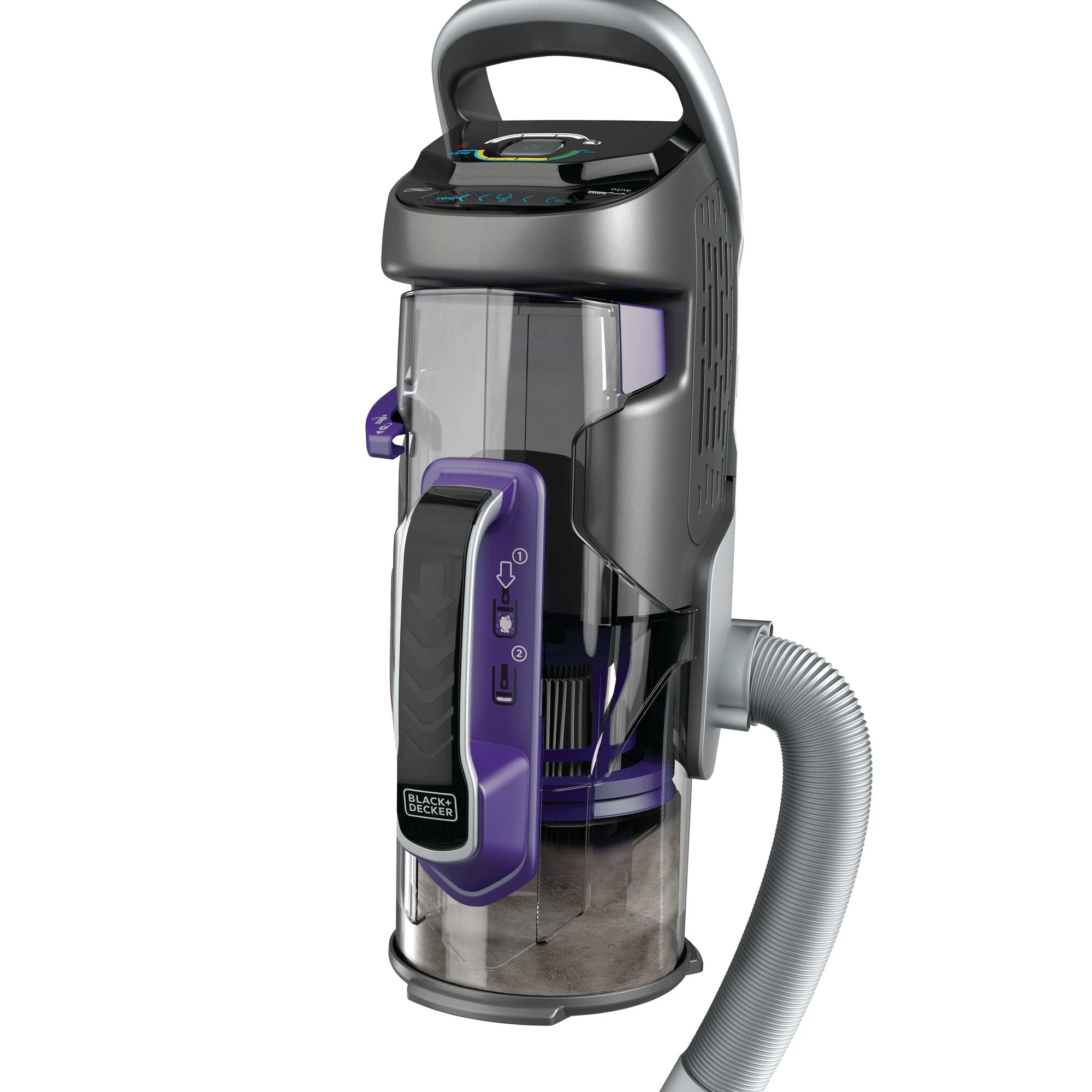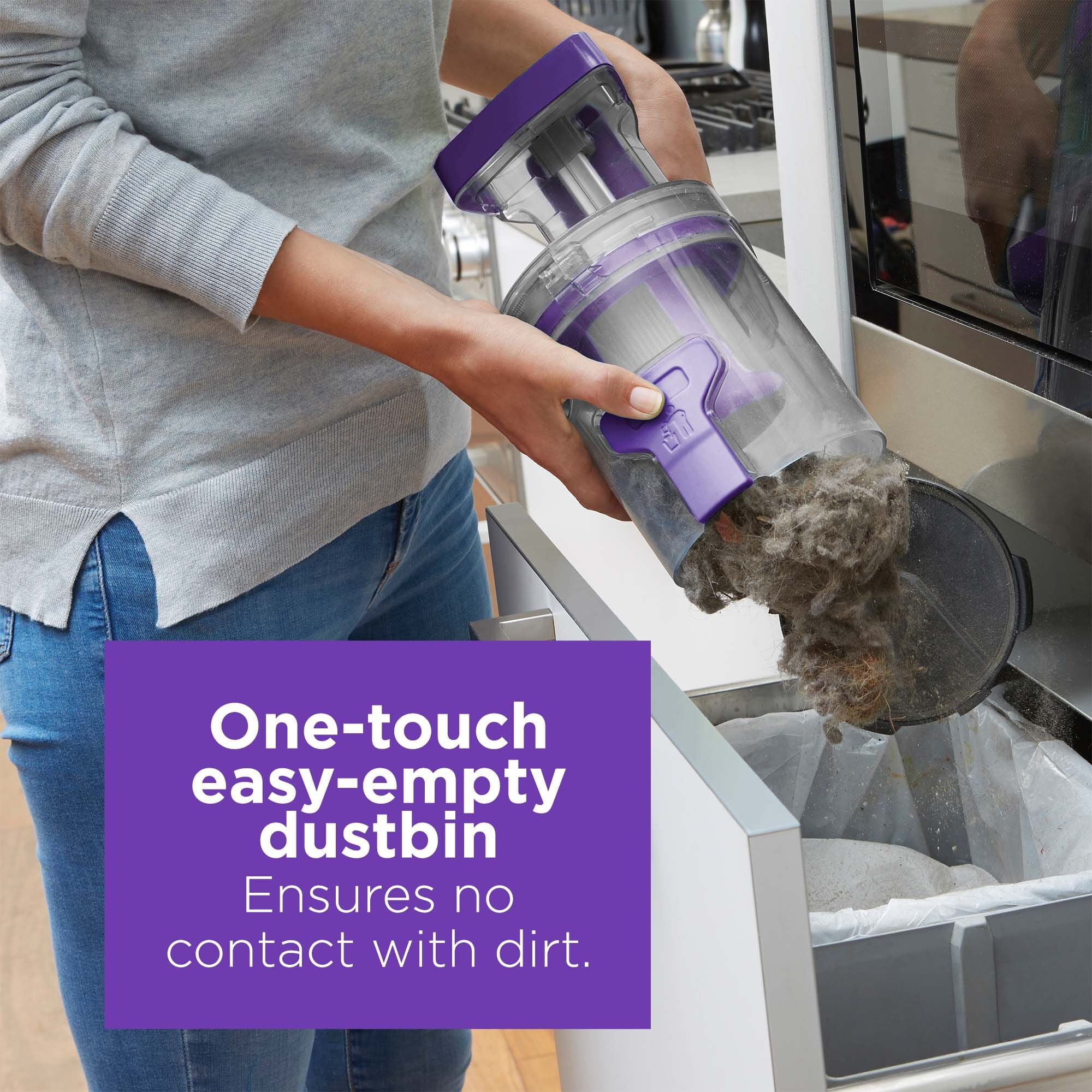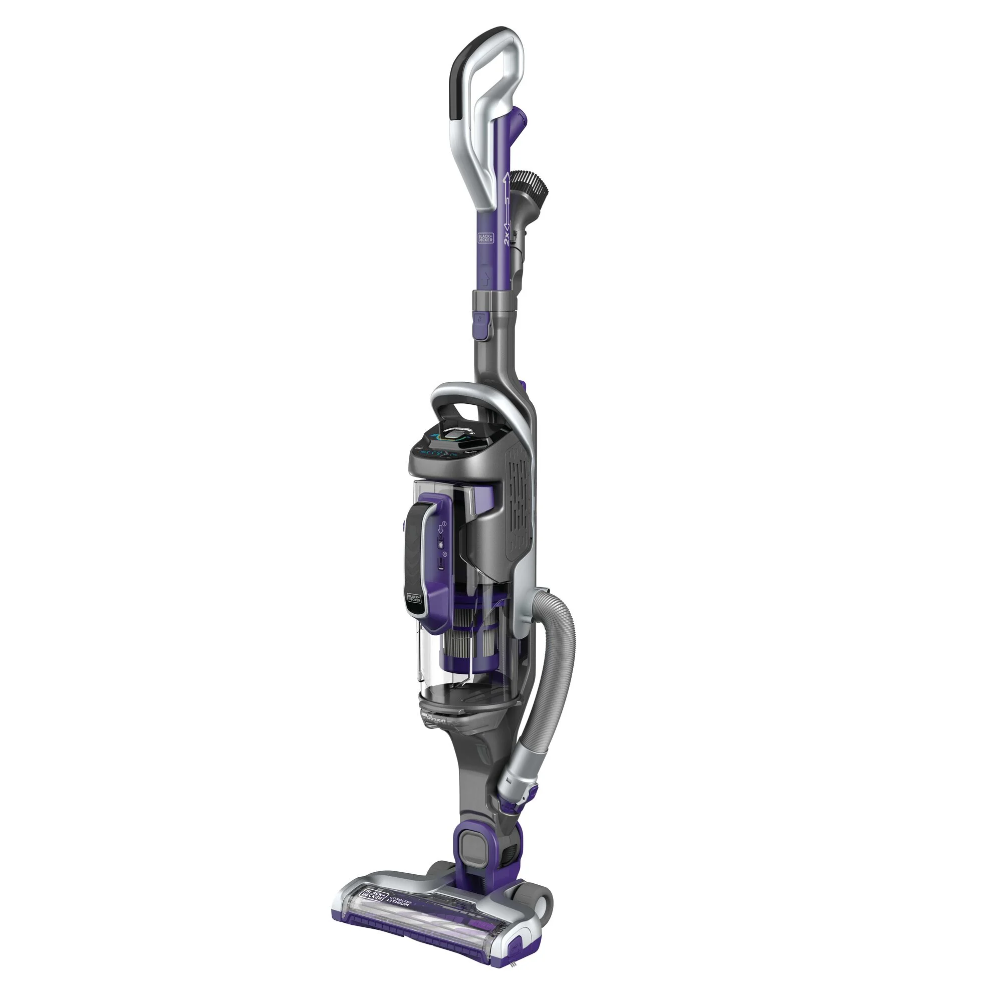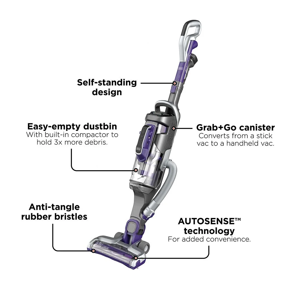 Up to 60 minutes of runtime (With canister only in low speed) Versatile, 2-in-1 vacuum for floor-to-ceiling cleaning – just grab and go with easy portable canister Anti-tangle rubber bristles quickly lift out hair trapped in deep in carpets and hard floor With the dust compactor feature, you can create more space in the canister to extend cleaning time before your next empty Empty dirt and debris in a trash bin with the touch of a button SMARTECH features make cleaning easier: AUTOSENSE automatically adjusts suction from bare floor to thick carpet to optimize runtime, BATTERYSENSE shows you how much battery remains, and FILTERSENSE alerts you when it’s time to clean the filter Swivel steering enhances maneuverability Low-profile design for cleaning hard to reach areas With the touchscreen controls, adjust suction speed, enable AUTOSENSE, and control LED light LED light illuminates cleaning surfaces Brush bar detaches easily for quick cleaning 3-in-1 accessory tool: 6-inch nozzle, crevice tool, and upholstery brush Extension wand and 4-foot hose for overhead reach and versatility