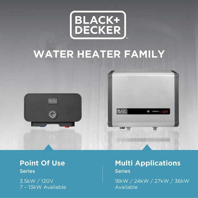 Black+decker electric Tankless hot water heaters provides you with endless hot water only when you need it, without the wait or worry of ever running out. Unlike conventional tank water heaters, which constantly consume energy to keep your water hot 24/7, this state-of-the-art, digital technology will instantly reduce your energy consumption and save you money on energy costs simply by heating water on demand. The unit does not require any gas lines or venting, and the compact design allows you flexibility to install virtually anywhere – in a cabinet, closet, garage, basement, etc. You can be sure to earn some precious space by installing this unit! Black+decker electric Tankless water heaters also offers a great value with the assurance the category’s strongest warranty – 7 years leakage free, 5 years on the heat exchanger, and 2 years parts only. (Important: inlet temps vary by location and seasonality. Selecting the right water heater depends on your incoming water temperature, flow rate, and desired output temperature. – See performance guide or manual before purchasing.) – can serve up to 6 applications (4 showers and 2 faucets in in warm to hot climates).