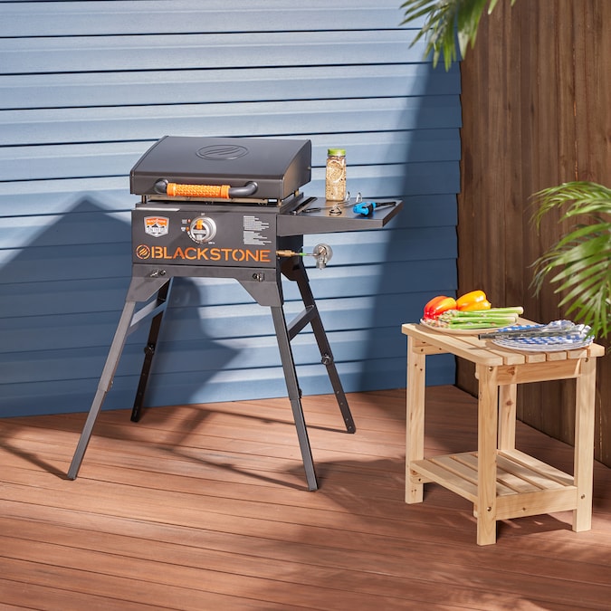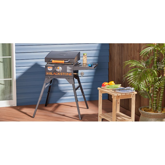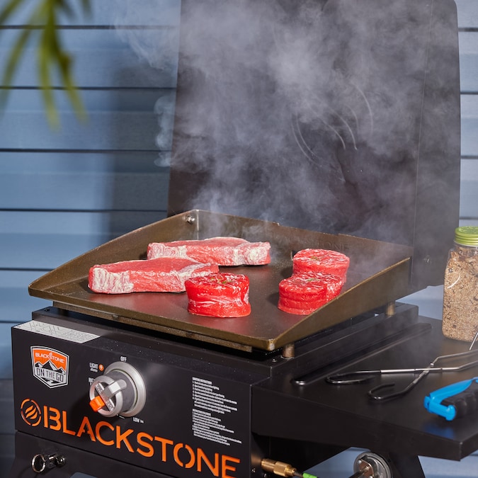 Wherever you go for adventure, take an on the go 17″ Blackstone griddle with collapsible stand for delicious meals to go with those amazing views. Perfect for camping, fishing, hunting, tailgating, backyard partying, this portable griddle does it all! Unlike traditional grills, your food won’t to fall through the grates or char to blackness on a griddle. Plus virtually anything can be made on the 17″x17″ cooking surface including veggies, pizza, deserts, breakfast, and so much more! The fold out and extend legs make set up quick and easy. Plus a shelf for extra prep space easily latches on and off above the propane attachment keeping everything tidy and safe. Extra grip and protection was added to the handle of the hood so you aren’t surprised with a warm touch. This one burner griddle sets up quickly and has everything you need to cook delicious food that will please everyone!