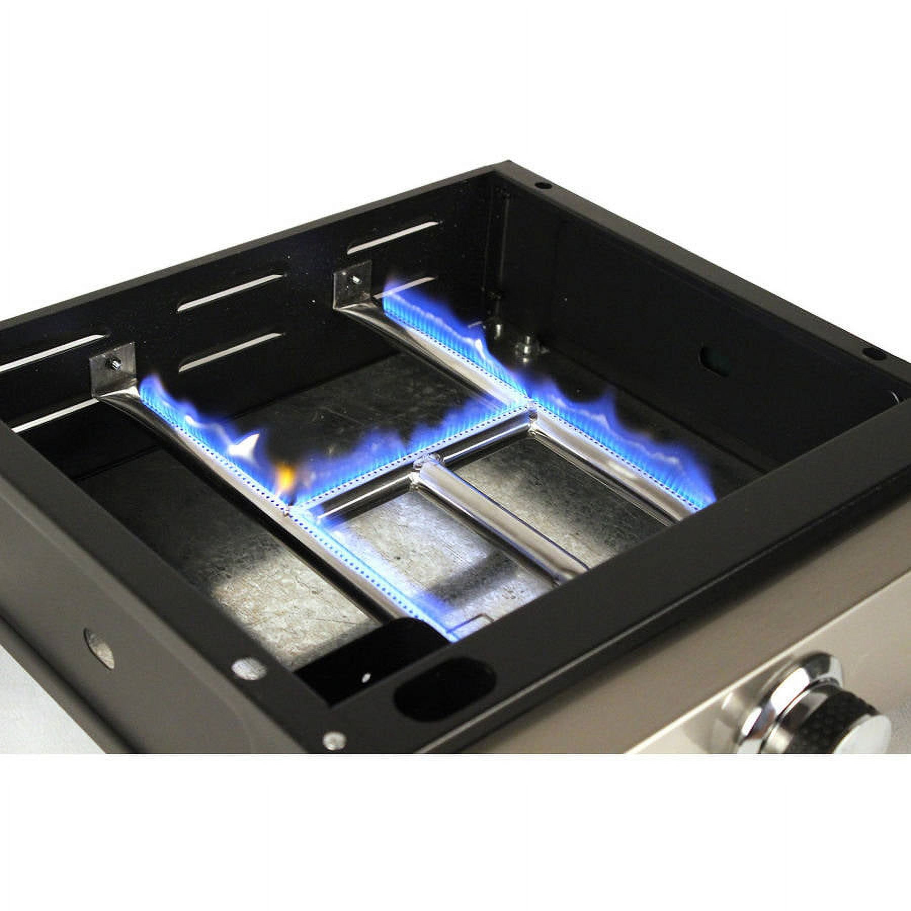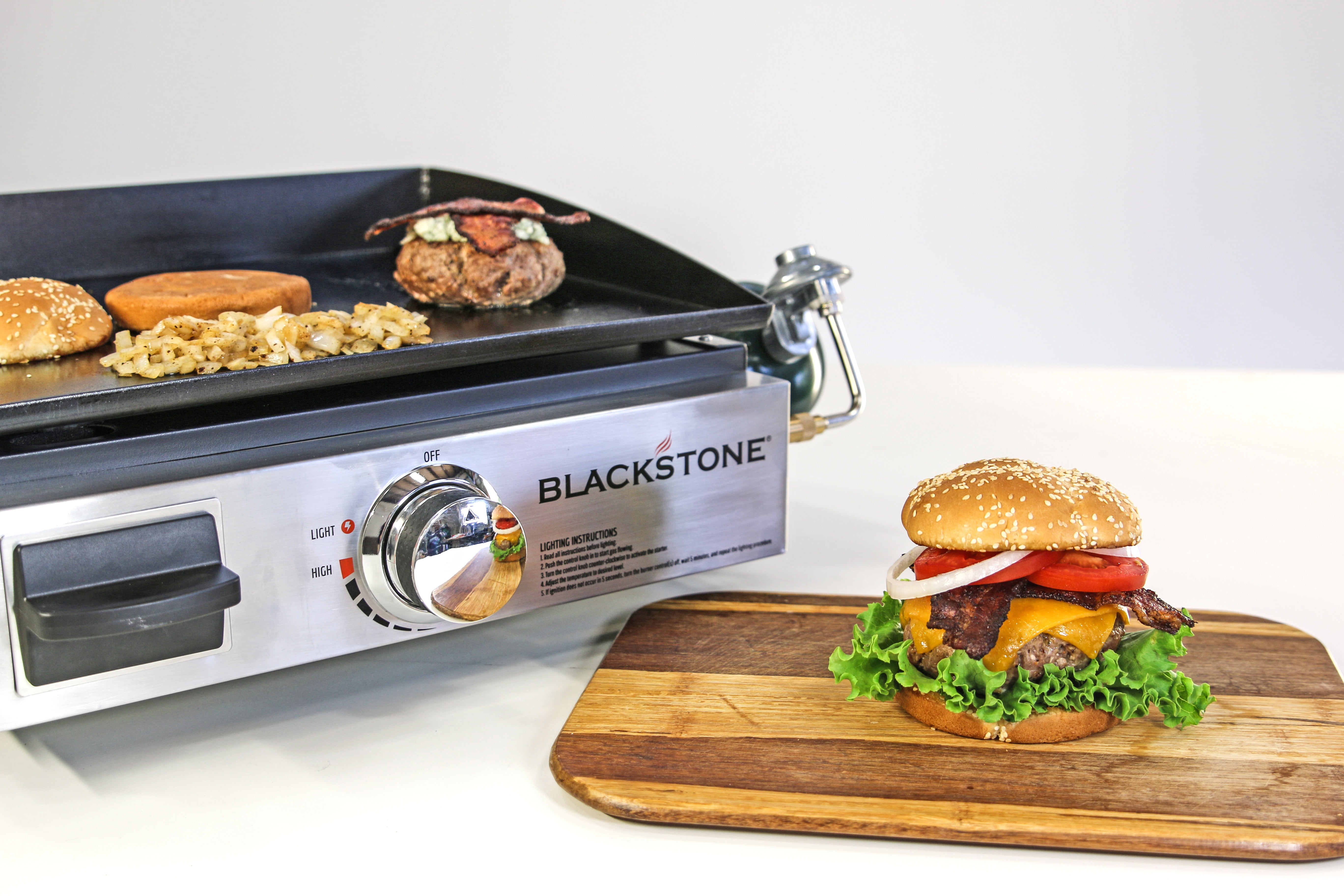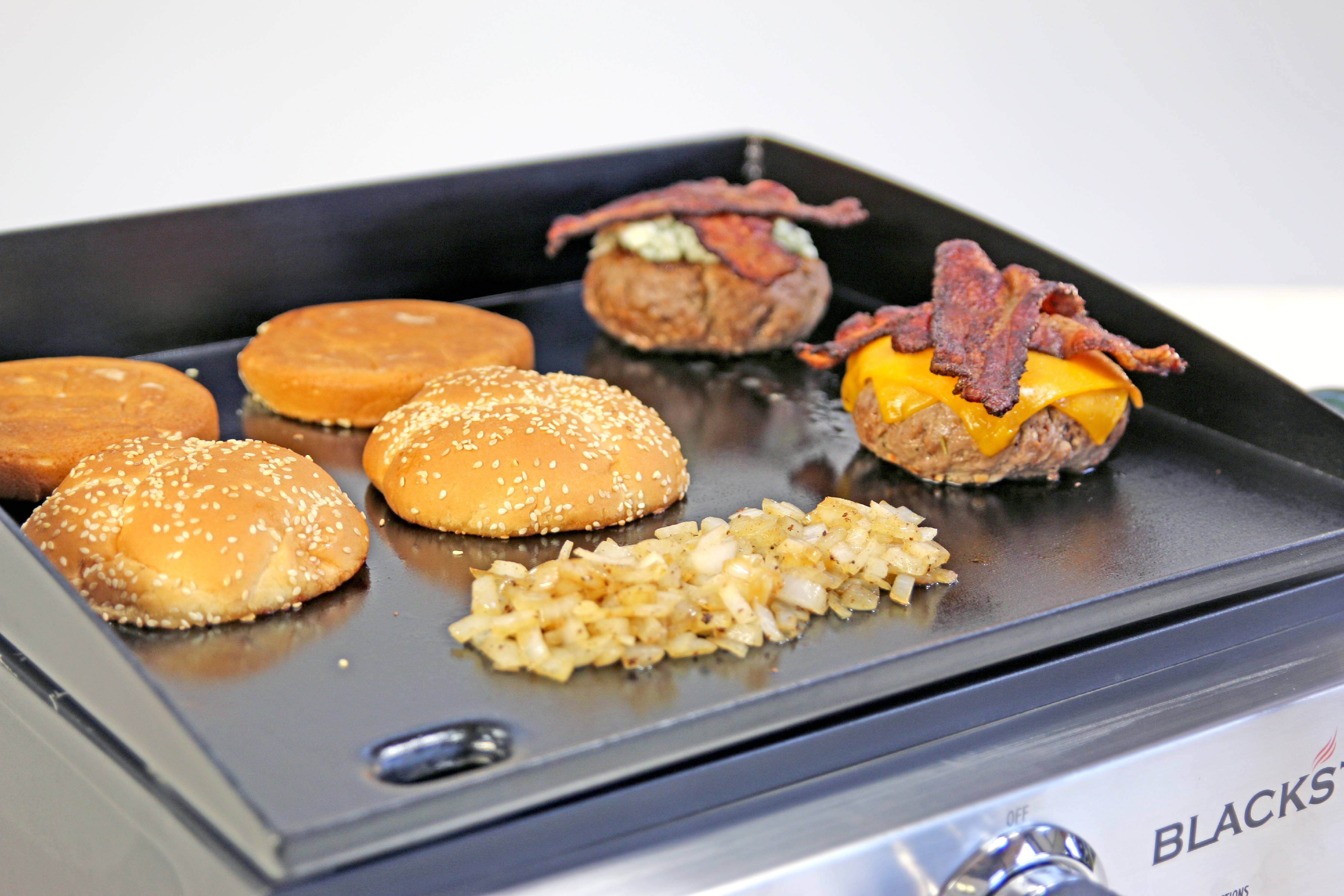 Blackstone 17″ Table Top Griddle: Measuring 268 sq in, the Blackstone 17″ Table Top Griddle provides plenty of space to cook multiple food items. Easy assembly, with piezoelectric ignition Griddle top is easily removable and flips over for easy storage Adjustable-height feet Integrated grease tray Stainless steel “H” style burners for a long life Heavy-duty, cold-rolled steel cooking surface 12,000 BTUs 268 square inches Blackstone table top griddle is highly portable