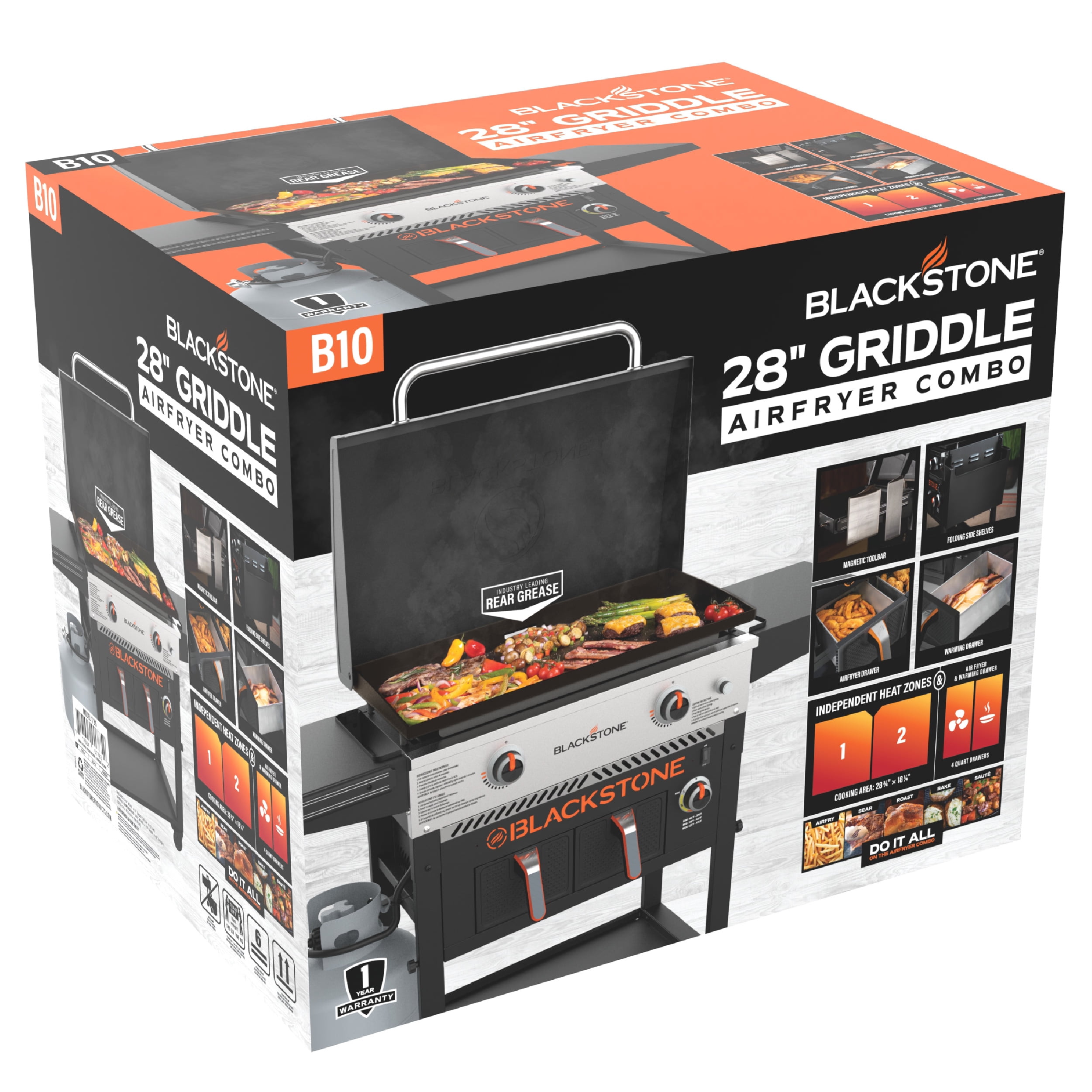 Blackstone 28″ Propane Griddle with Electric Air Fryer 2 independently controlled cooking zones with a combined 34000 BTUs Airfryer drawer to roast, bake, and fry 4 industrial strength wheels 524-square-inch cooktop surface Rolled steel griddle top Stainless steel H-style burners Assembled dimensions: 60″ L x 27″ W x 42″ H Warming drawer to keep food ready to serve Rear grease management system Magnetic tool bar for easy access Side shelf hooks for griddle tools 1-Year Limited Warranty Customer Service: +1 (435) 252-3030 Ext. 1 Model #1785