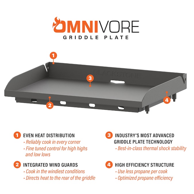 - Patented Omnivore griddle plate with built in wind guards is designed and tested to recover faster, prevent warping, and use less fuel to maintain high heat