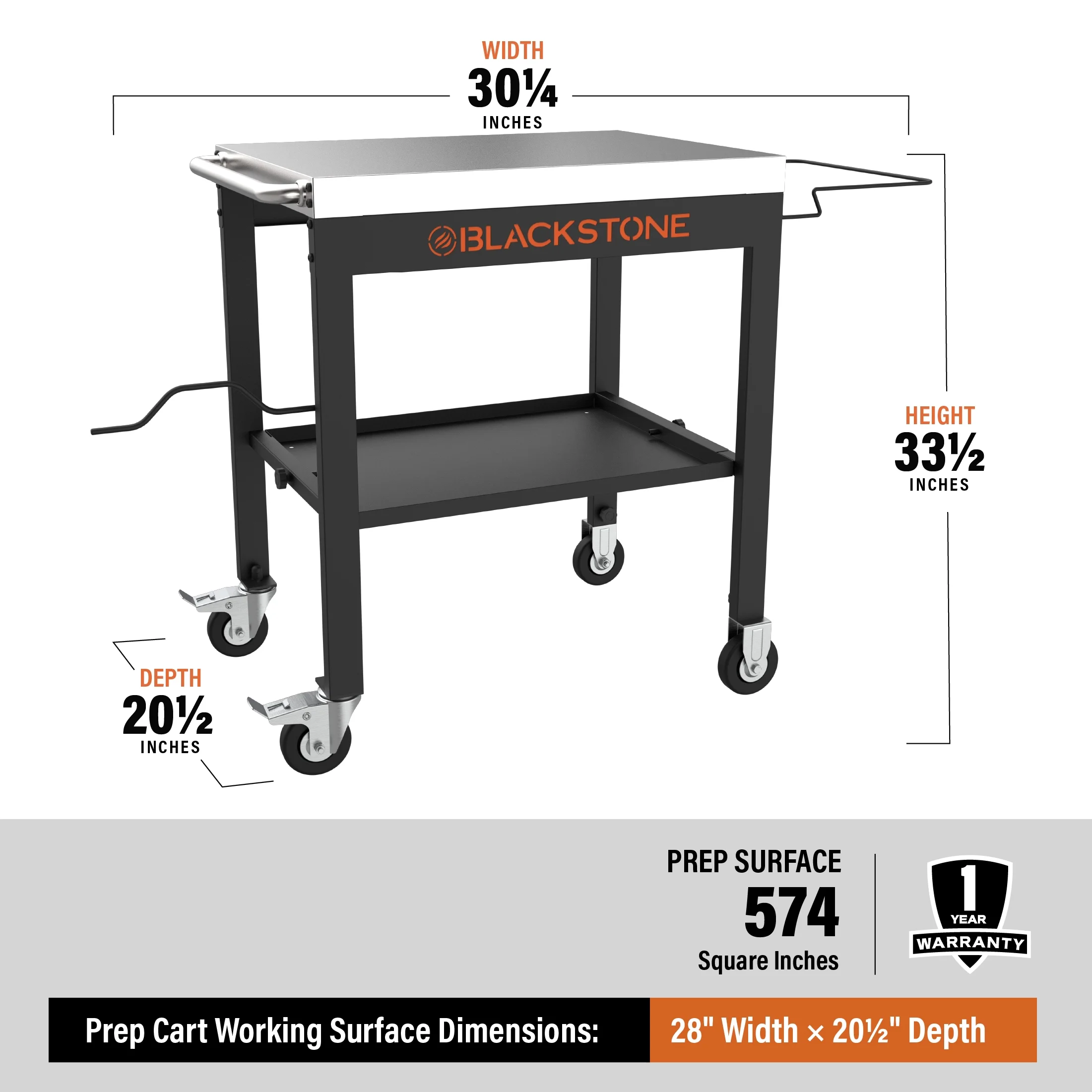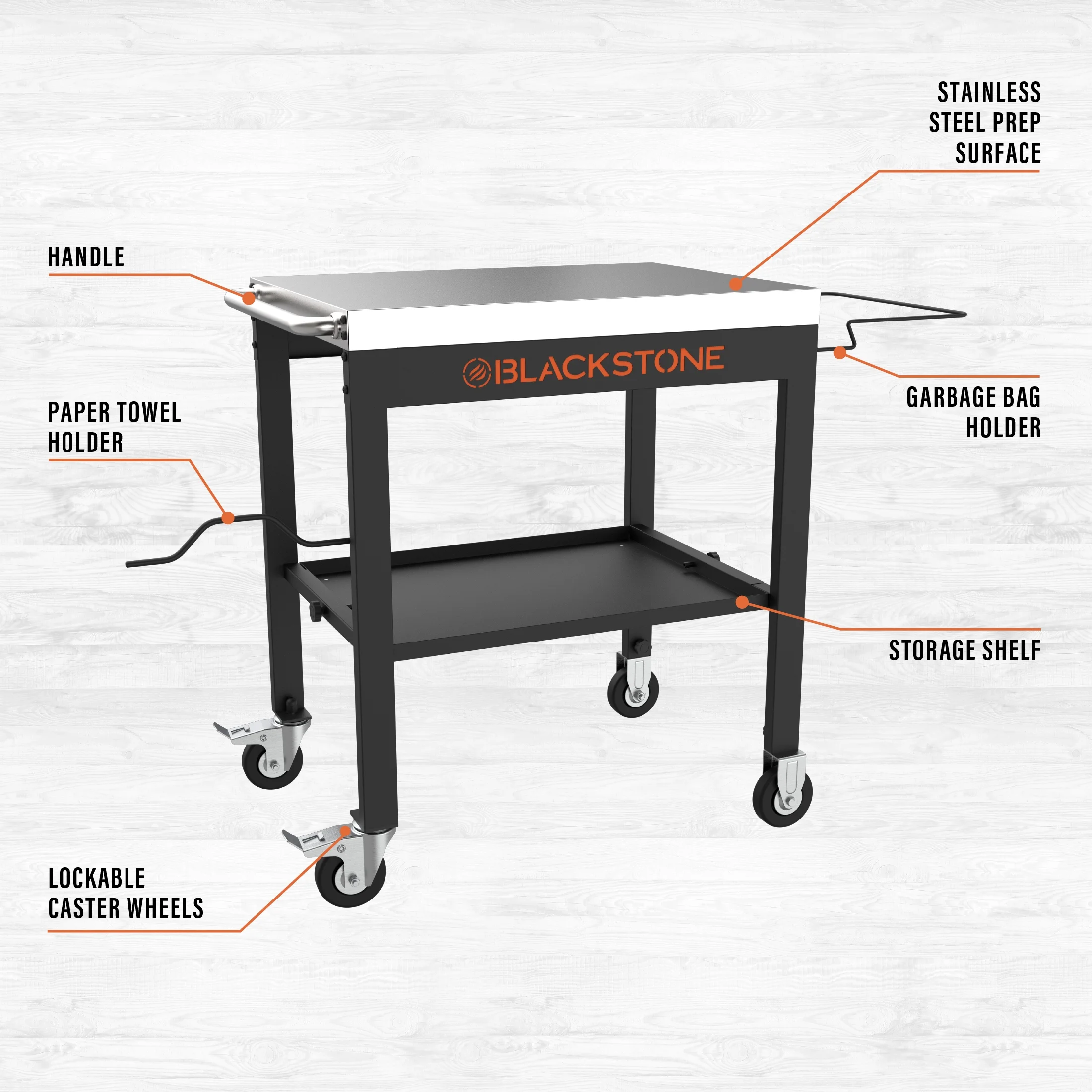 Blackstone 28″ Steel Prep and Serve Cart with Stainless Steel Top 28″ by 20.4″ top surface Garbage sack holder Paper towel holder Large, open storage shelf Sturdy steel structure with stainless steel top 4 wheels, including 2 caster wheels Have additional food prep space for your outdoor kitchen Give the gift of griddling gear this Holiday Season Model #2171