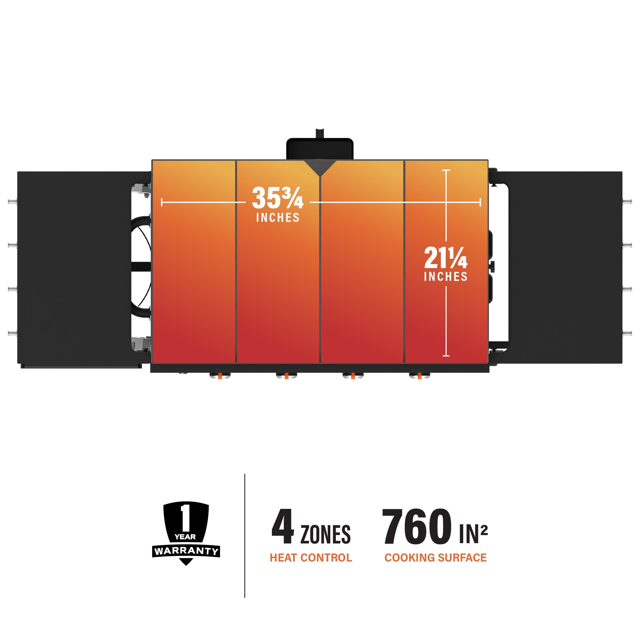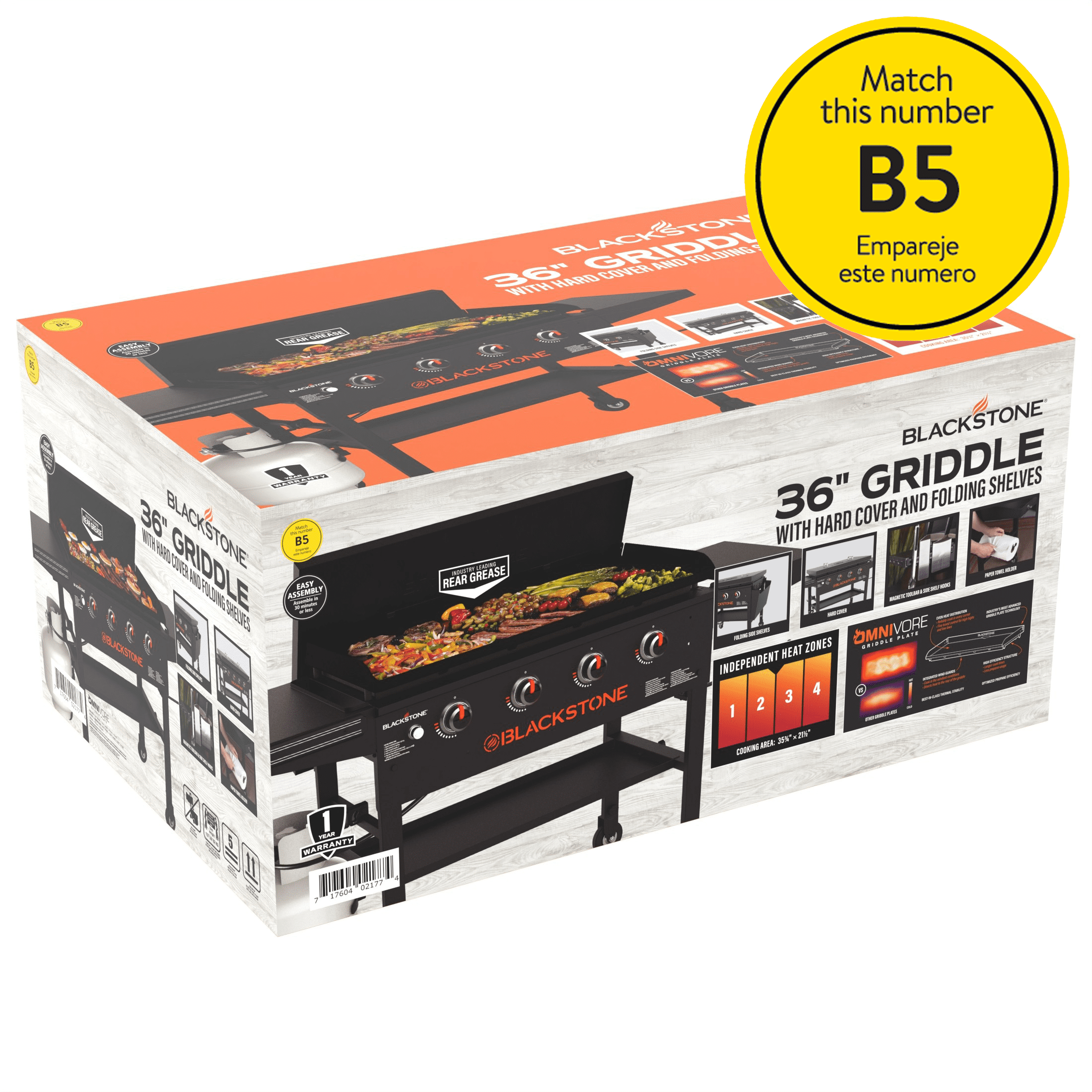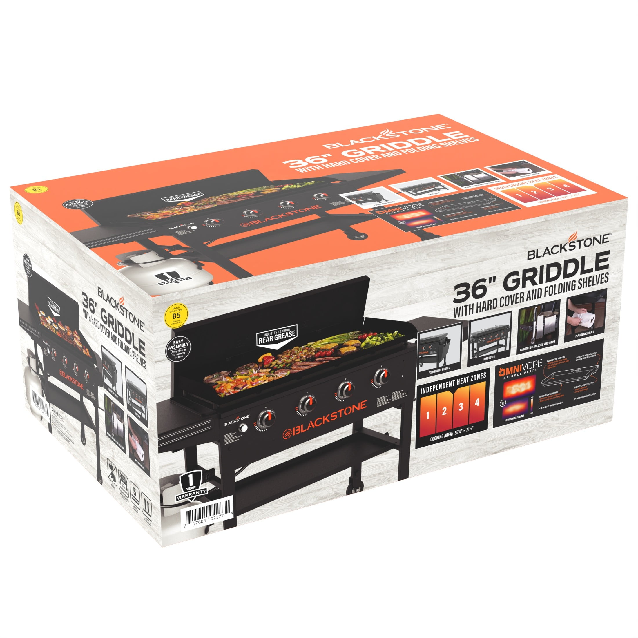 Blackstone 4-Burner 36″ Griddle Cooking Station with Hard Cover Omnivore griddle plate technology provides better thermal shock stability, more even heat distribution, optimized propane efficiency, and includes built-in wind guards Two side shelves Convenient paper towel holder Four industrial strength wheels Side shelf hooks for griddle tools Rear grease management system Rolled steel griddle top Magnetic tool bar for easy access 768-square-inch cooktop surface Assembled dimensions: 66.5” L x 26.25” W x 38.39” H 38,000 BTUs Four independently controlled cooking zones NOTE: NOT compatible with the current Blackstone natural gas conversion kit. Stainless steel tube burners Model #2177