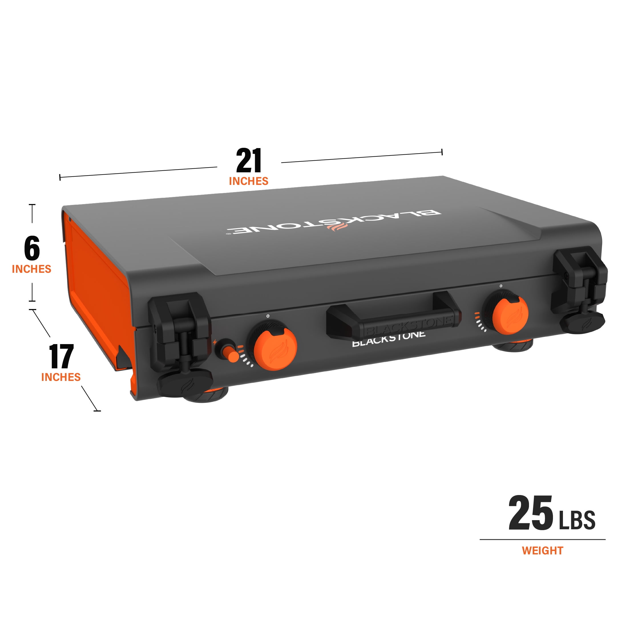 Blackstone Adventure Ready 14” Propane Camping Griddle with Side Burner 168 sq. in. griddle cooking surface and side burner with a combined 14,400 BTUs 12” x 14” griddle top with a ceramic titanium coating for easier cleanup Compact design with carry handle for portability Stow and go rear grease cup for easier transportation and storage Protective griddle top cover with t-latches to keep griddle cover in place when traveling or not in use Blackstone-patented rear grease management system Adjustable leveling feet to keep griddle surface more even on different terrain Customer Service: +1 (435) 252-3030 Ext. 1 Model #2250