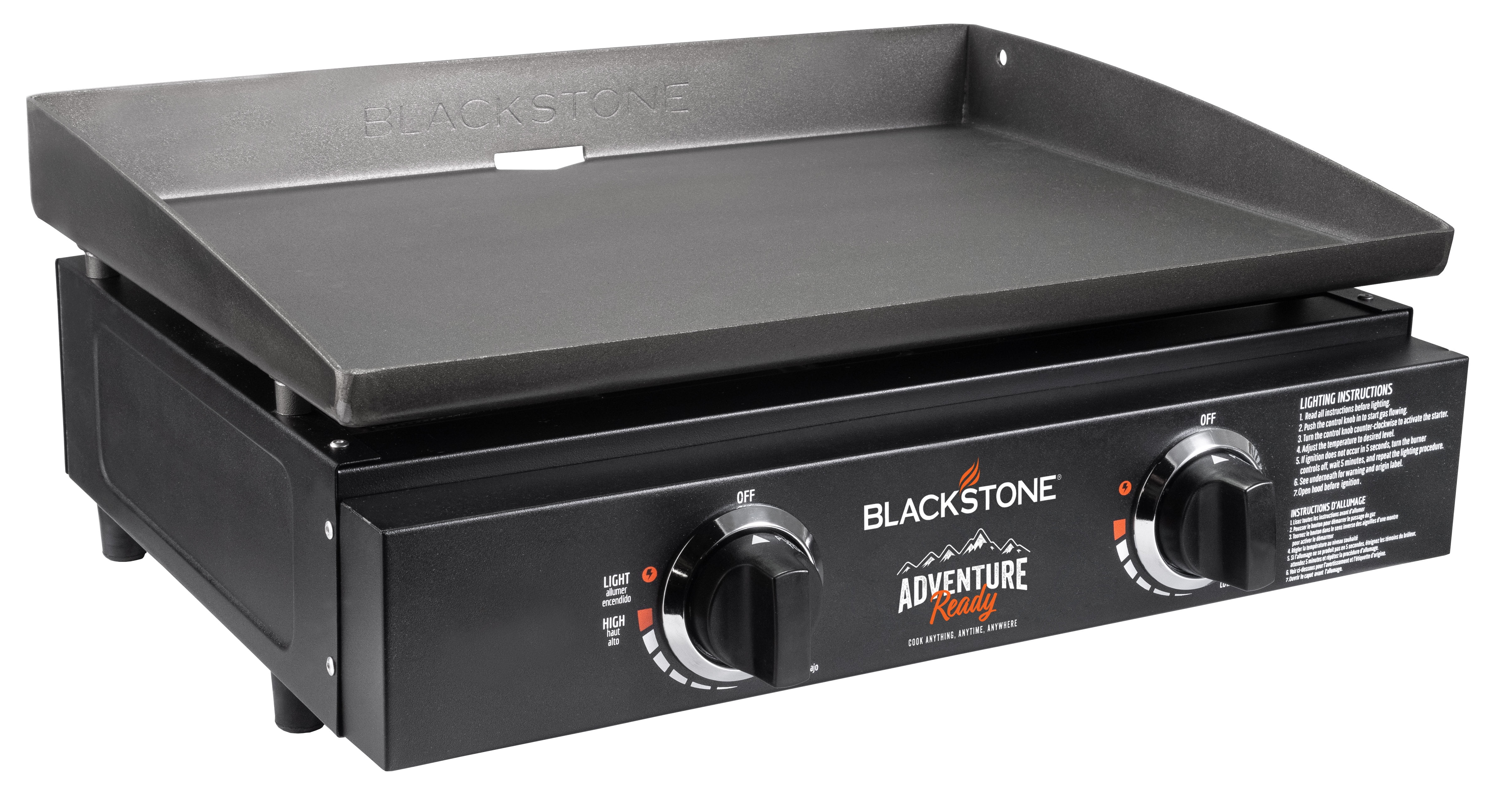 Blackstone 22″ Table Top Griddle with Hood, Legs and Bulk Adapter Hose: 43.6″ L x 22.5″ W x 39.7″ H; 64.5 lbs The 22″ griddle is quick and easy to clean, taking the hassle out of outdoor cooking 330 sq in of cold-rolled cooking surface with dual ‘H’ burners that produce a total of 24,000 BTUs for fast and even cooking Has a unique rear grease management system for easy cleaning while cooking Portable and easy to set up and take down Also includes a bulk adapter hose, so you can use a quick 1-lb tank or a 20-lb tank easily Blackstone griddle is ideal for camping trips, cookouts and more