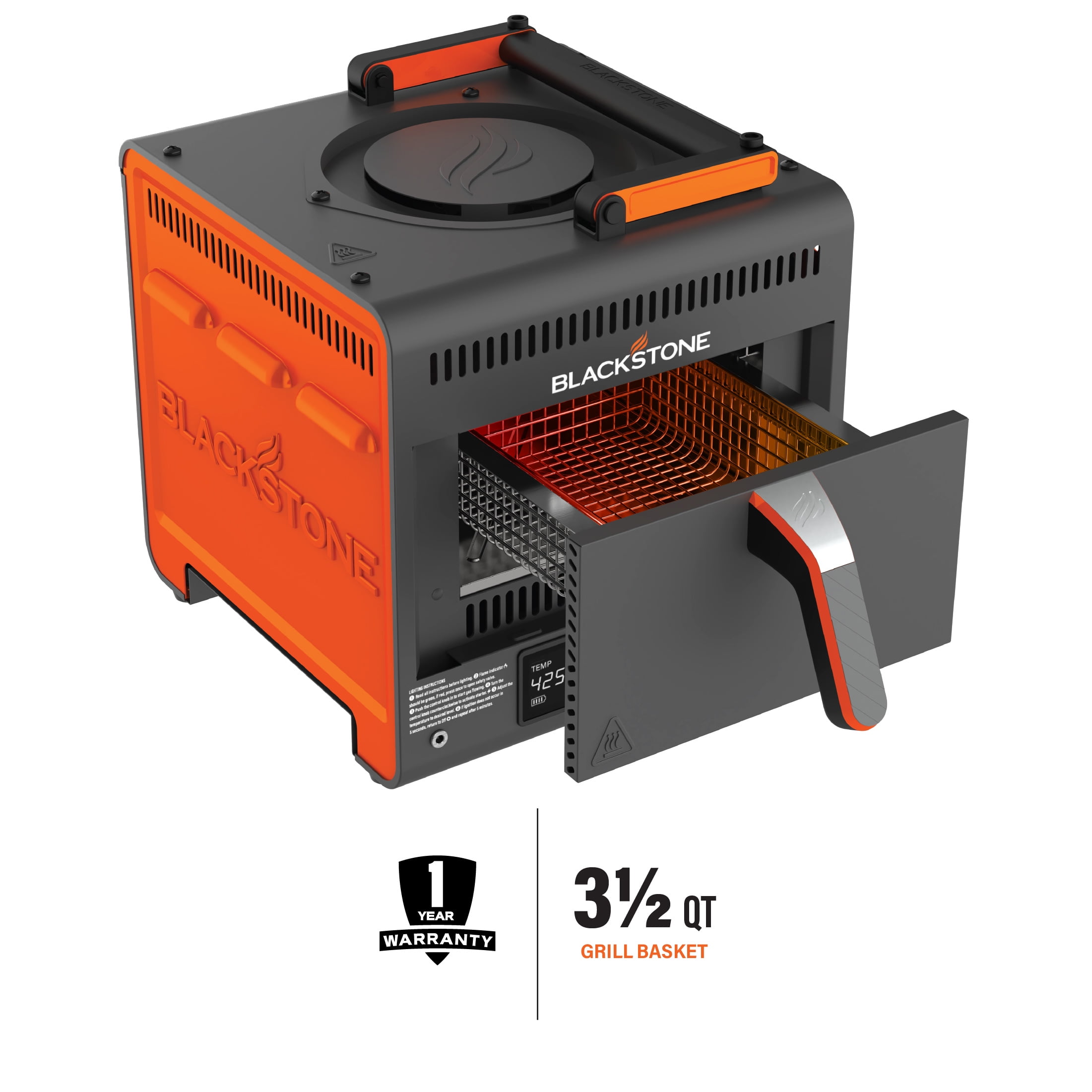 Blackstone Adventure Ready Portable Propane Air Fryer, 4 Quart, Gray & Orange, 18W, 3ft Cord 3.5-quart grill basket for frying fries, chicken nuggets, and more Easy-carry top handle for convenient transportation Digital timer and temperature controls for precise cooking Piezo ignition for quick and easy start-up Runs on propane with a 1 lb. propane tank connector (propane tank not included) Batteries or plug required to operate the electrical digital display and fan Model #2260