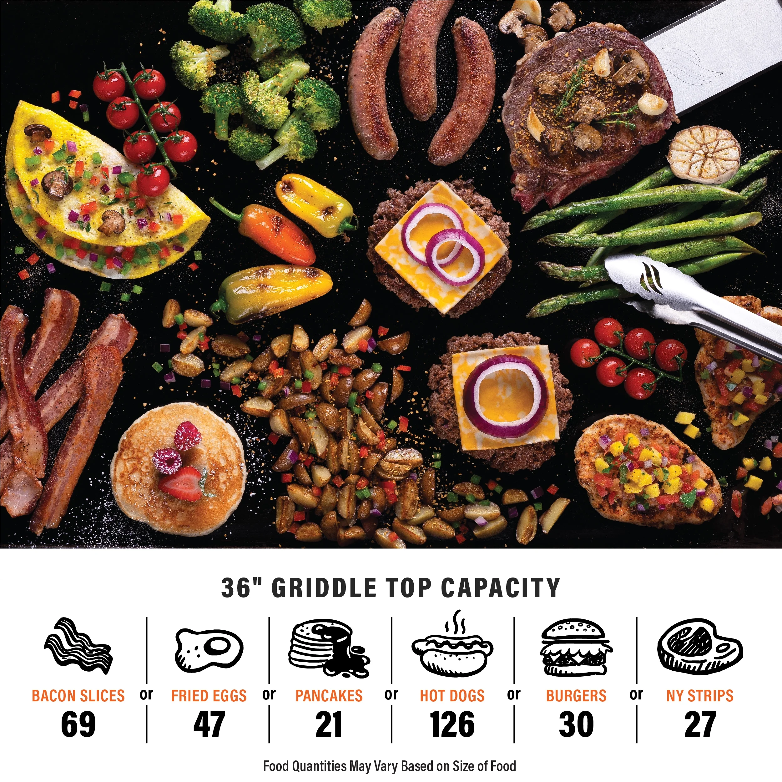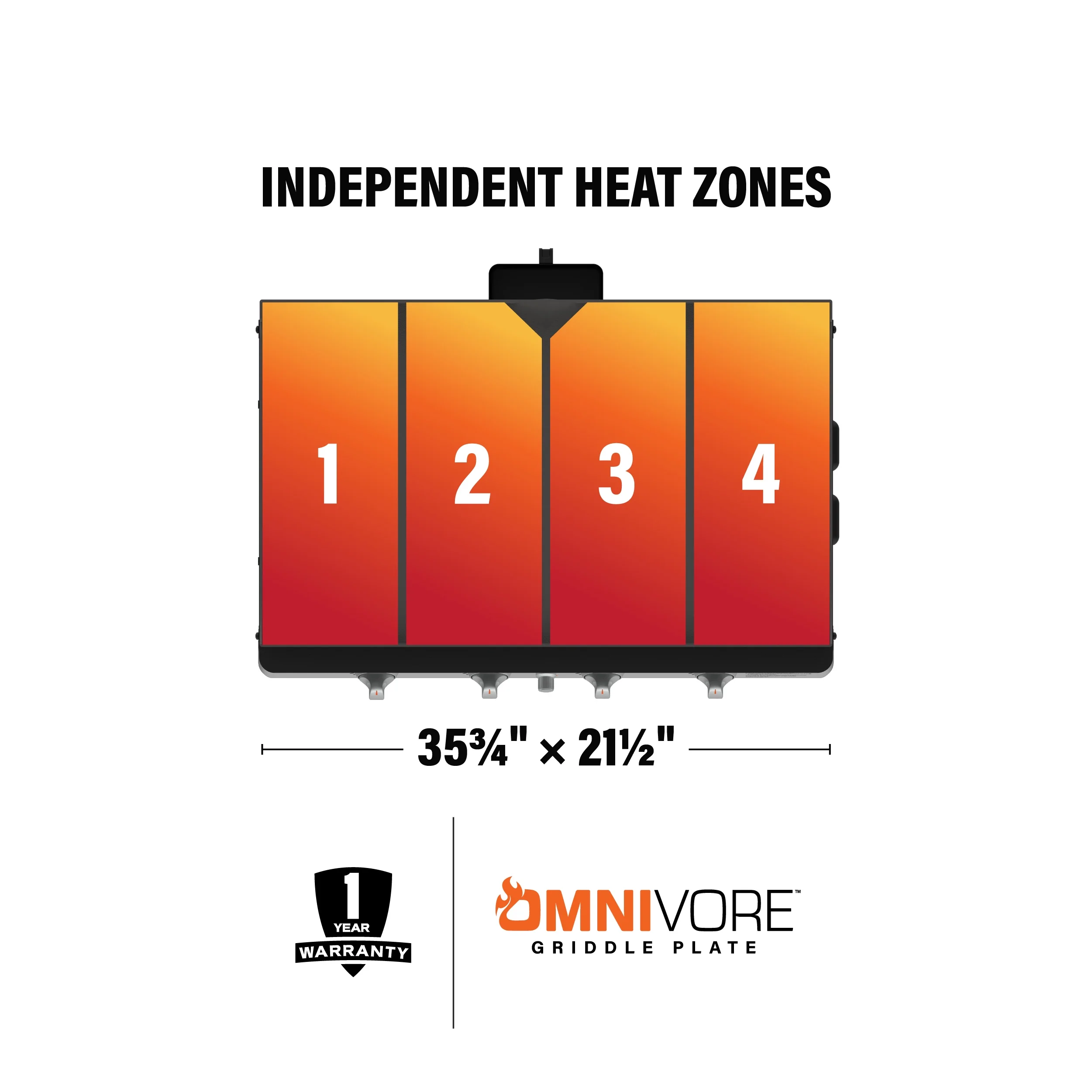 Enhance your outdoor cooking experience with the Blackstone 36” Omnivore Drop-In Griddle. Omnivore Griddle Plate Technology provides this griddle with better heat distribution, faster preheat and recover times, built-in wind guards, and less fuel use per cook. Griddle more efficiently with four independently controlled heat zones. Cook a variety of food simultaneously on the spacious griddle top so you can spend more time with family and friends and less time cooking. Protect your griddle with the integrated hood and enjoy cooking on it for years to come. Whether you are building a custom outdoor kitchen or BBQ island, this drop-in griddle will be the perfect addition to your outdoor kitchen.