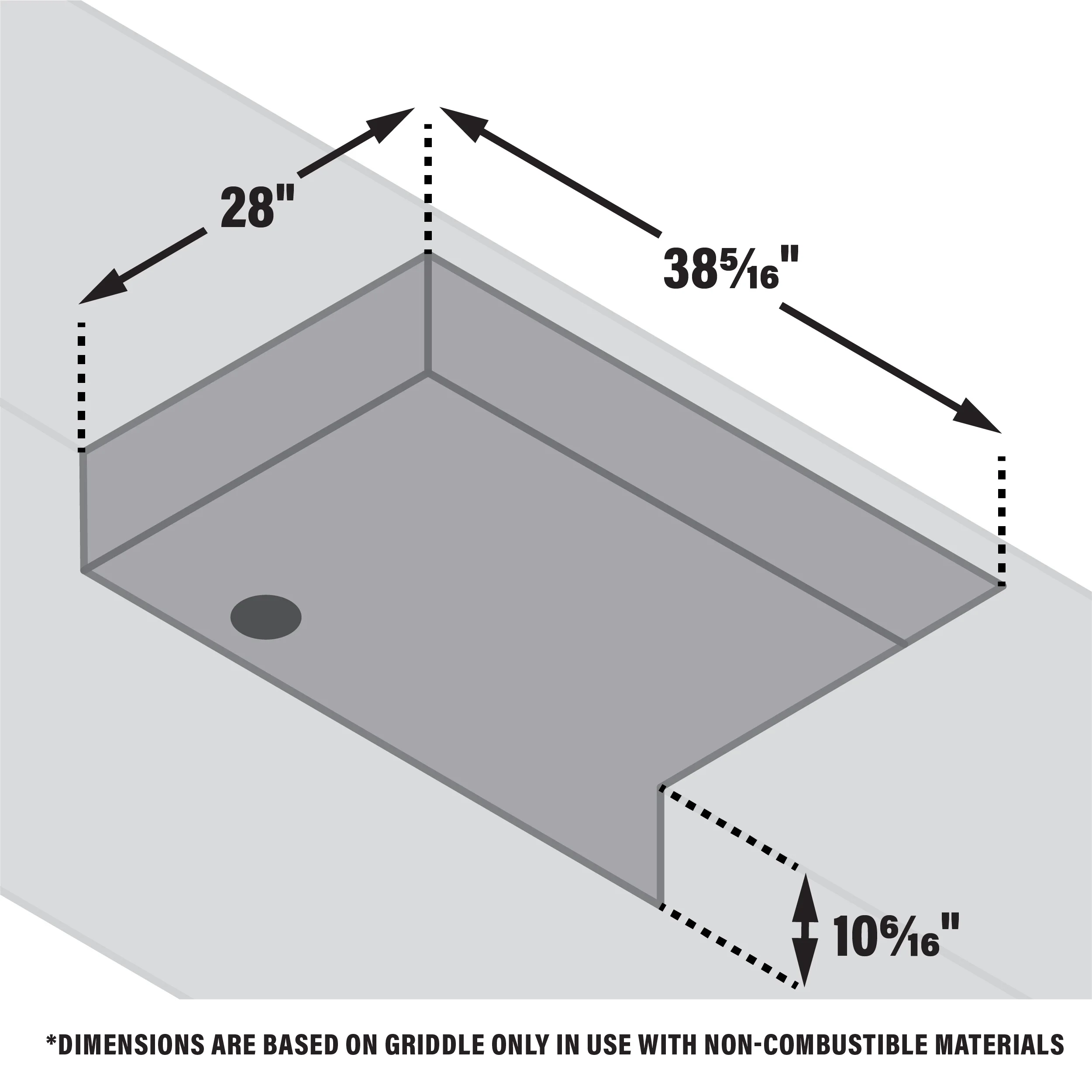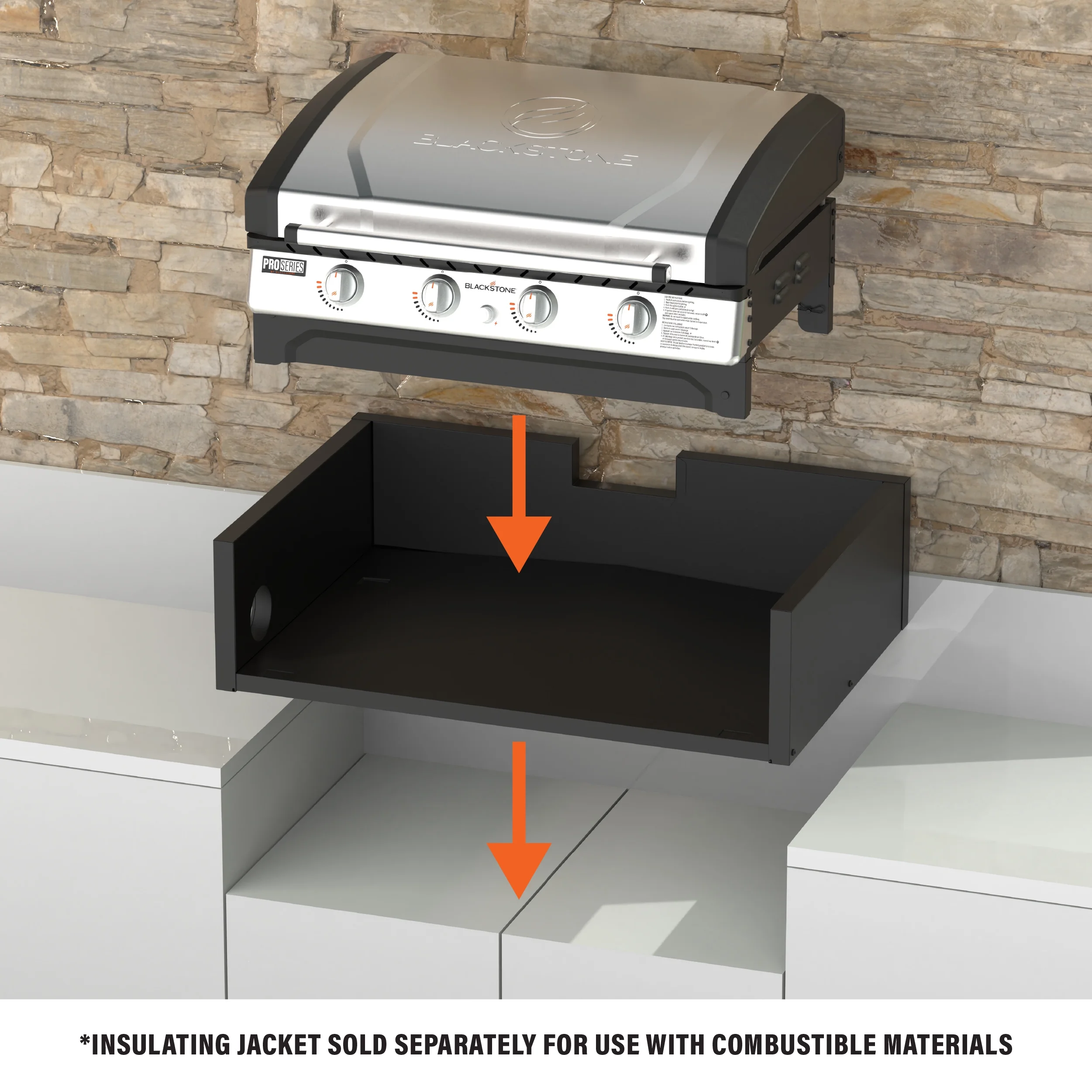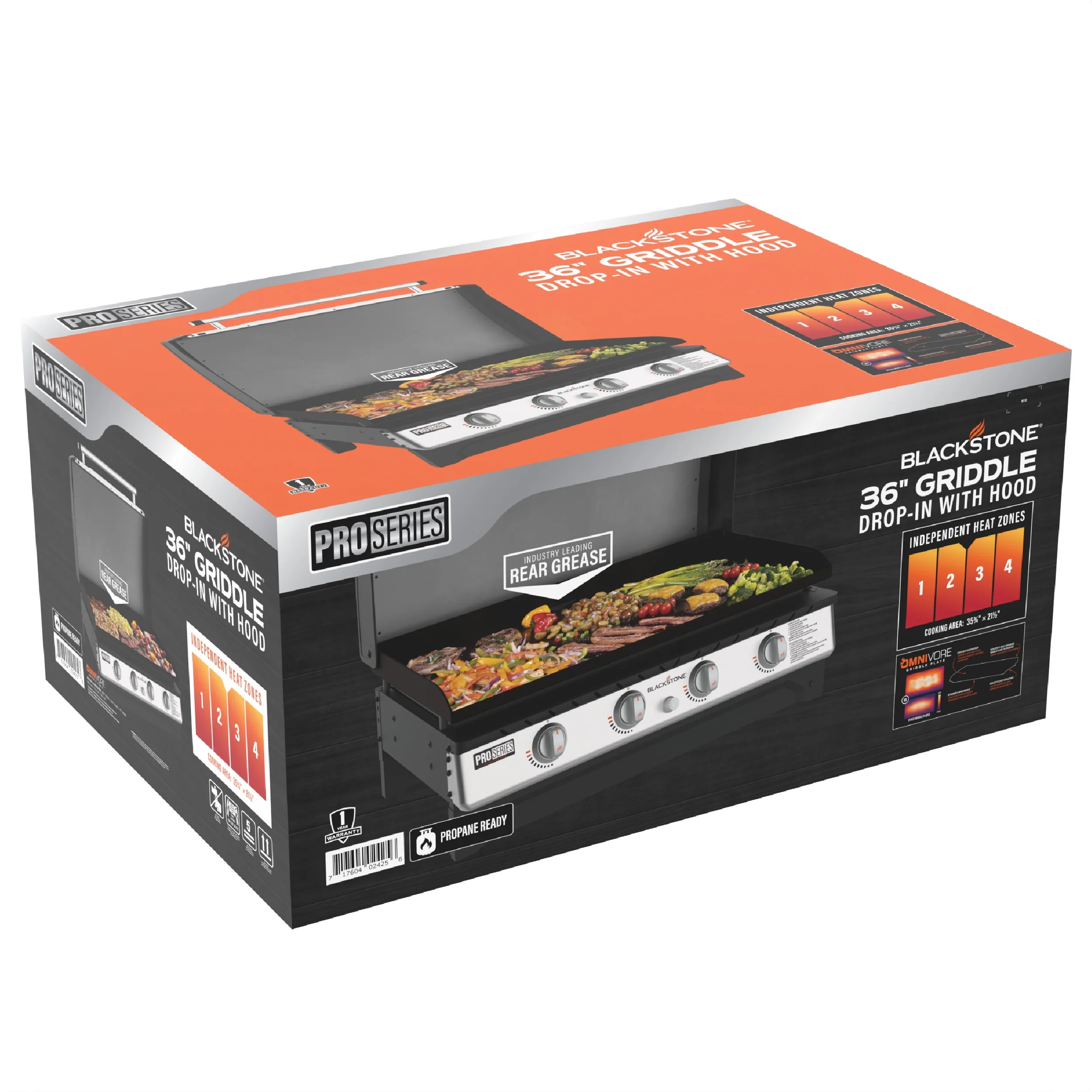 Blackstone Pro Series 4-Burner 36″ Propane Omnivore Drop-in Outdoor Griddle with Hood Drop-in configuration is perfect for building a griddle into your personalized outdoor kitchen Insulating jacket required for drop-in griddle installation in combustible environments (insulating jacket sold separately) Omnivore Griddle Plate is designed with better heat distribution and thermal shock stability, built in wind guards, and less fuel usage per cook Stylish and durable stainless steel construction Built-in hood keeps the griddle top protected and clean between uses 768 square inches of cooking space for cooking large quantities of food Four independently heated burners allow you to cook a few food items at once Electric push-button ignition provides convenient and reliable starting and runs on a single AA battery (not included) 40,000 BTUs – Omni Griddle Plate requires fewer BTUs to produce high heat Model # 2425