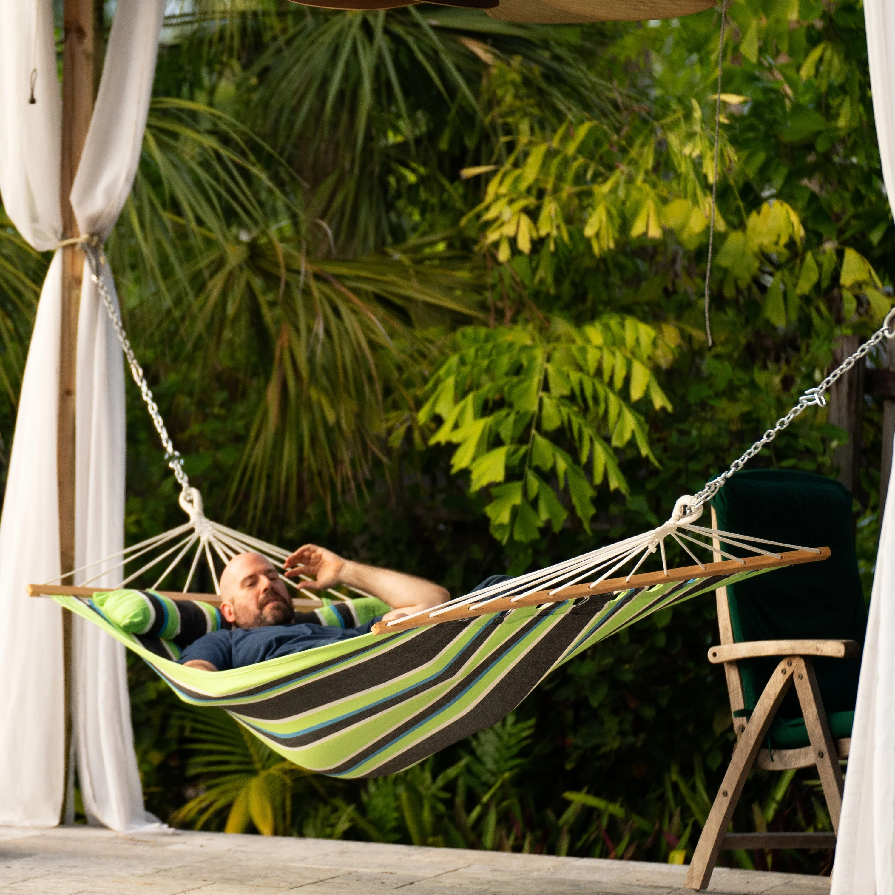 Imagine yourself in a tropical paradise while you relax the day away! This Caribbean Hammock series by Bliss Hammocks features hardwood spreader bars, fun stripe colors, sturdy construction and a matching detachable pillow. The best part of this hammock is the hardwood spreader bars that keep the hammock stretched wide open so it always feels like you are resting on full size bed. This oversized hammock has a bed size of 48″ W x 78″ L with an overall length of 9.5′ (Fits the Bliss Hammocks 10′ Stand). Eco-friendly colorfast polyester/cotton blended fabric provides long lasting vivid colors and makes this hammock perfect for long naps and ultimate relaxation. All Bliss Hammocks ropes are made from strong eco-friendly cotton and the loop ends are reinforced with steel for extra durability in the most strained parts. Hanging hardware includes a set of chains and S hooks that are coated to resist weathering and makes it easy to hang between trees. Or purchase our Adjustable Tree Straps to use anywhere in between different lengths (WM-505 sold separately). Fits our Bliss Hammocks 10′ Stand. 250 lbs. weight capacity and comes with a one year warranty… Find Your Bliss!