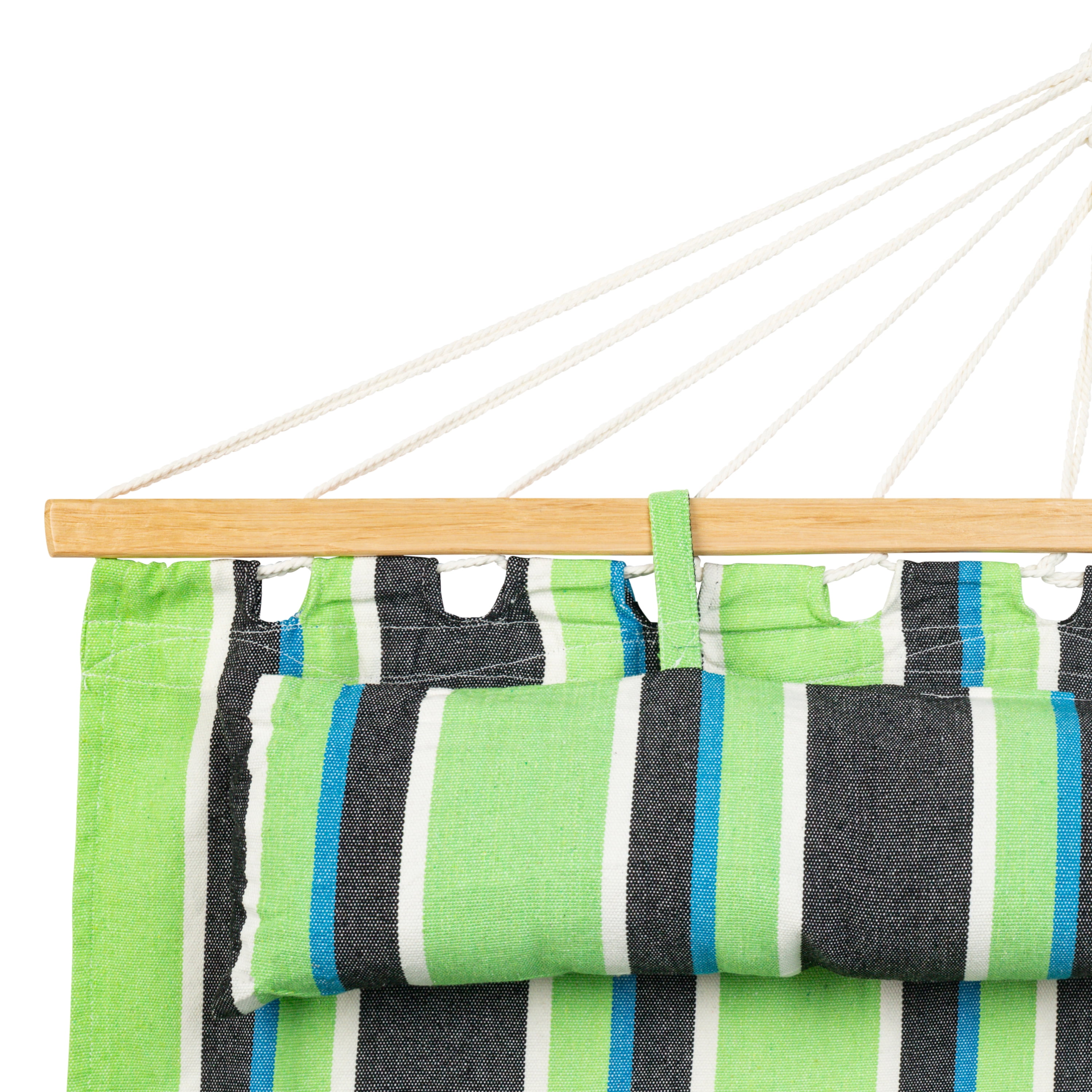 SLEEK & STYLISH: Varnished hardwood spreader bars and 100% hand woven 3-ply 4mm thick, green polyester rope ECO FRIENDLY: An eco-friendly blend of recycled polyester and cotton EXTRA DURABILITY: The thick, hand-woven rope reinforced with steel loops along with the colorfast fabric gives you extra strength and durability INCLUDES: A 40-inch-wide detachable pillow and zinc coated hanging hardware, (2) S Hooks & (2) 12″ Chains, come included with your comfortable hammock DIMENSIONS: Hammock Dimensions: 80″ long X 48″ wide bed size / Overall Length: 9′ 3″ 265 lbs. Weight capacity