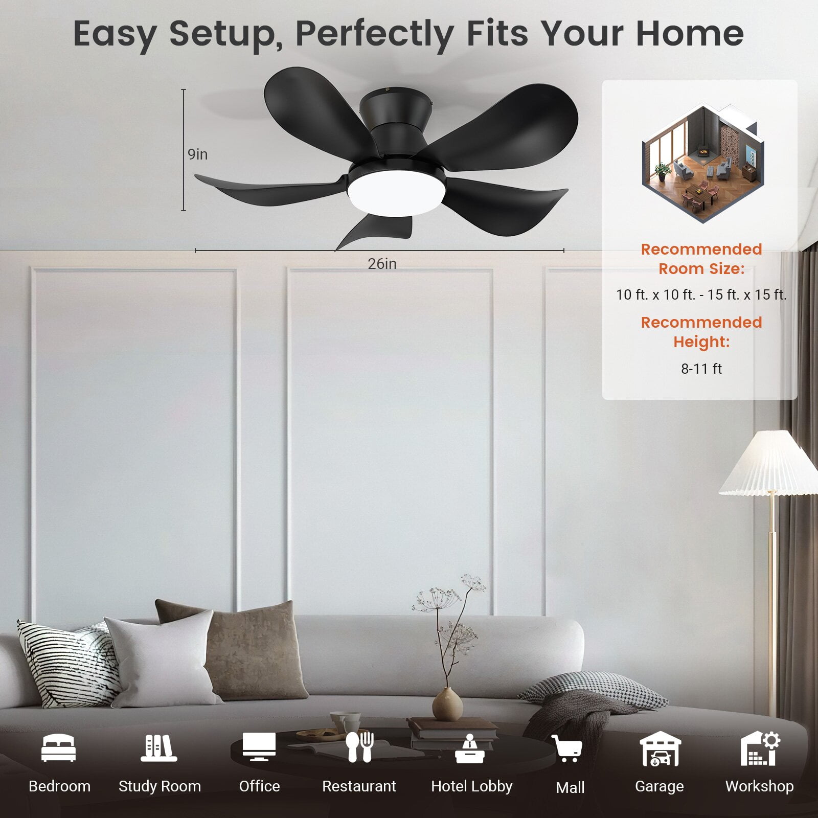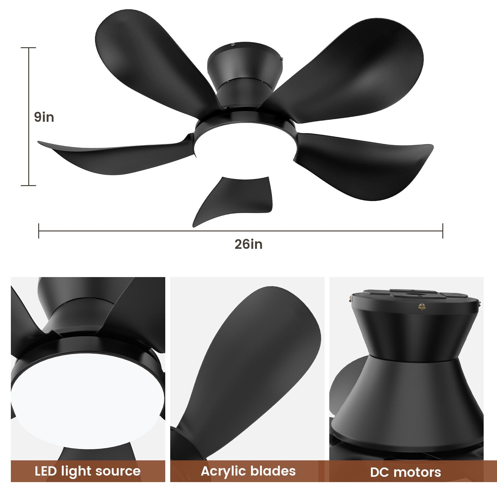 ▶ KEY FEATURES: Small Ceiling Fan with Light The BLITZWILL 5 fan blades ceiling fan is 26 inches in diameter, and the propeller design of the fan blades allows it to generate a larger and wider airflow. The simple and fashionable shape can be applied to various spaces, such as bedroom, dining room, study room, bars, library and so on. Reversible DC Motors By the remote control, you can switch the wind direction of the ceiling fan from the downdraft in summer to the updraft in winter, thus recovering the heat lost by the ceiling and distributing the heat evenly throughout the room. Compared with traditional AC motors, it is more energy efficient, more silent, and the noise level is less than 35 dB. Remote Control & APP control The remote control comes with almost all the functions you need, including 6-speed wind speed, 3-color temperature and endless dimming, one-click on night light mode, timing off, separate off lights or fans, and so on. You can also scan the QR code on the manual, download the APP and pair it to control the fan light from your phone. Easily adapt to any scene needs, the ideal replacement for traditional fans or chandeliers. High Quality This ceiling fan is made of high-quality ABS material and metal, which is strong and durable. The fan motor adopts pure copper motor, which has the characteristics of strong power and low noise. Installation Notes The installation of this ceiling fan is very simple, and we have detailed installation instructions and installation videos, providing users with a cost-effective installation method that can be easily installed by only one person. If you have any problems, please contact us. ▶ SPECIFICATIONS: Brand: BLITZWILL Style: Modern Product Dimensions: 26″D x 9″H Material: Metal Shell + ABS Fan Blade + Pure Copper Motor Lamp type: 2834LED (56 lamp beads: 28 pure white + 28 warm white) Lighting power: 25-60W Voltage: 110-265V DC Motor power: 24W Memory Function: support Motor Reversal: Support Noise: Less Than 35db Air Volume: 1.41m/s Number of Blades: 5 blade Remote Control distance: 8-20m ▶ PACKAGE LIST: 1 x Ceiling fan with light 1 x Remote control(battery not included) 1 x English manual 1 x Screw accessories kit
