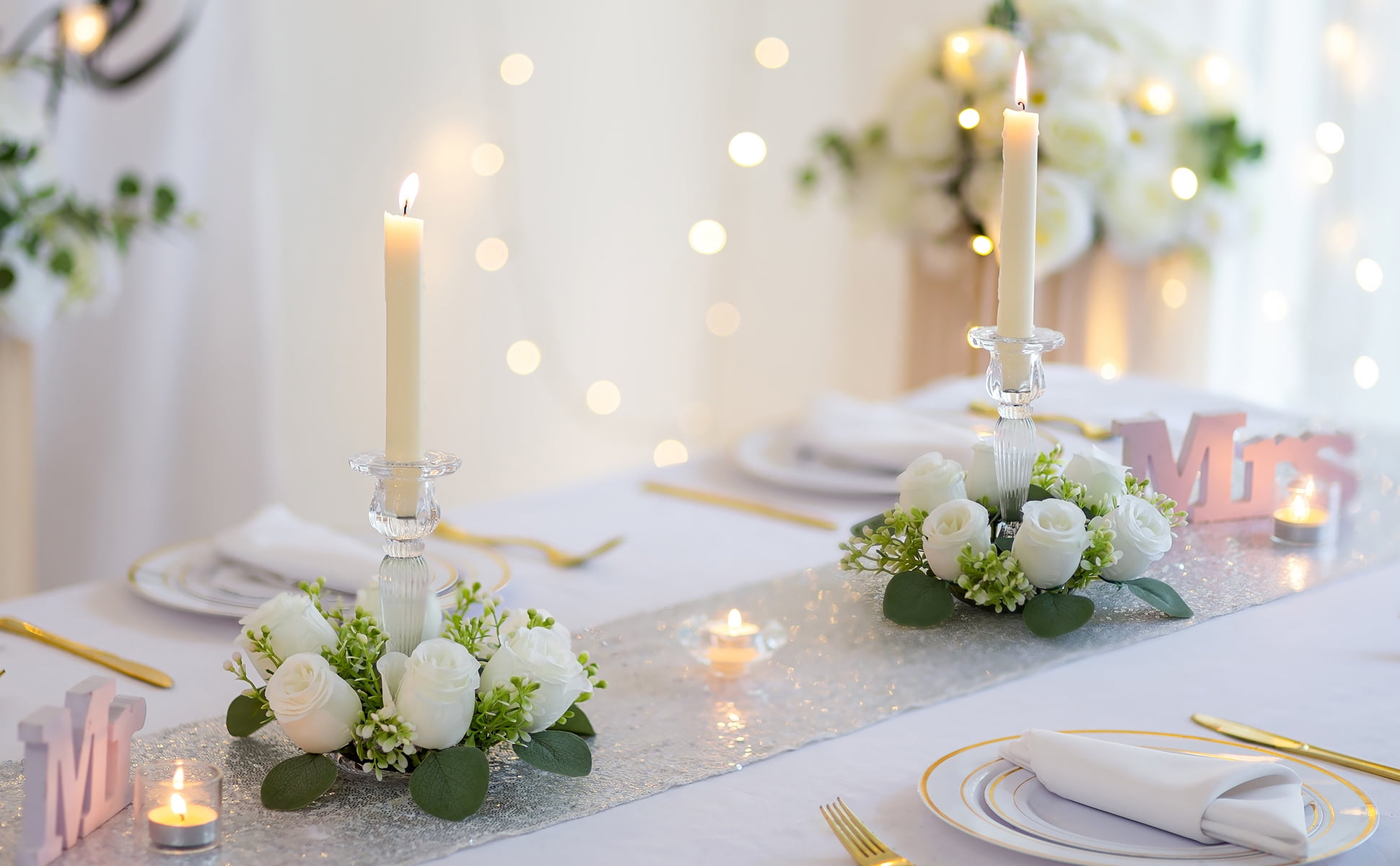 Blosmon Small Candle Rings Wreaths 10 Pcs 8.66″ White Artificial Flowers Wedding Centerpiece for Table Spring Summer Fake Rose Wreath for Front Door