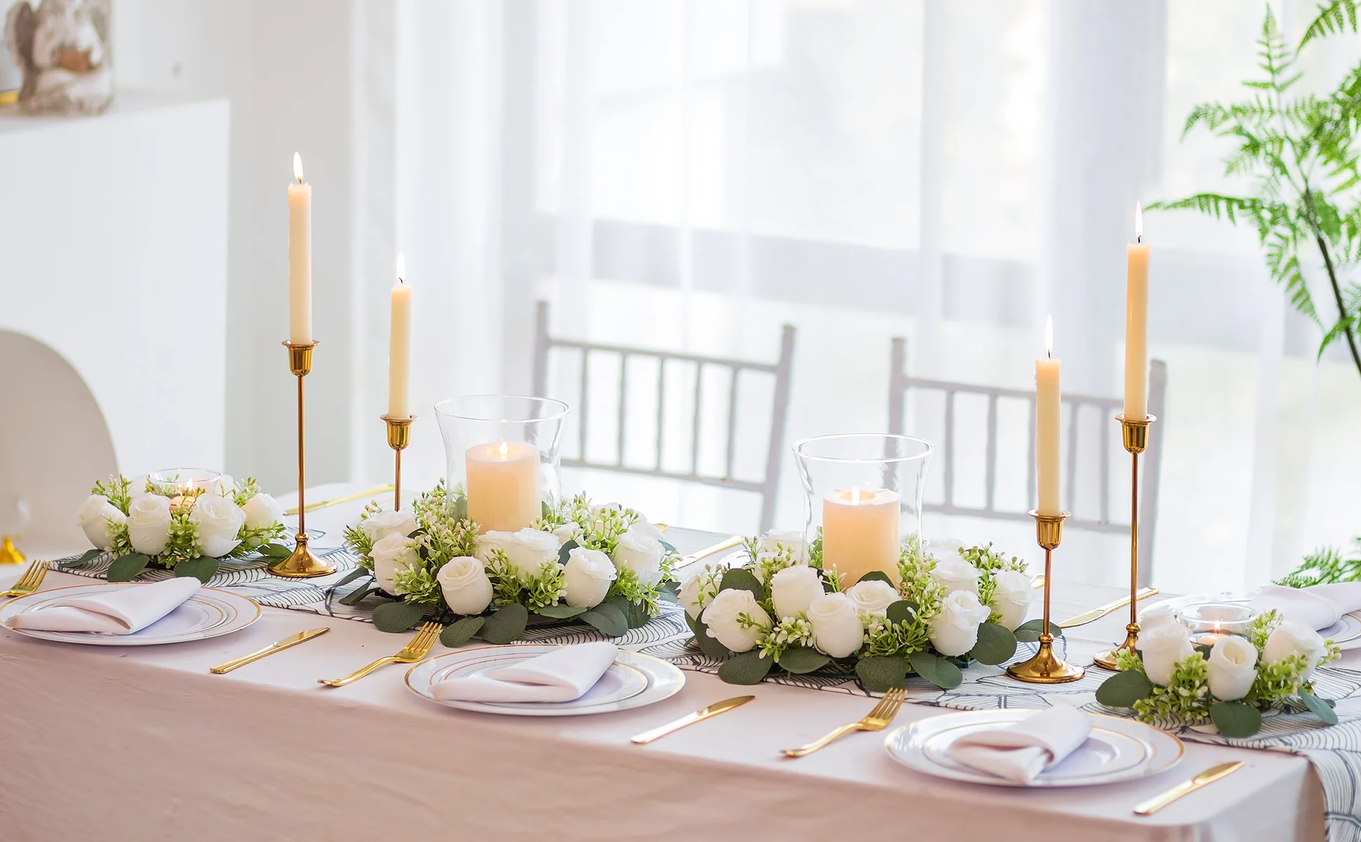 An elegant artificial rose candle wreath that remains beautiful and romantic throughout the seasons. This artificial rose candelabra wreath is the perfect way to decorate the centrepiece of your wedding, bringing the ultimate in romance and beauty to every guest. It can also be used as a dining room, kitchen or table centrepiece. It can be used in different ways for different seasons, and when candelabras are not needed, it can be used to decorate front doors, windows, etc. A great value for money with multiple uses in one product.