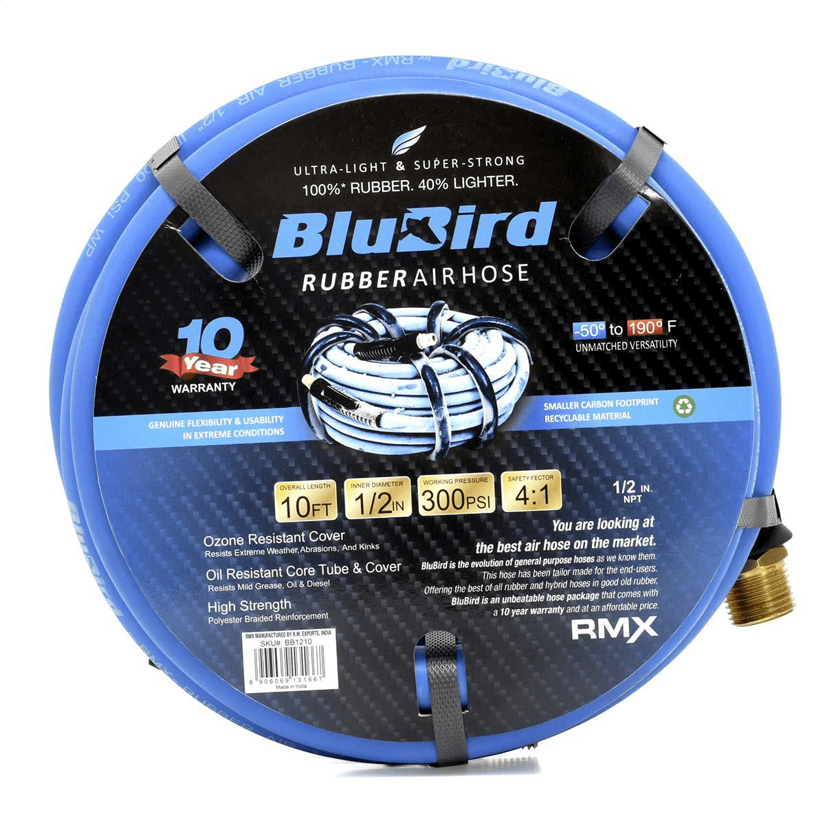 LIGHTEST, STRONGEST, MOST FLEXIBLE: BluBird’s 100% rubber air hose is 40% lighter than standard industry hoses and as light a hybrid or PVC hose. It is stronger than the best of rubber hoses. EASE OF USE: Lays flat, does not kink under pressure, get sticky or dirty like plastic and hybrid hoses. Much easier to clean. UNMATCHED COLD WEATHER FLEXIBILITY: Remains as flexible at -50F as the best hybrids at 0F. Perfectly usable. Doesn’t become a noodle up until 190F. FITTING & DESIGN: Blubird’s Air hoses come with brass end fittings. Better against rust than steel and stronger than aluminum. HIGH STRENGTH AND PRESSURE: Polyester gives 300PSI working pressure from -50F to 190F with a burst pressure of 1200PSI (Most �300PSI� hybrids have a 900PSI burst).