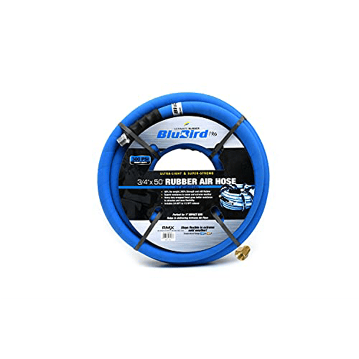 LIGHTEST, STRONGEST, MOST FLEXIBLE: BluBird’s 100% rubber air hose is 40% lighter than standard industry hoses and as light a hybrid or PVC hose. It is stronger than the best of rubber hoses. EASE OF USE: Lays flat, does not kink under pressure, get sticky or dirty like plastic and hybrid hoses. Much easier to clean. UNMATCHED COLD WEATHER FLEXIBILITY: Remains as flexible at -50F as the best hybrids at 0F. Perfectly usable. Doesn’t become a noodle up until 190F. FITTING & DESIGN: Blubird’s Air hoses come with brass end fittings. Better against rust than steel and stronger than aluminum. HIGH STRENGTH AND PRESSURE: Polyester gives 300PSI working pressure from -50F to 190F with a burst pressure of 1200PSI (Most �300PSI� hybrids have a 900PSI burst).