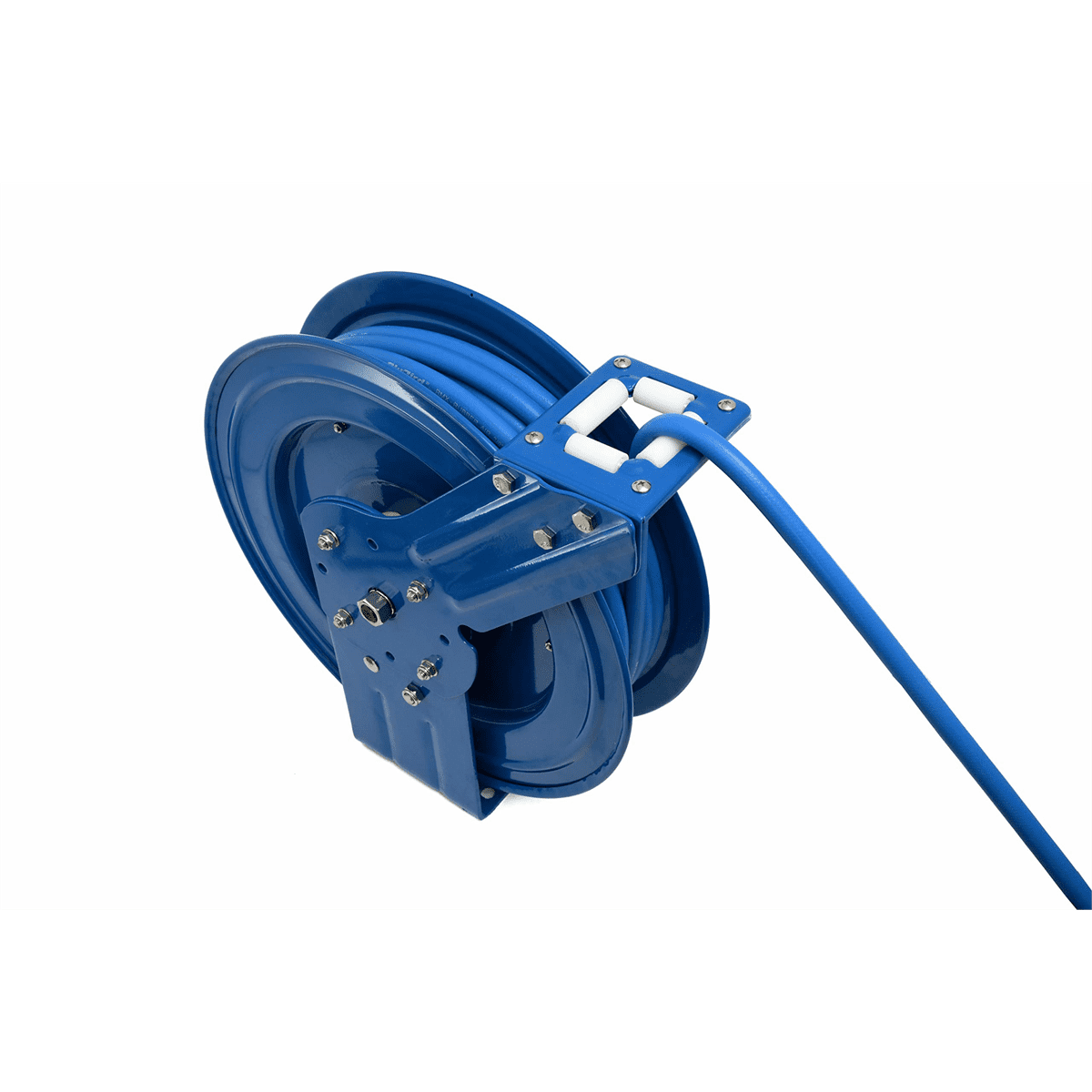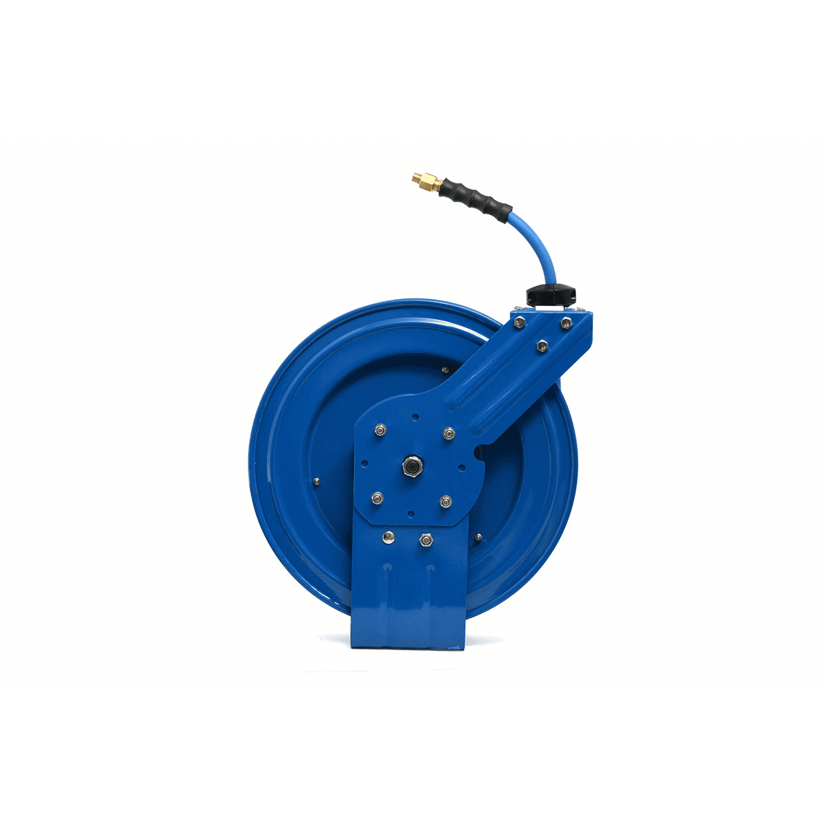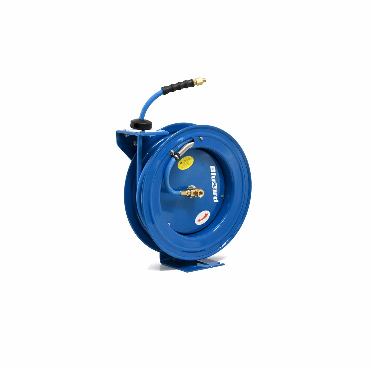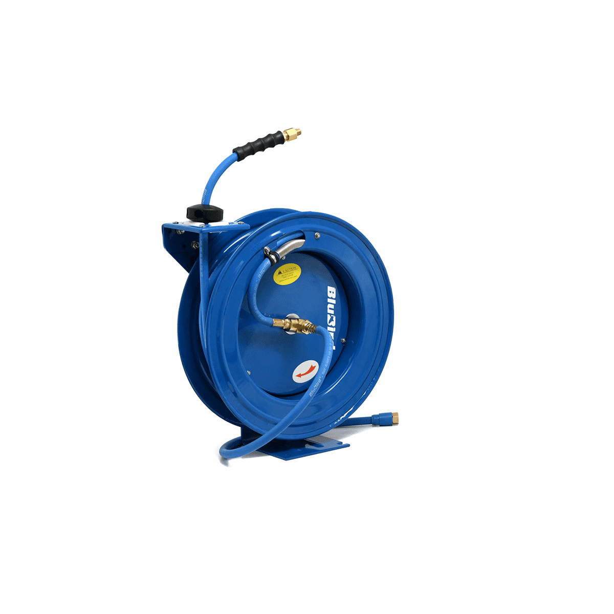 SMOOTH GEARING SYSTEM: BluBird’s metal retractable hose reel has a smooth auto-rewind 12 point locking ratchet gear system allowing you to lock at various lengths. LIGHTEST, STRONGEST, MOST FLEXIBLE: BluBird’s 100% rubber air hose is 40% lighter than standard industry hoses and as light a hybrid or PVC hose. It is stronger than the best of rubber hoses. HEAVY DUTY: Heavy duty 18ga. steel construction with 50% wider spring inside and rubber gasket for extended life. NEVER COIL YOUR HOSE AGAIN: Fully retractable, four rollers to reduce hose wear, horizontal or vertical wall mount options, an adjustable guide arm, includes 50 ft 1/2 inch and 3′ lead-in hose. EASE OF USE: Each BluBird hose is ultra light and super strong hose with 4 finger grip bend restrictor for easy of use.