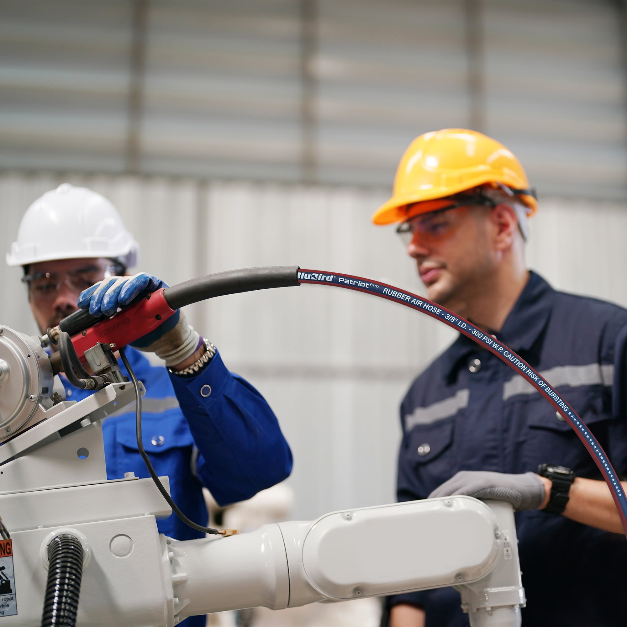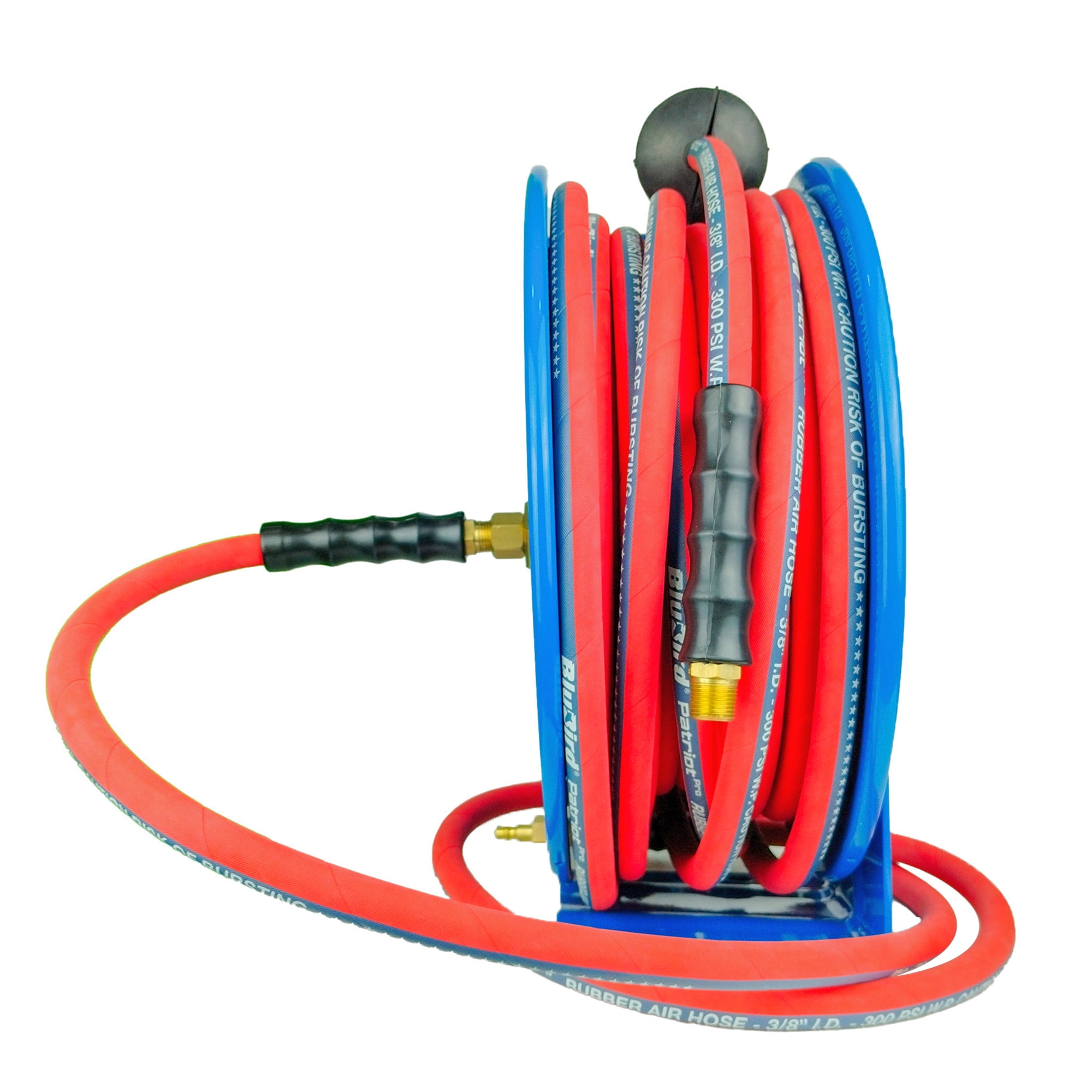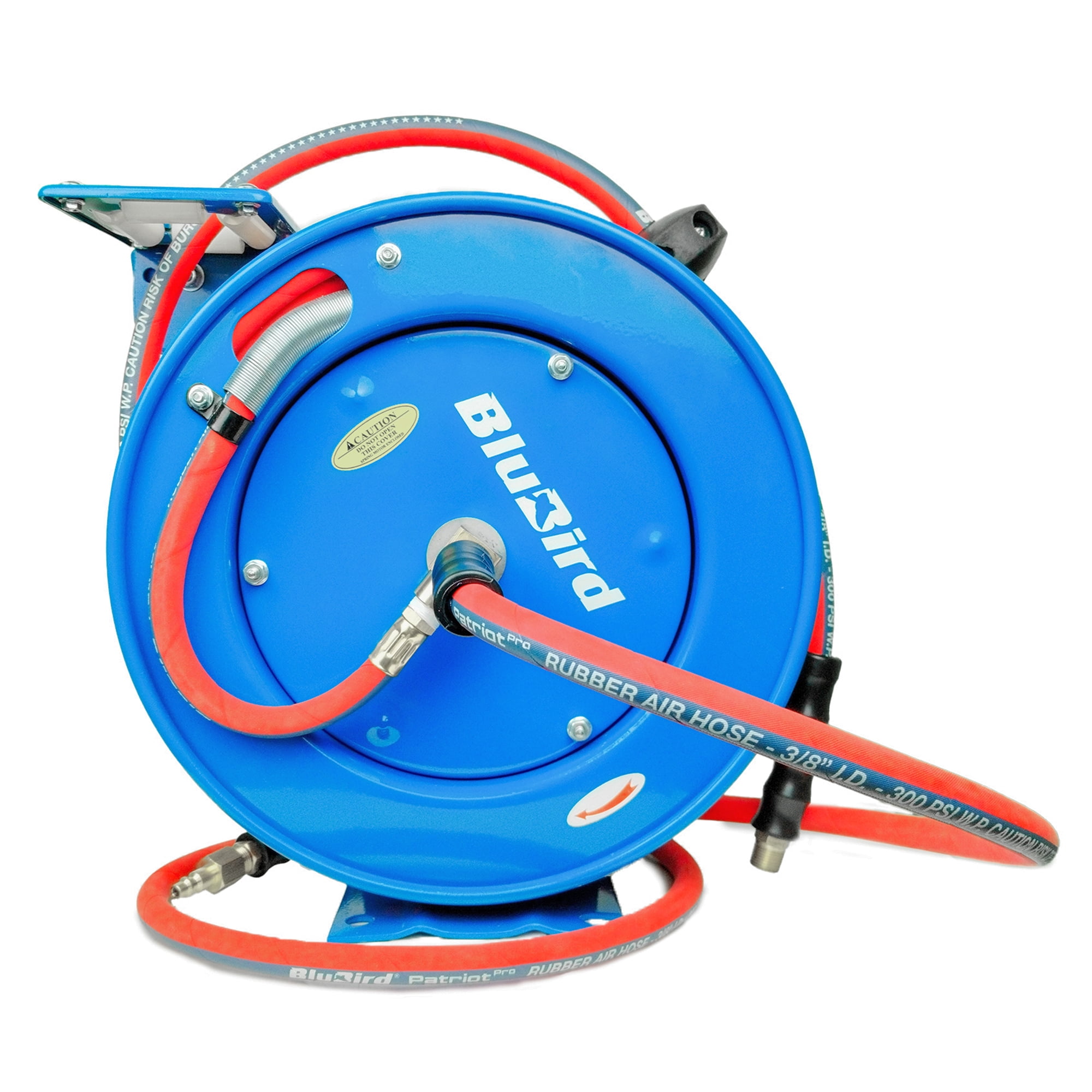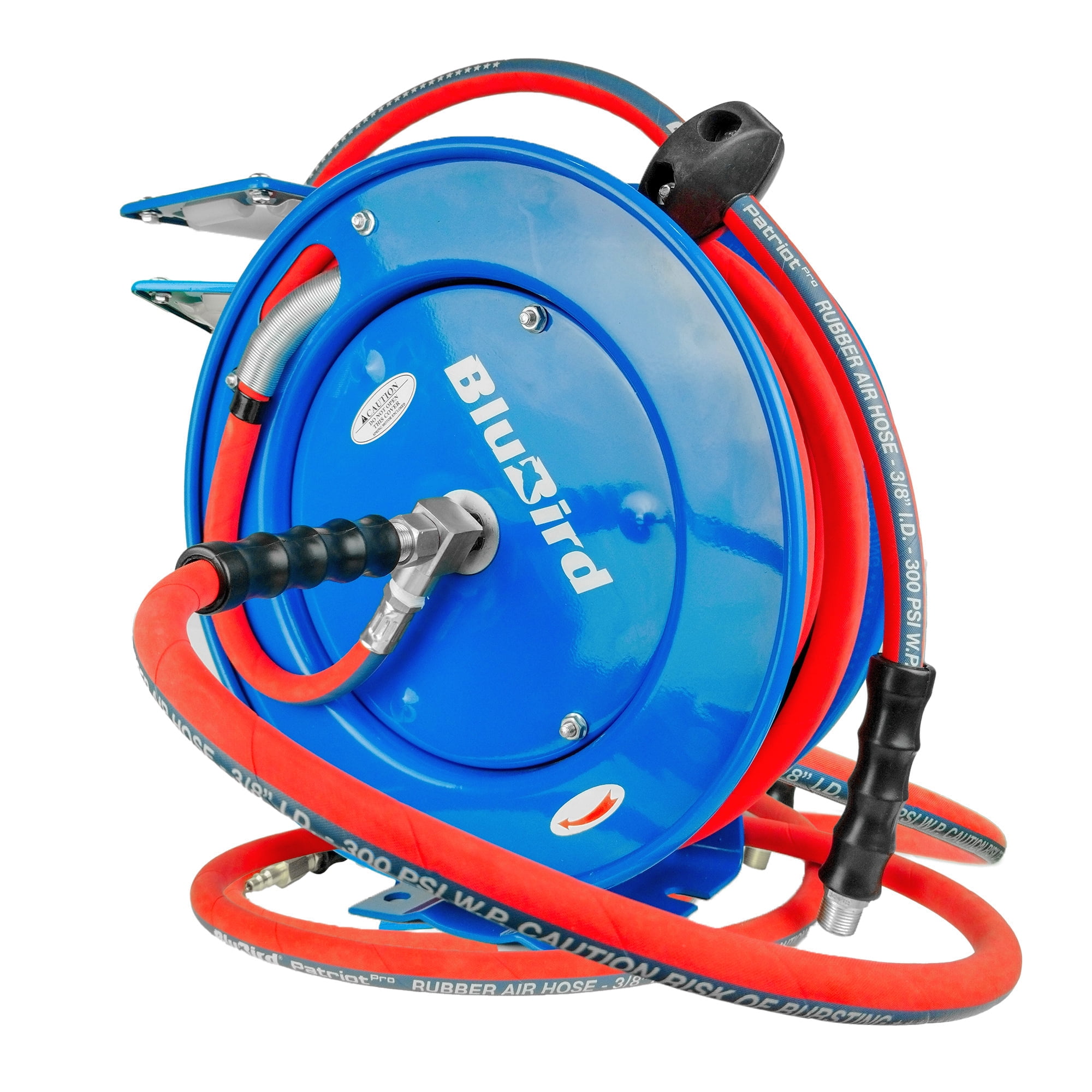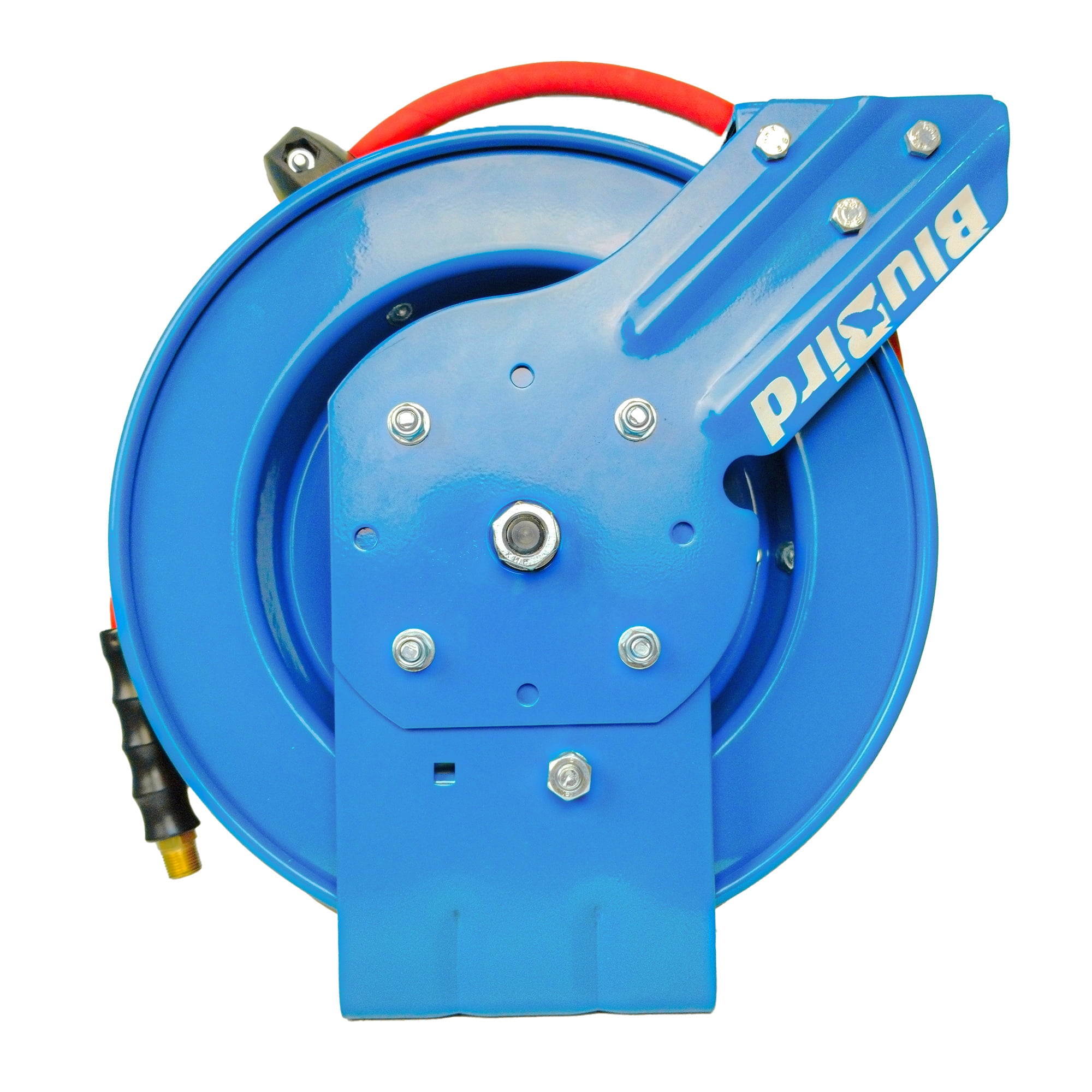 BluBird’s Spring-Driven Auto-Retractable Compact Designed Air Hose Reels use minimal space and allow for easy mounting in garages, workstations and more. These are made in durable steel frame construction that is powder coated to ensure corrosion resistant exteriors. These are suitable for light to heavy-duty applications and are great for tasks that call for high-impact resistant performance. The reel comes wounded with a kink-resistant, 100% rubber air hose with a wrapped finish that remains all-weather flexible in extremes ranging from -50oF to +190oF. The wrapped finish gives a hint of the same finish used for hydraulic hoses . This gives the hose a better adhesion between layers which in turn nearly eliminates the ballooning of hoses. These are perfect for auto shops, workshops, home studios, garages, mobile mechanics, construction workers and more. The premium commercial 3/8″ x 10′ in length air hose is 40% lighter in weight, holds a working pressure of 300 PSI and comes with a Polyester braided reinforcement with abrasion-resistant wrapped finish. It features 3/8“ MNPT, 1/4 “ Plug, along with one 3/8“ to 1/4″ reducer connections allowing it to connect to all types of air tools. It provides full-air-flow without cut-off or hose entanglement. Its 4-finger grip bend restrictors protect hose ends from sharp bends, and kinks. It’s 40% lighter than its competitors and is fully resistant to ozone, U/V, abrasions and mist. Mount on the floor, ceiling, work-benches, or wall and more for your convenient use. Everything comes packed in a sustainable packaging. Feel the sturdiness that comes with L-shaped reinforced groove design! Exceptional Reel Design: Ribbed discs with rolled edges which are spun such that it provides strength, safety, and durability. Cassette Spring: Previously you required a professional to replace a retraction spring but our reels are different. These come with a Cassette type “Spring” which resembles the old times cassette tapes like “Plug and Play” mechanism. These can be easily replaced in a DIY way without any professional help. Adjustable Four Non- Snag Roller Guide Plate: The hose rolls on and off the reel smoothly guided by 4-non-snag roller guide plate that can be adjusted to different positions as per your mounting needs. These reduce abrasion and wear on the hose and resist kinking and tangling under pressure. Adjustable Five-Position Guide Arm: The guide arm is adjustable up to five different directions and positions to accommodate your needs. 12-Point Ratchet Mechanism: This Hose Reel utilizes a 12-point-position release ratchet spring, to lock the hose at any desired length & comes with a stamped steel guide arm. Sturdy Hose Stopper: That locks the hose at the desired position, and ensures the hose does not slip or retract way too much than needed. Spring Guard and Four-Finger Bend Restrictors: The spring guard and rubber protective bend restrictors work together to offer long-lasting protection. The spring guard is resistant to rubbing and prevents the hose from bending and wearing at corners, and the rubber protective bend restrictors shield the air hose connection from bending, leaking, or wearing. 100% Rubber Air Hose with Wrapped Finish: The heavy-duty wrapped finish provides protection to prevent damage and wear in different applications and environments ensuring durability and longevity. The wrapped finish gives a hint of the same finish used for hydraulic hoses. This gives the hose a better adhesion between layers which in turn nearly eliminates the ballooning of hoses. Mounting Template: The product comes along with a Mounting Template including four ½ inch drill holes that can be used by a single person to mount the reel. Perfect For: These are perfect for auto shops, workshops, home studios, garages, mobile mechanics, construction workers and more.