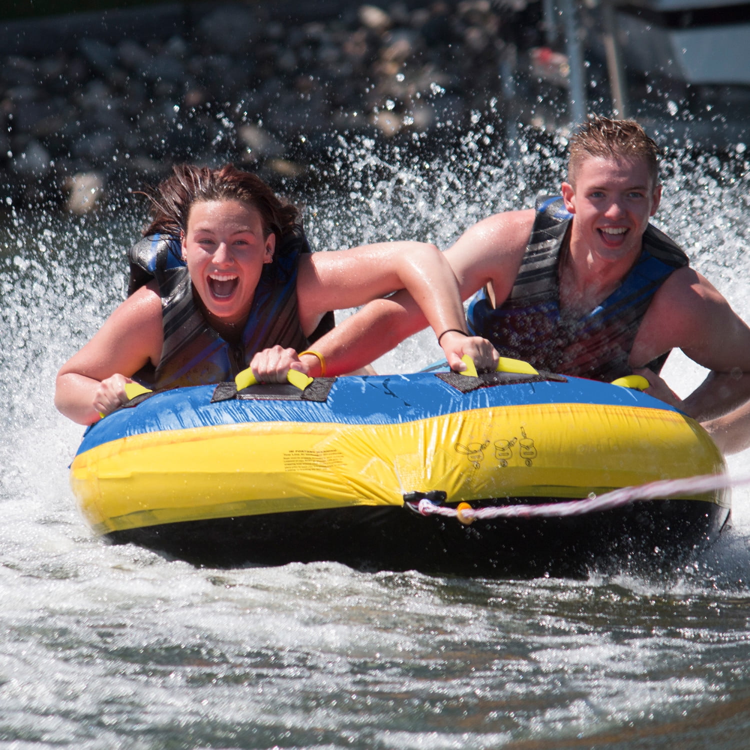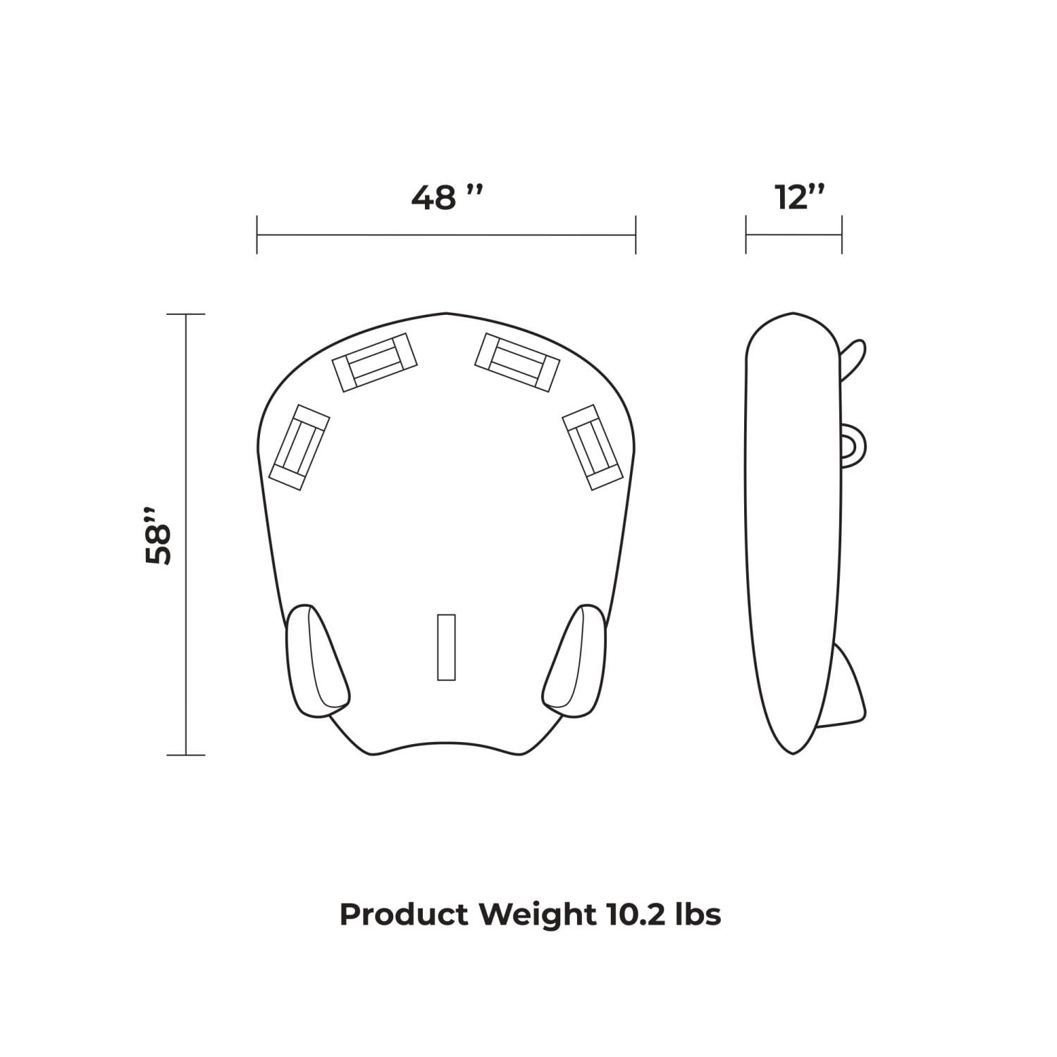 The Blue Angel 2 rider inflatable towable tube is the perfect addition to all of your water toys! 2 Rider Towable. 340 lbs. (154 kg) max rider weight. 48” x 56” x 12” (122cm x 142cm x 30cm) inflated. 52” x 60” (132cm x 152cm) deflated. Tapered profile for easy boarding. Durable 420D Nylon cover. Heavy duty 24 gauge PVC bladder. Centrifugal force deterrents keeps riders in place. Single rear boarding strap. 4 foam-filled handles with Neoprene knuckle guards. Quick connect tow point.