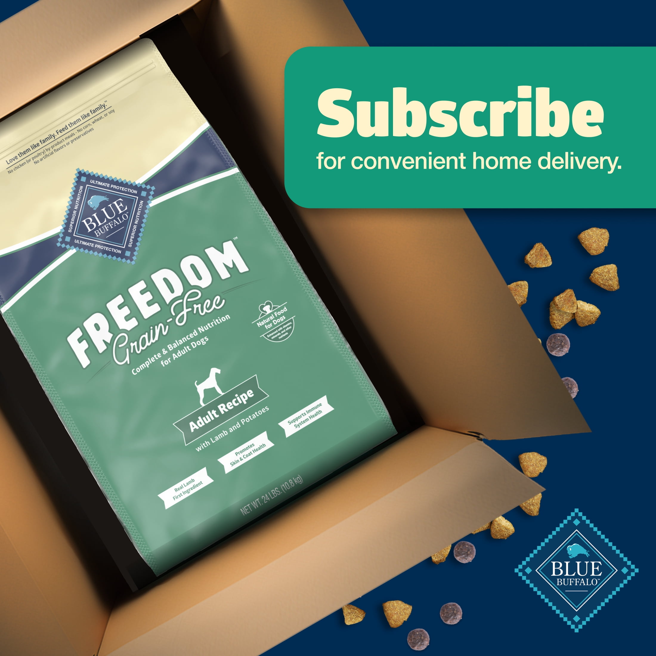 REAL LAMB FIRST: This Blue Buffalo dog food is made with real, high-quality lamb as the #1 ingredient GRAIN-FREE DOG FOOD: This dry dog food is free of grains that contain gluten, which some Pet Parents choose to avoid IMMUNE SYSTEM SUPPORT: Natural dog food that contains exclusive, antioxidant-rich LifeSource Bits HEALTHY, WHOLESOME INGREDIENTS: This Blue Buffalo dog food is made with no chicken (or poultry) by-product meals and no corn, wheat, or soy Contains: One (1) 24-lb bag of BLUE Freedom Grain-Free Dry Dog Food, Lamb Recipe FORMULA ADJUSTMENTS: To optimize palatability, ingredients have been changed on our BLUE Freedom Dog Dry recipes – there have been no addition of new allergens ENHANCED IMAGERY: We have enhanced our digital product packaging to highlight our products’ ingredients and essential benefits; while the physical packaging will differ slightly, all information is accurate