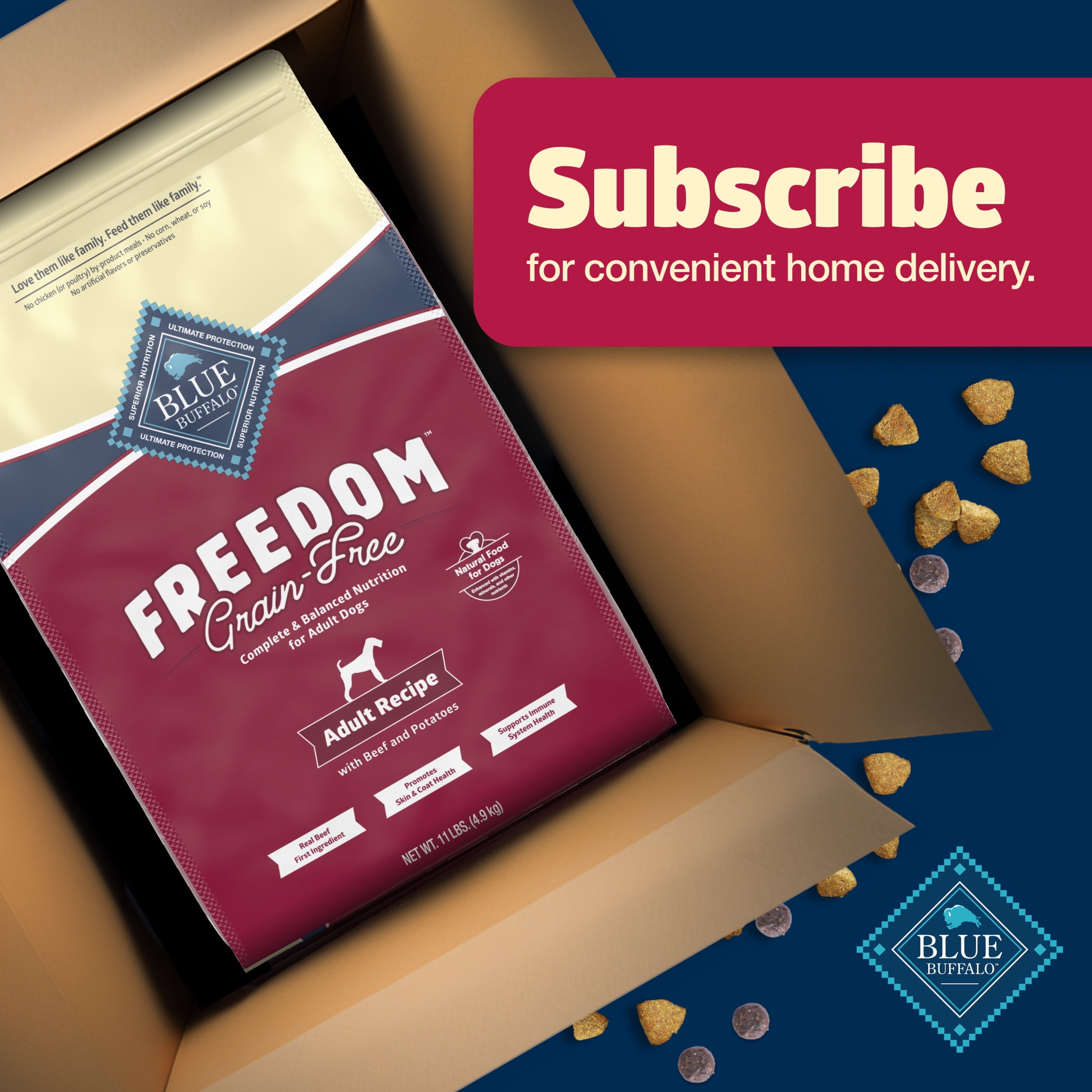 REAL BEEF FIRST: This grain-free dog food is made with real, high-quality beef as the #1 ingredient GRAIN-FREE DOG FOOD: This dry dog food is free of grains that contain gluten, which some Pet Parents choose to avoid IMMUNE SYSTEM SUPPORT: Natural dog food that contains exclusive, antioxidant-rich LifeSource Bits HEALTHY, WHOLESOME INGREDIENTS: This Blue Buffalo dog food is made with no chicken (or poultry) by-product meals and no corn, wheat, or soy Contains: One (1) 11-lb bag of BLUE Freedom Grain-Free Dry Dog Food, Beef Recipe FORMULA ADJUSTMENTS: To optimize palatability, ingredients have been changed on our BLUE Freedom Dog Dry recipes – there have been no addition of new allergens ENHANCED IMAGERY: We have enhanced our digital product packaging to highlight our products’ ingredients and essential benefits; while the physical packaging will differ slightly, all information is accurate