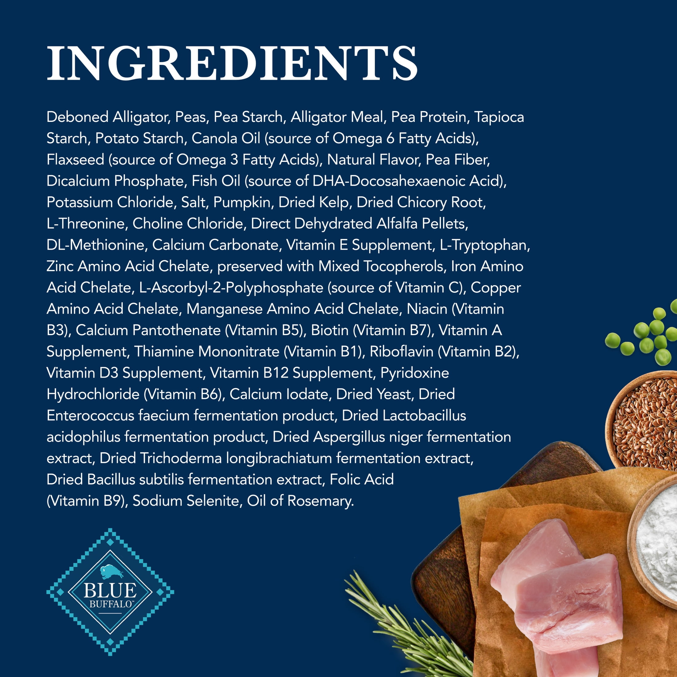 REAL ALLIGATOR FIRST: This Blue Buffalo dry dog food is made with real deboned alligator as the #1 ingredient VETERINARY-PRESCRIBED FORMULA: Formulated for dogs with special dietary needs, this dry dog food is packed with nutrition and flavor IDEAL FOR DOGS with FOOD SENSITIVITIES: Formulated with vitamins and minerals for dogs with food intolerance HEALTHY, WHOLESOME INGREDIENTS: This natural dog food is made with no chicken (or poultry) by-product meals and no corn, wheat, or soy Contains: One (1) 22-lb bag of Blue Buffalo Natural Veterinary Diet NP Novel Protein Dry Dog Food, Alligator Recipe ENHANCED IMAGERY: We have enhanced our digital product packaging to highlight our products’ ingredients and essential benefits; while the physical packaging will differ slightly, all information is accurate