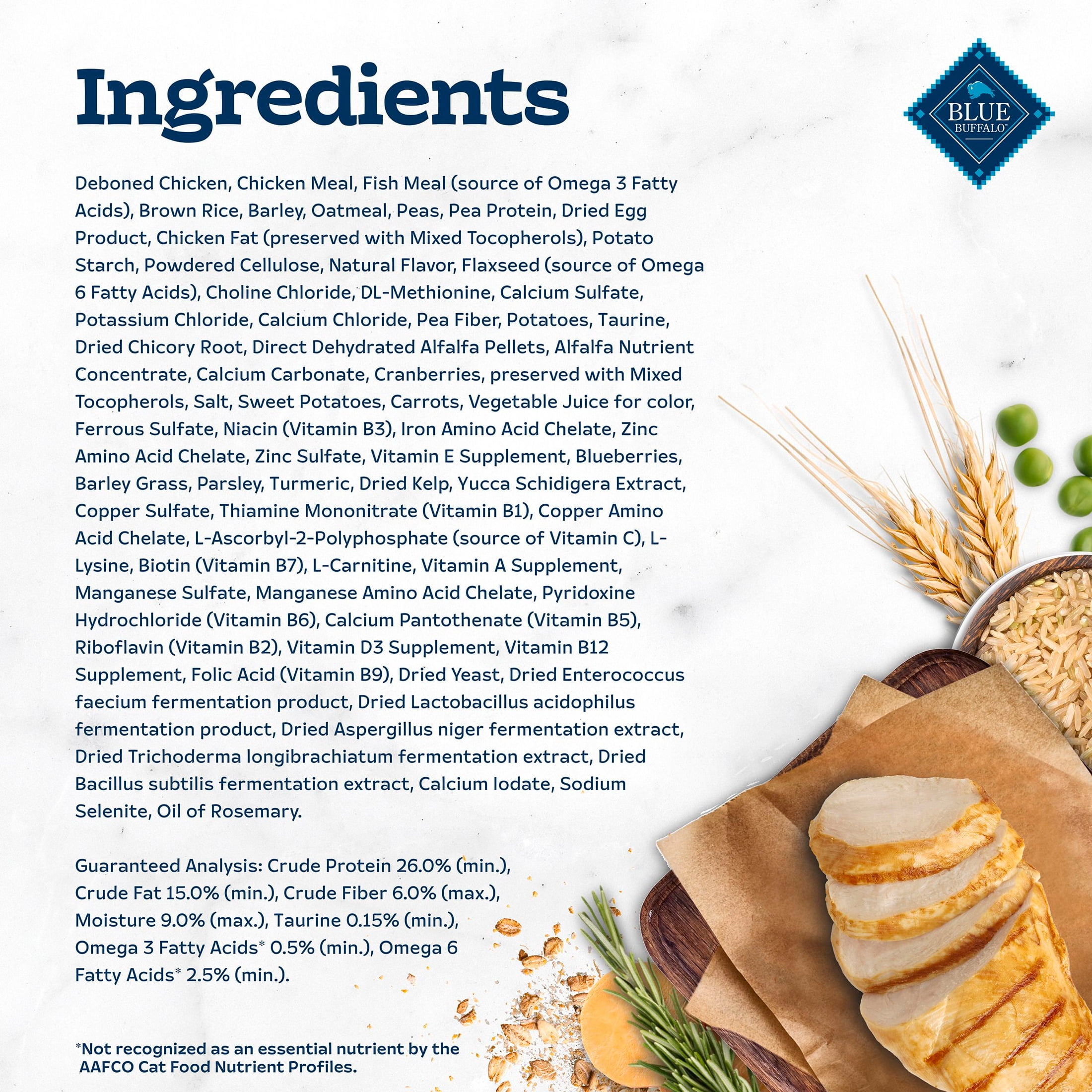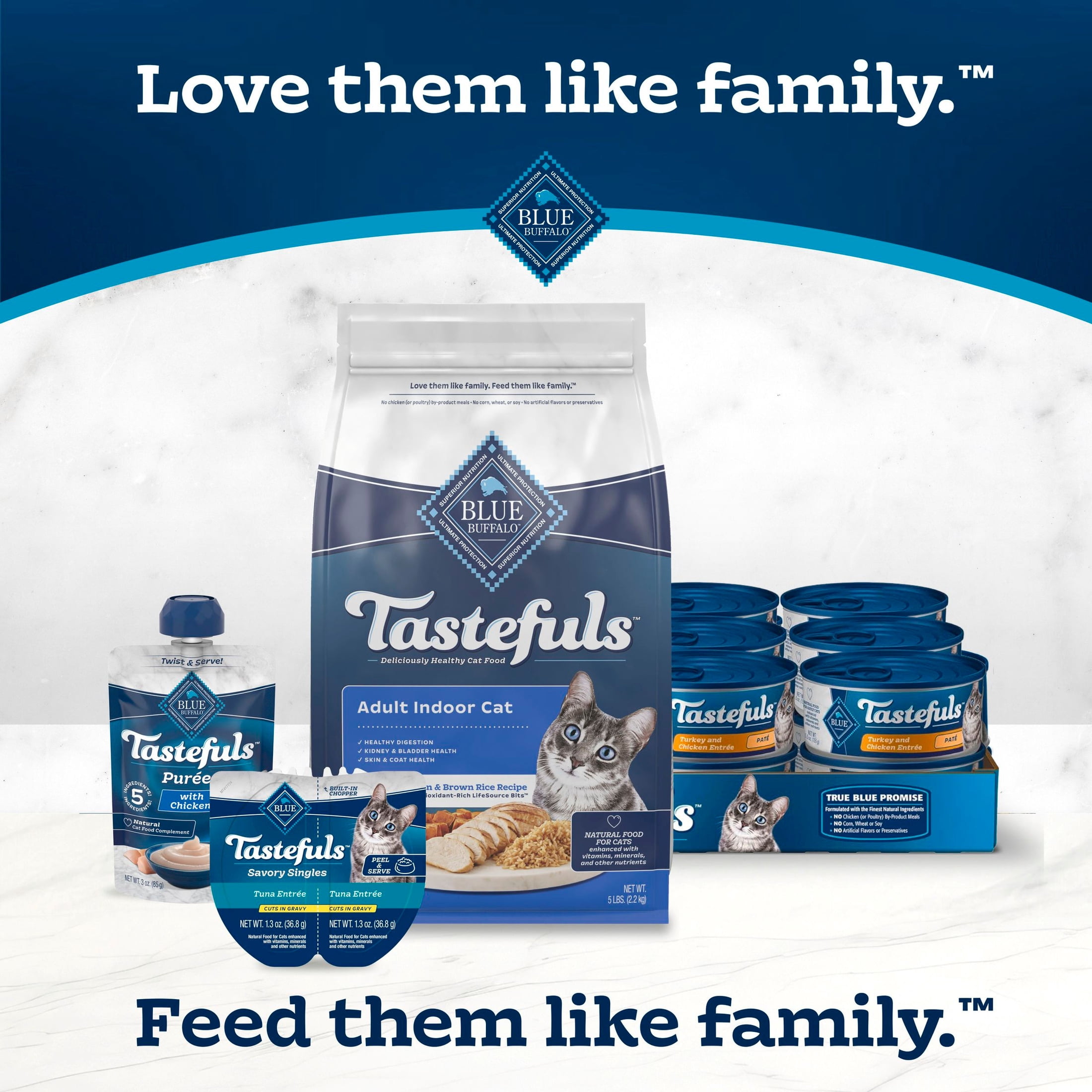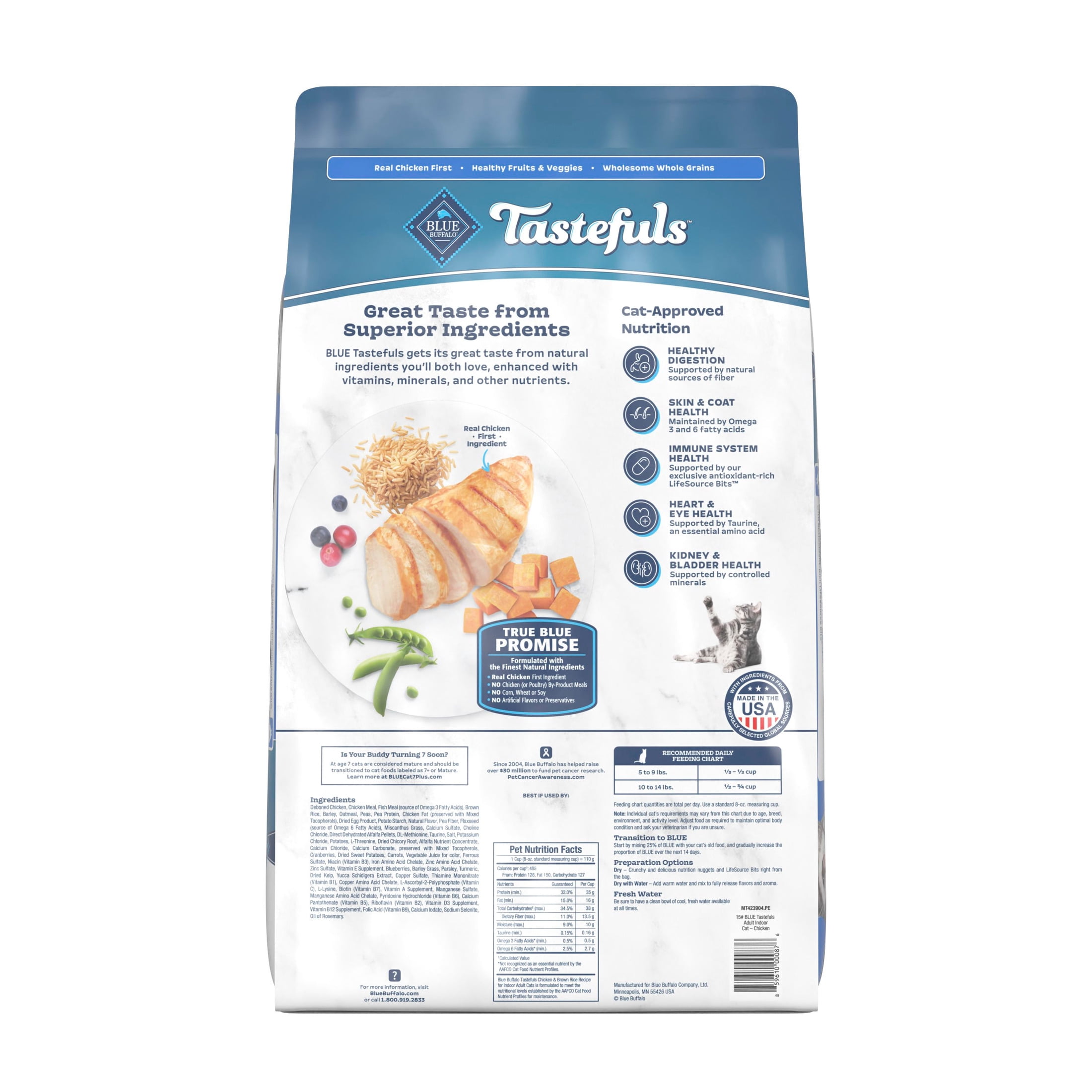 REAL CHICKEN FIRST: This Blue Buffalo cat food is made with real, high-quality chicken as the #1 ingredient IDEAL FOR ADULT CATS: Dry indoor cat food formulated with natural sources of fiber and nutrients for digestive care and coat health IMMUNE SYSTEM SUPPORT: Healthy adult dry cat food contains exclusive, antioxidant-rich LifeSource Bits HEALTHY, WHOLESOME INGREDIENTS: This indoor cat food is made with no chicken (or poultry) by-product meals and no corn, wheat, or soy Contains: One (1) 15-lb bag of BLUE Tastefuls Indoor Adult Dry Cat Food, Chicken & Brown Rice Recipe ENHANCED IMAGERY: We have enhanced our digital product packaging to highlight our products’ ingredients and essential benefits; while the physical packaging will differ slightly, all information is accurate