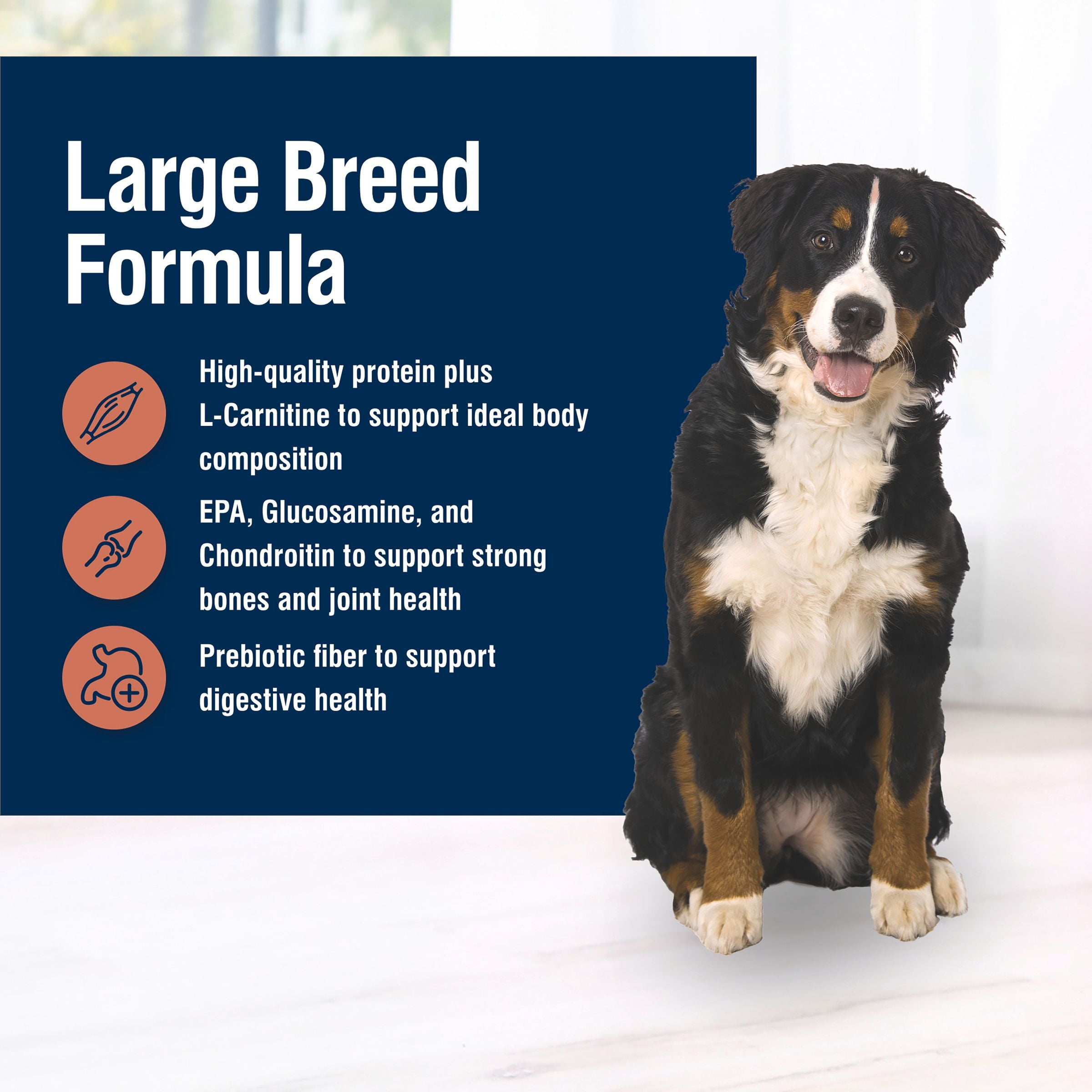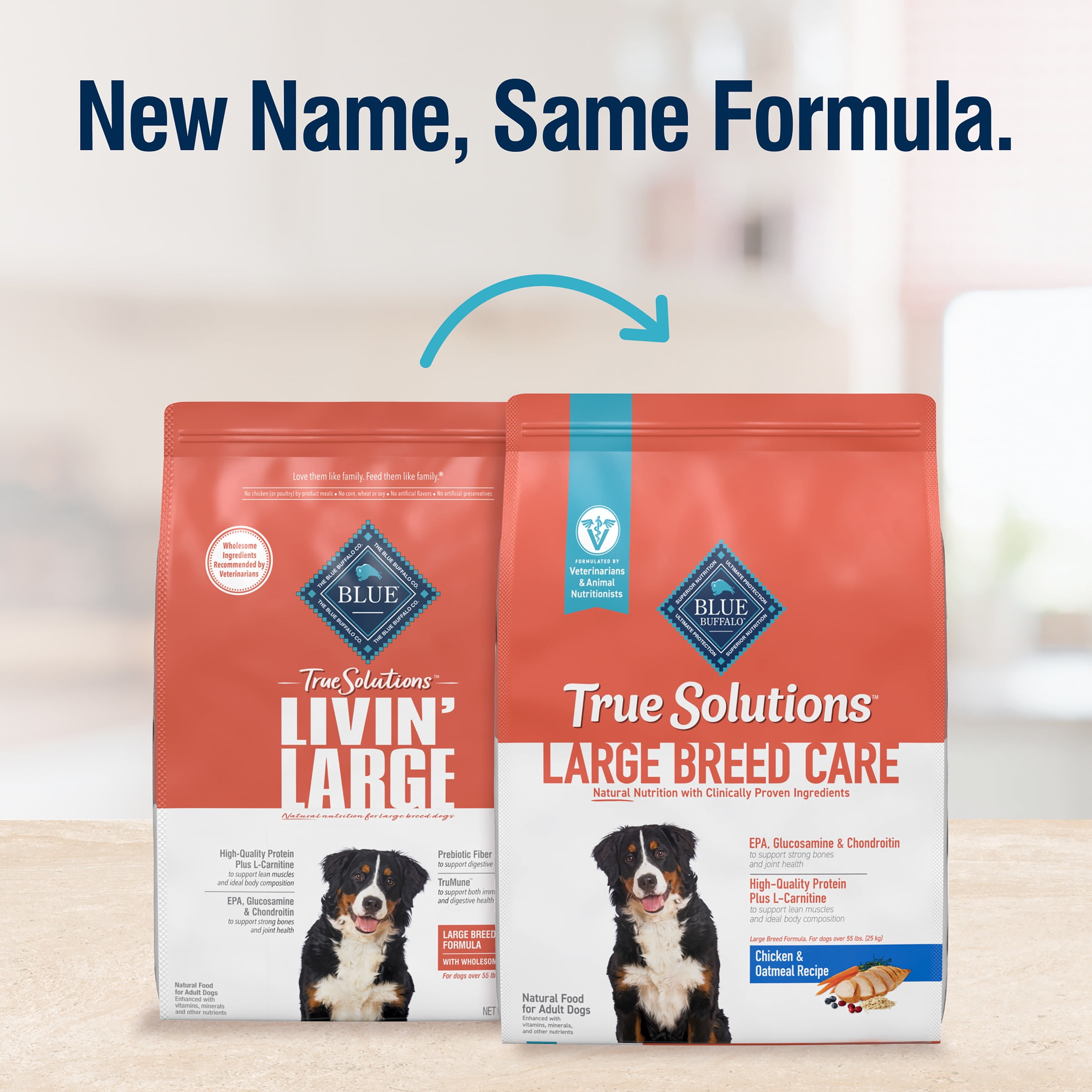 LARGE BREED FORMULA: This Blue Buffalo dry dog food supports lean muscles and ideal body composition with high-quality protein plus L-Carnitine; strong bones and joint health with EPA, Glucosamine, and Chondroitin; and digestive health with prebiotic fiber FORMULATED BY VETERINARIANS & ANIMAL NUTRITIONISTS: True Solutions offers natural nutrition with clinically proven ingredients recommended by veterinarians REAL CHICKEN FIRST: This Blue Buffalo dog food is made with real, high-quality chicken as the #1 ingredient HEALTHY, WHOLESOME INGREDIENTS: Blue Buffalo natural dog food is made with no chicken (or poultry) by-product meals and no corn, wheat, or soy PACKAGING MAY VARY: Contains one (1) 24-lb. bag of BLUE True Solutions Large Breed Care Dry Dog Food, formerly Livin’ Large ENHANCED IMAGERY: We have enhanced our digital product packaging to highlight our products’ ingredients and essential benefits. While the physical packaging will differ slightly, all information is accurate