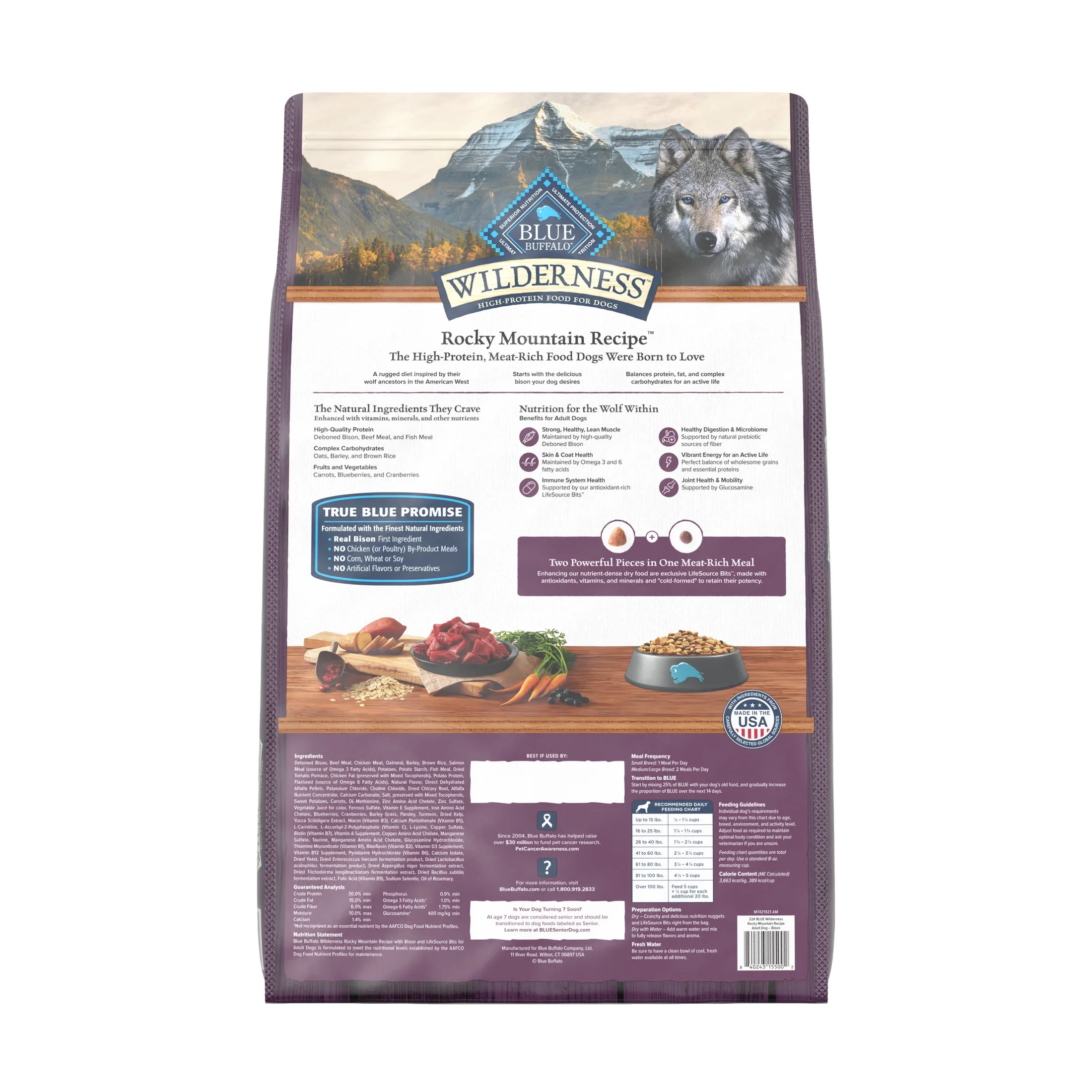 REAL MEAT FIRST: This Blue Buffalo dog food is made with real, high-quality bison as the #1 ingredient. ENERGY FOR AN ACTIVE LIFE: This high-protein dog food is made with essential proteins and carbohydrates to help support an active lifestyle. IMMUNE SYSTEM SUPPORT: BLUE Wilderness Dry Dog Food contains exclusive antioxidant-rich LifeSource Bits. HEALTHY, WHOLESOME INGREDIENTS: This natural dog food is made with no chicken (or poultry) by-product meals and no corn, wheat, or soy. Contains: One (1) 22-lb. bag of BLUE Wilderness High-Protein Adult Dry Dog Food, Rocky Mountain Bison & Grain Recipe. ENHANCED IMAGERY: We have enhanced our digital product packaging to highlight our products’ ingredients and essential benefits. While the physical packaging will differ slightly, all information is accurate
