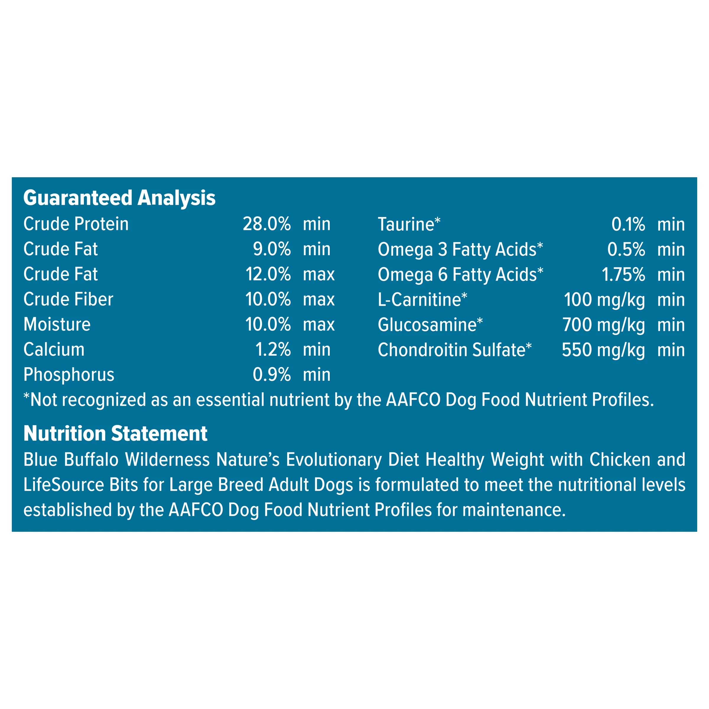 REAL CHICKEN FIRST: This Blue Buffalo dog food is made with real, high-quality chicken as the #1 ingredient. PACKED WITH FLAVOR AND NUTRITION: This dog food promotes muscle development, helps strengthen bones and teeth, and supports lasting mobility. HEALTHY WEIGHT CONTROL: This weight control dry dog food has an ideal caloric balance and supports lean muscle development. HEALTHY, WHOLESOME INGREDIENTS: This natural dog food is made with no chicken (or poultry) by-product meals and no corn, wheat, or soy. Contains: One (1) 24-lb bag of BLUE Wilderness High-Protein Large Breed Healthy Weight Dry Dog Food, Chicken & Grain Recipe. ENHANCED IMAGERY: We have enhanced our digital product packaging to highlight our products’ ingredients and essential benefits. While the physical packaging will differ slightly, all information is accurate