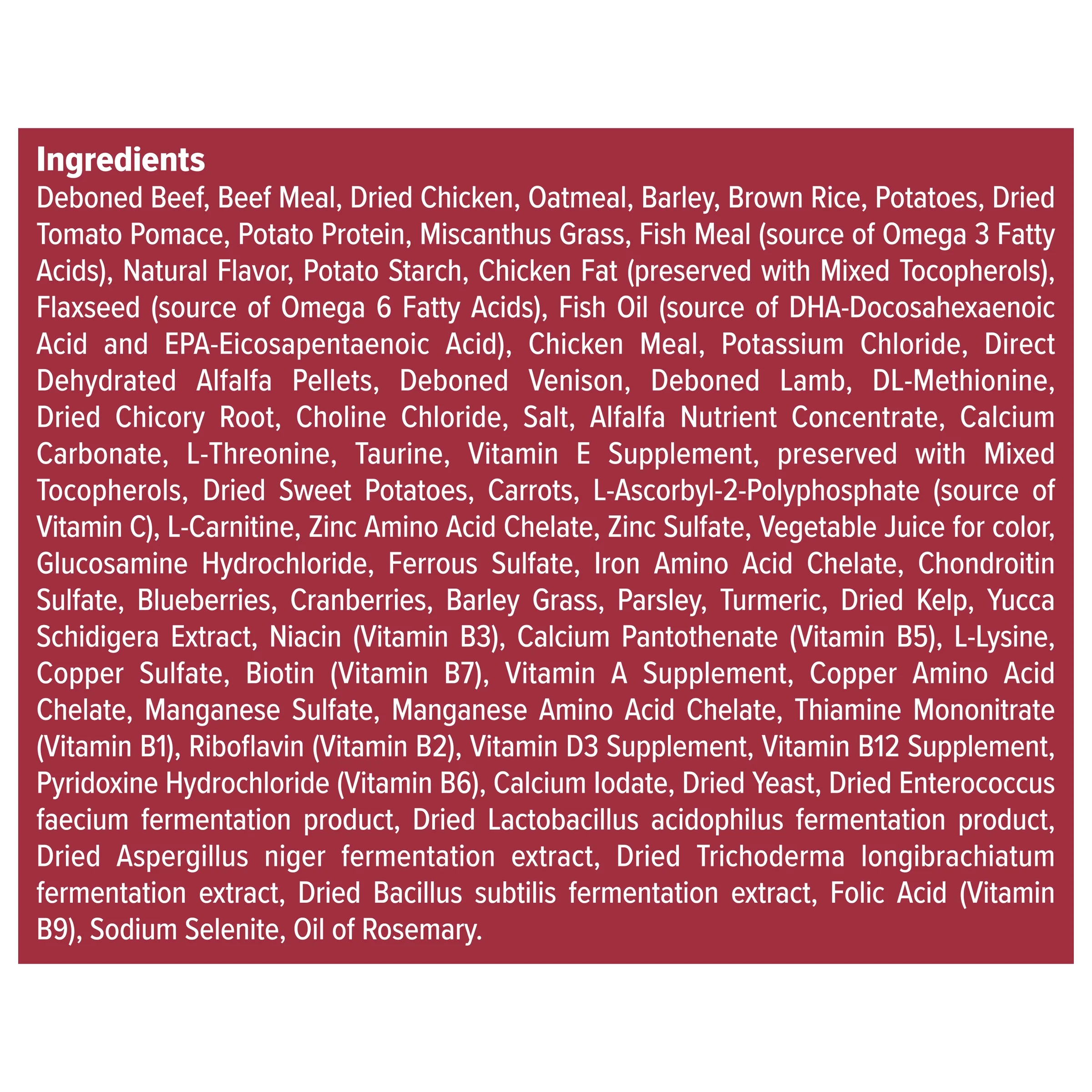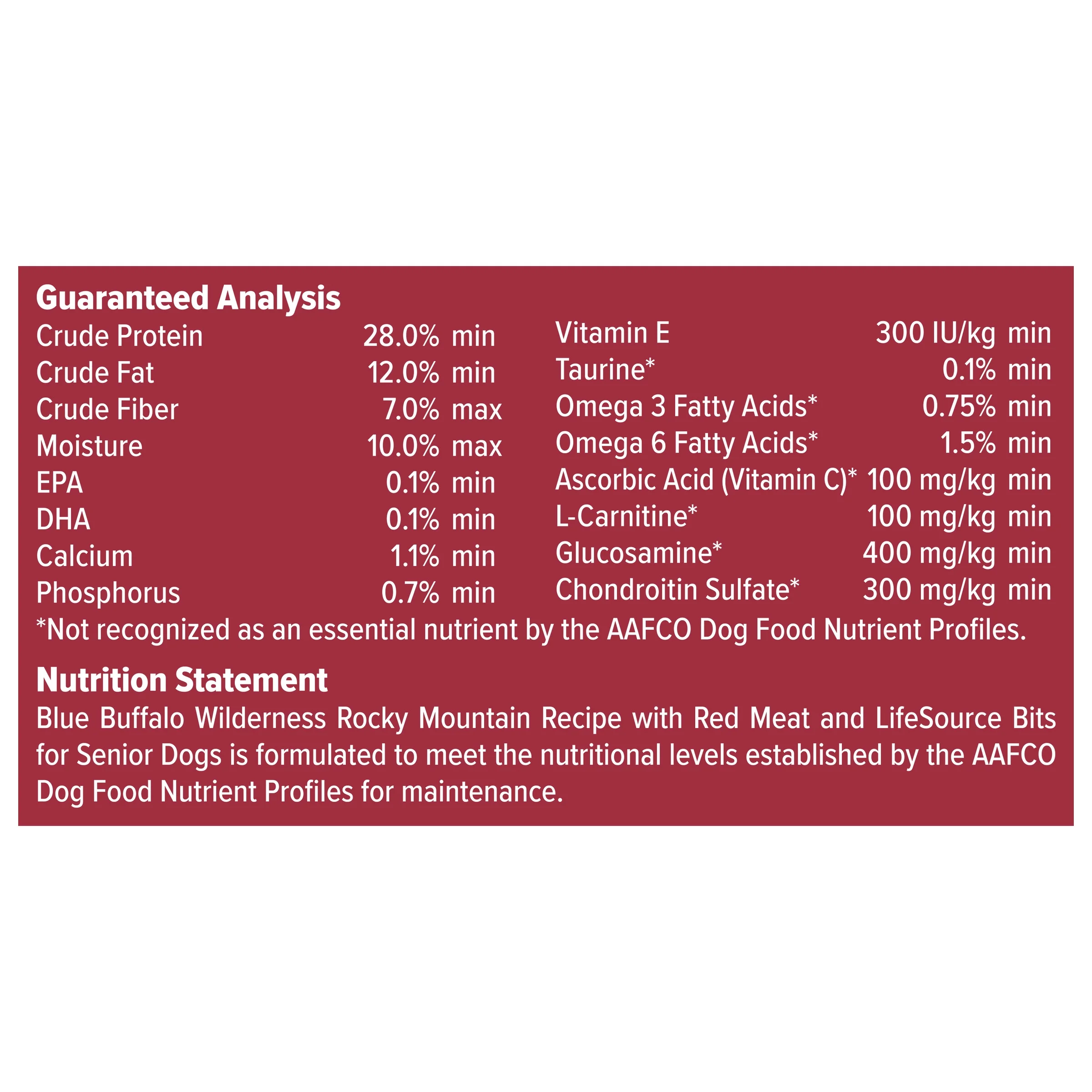PACKED WITH REAL RED MEAT: Made to satisfy your dog’s innate cravings, this protein-rich food starts with real, high-quality deboned red meat. INCLUDES WHOLESOME GRAINS: Complex carbohydrates from wholesome grains — including oatmeal, barley, and brown rice — ensure a truly balanced diet that meets your senior dog’s unique energy needs. ANTIOXIDANT-RICH LIFESOURCE BITS: Enhancing our nutrient-dense dry food are LifeSource Bits, a precise blend of antioxidants, vitamins, and minerals to support immune system health, life stage needs, and a healthy oxidative balance. NATURAL INGREDIENTS: Blue Buffalo dry dog food is made with the finest natural ingredients enhanced with vitamins, minerals, and other nutrients; It contains NO chicken (or poultry) by-product meals, NO corn, wheat, or soy, and NO artificial flavors or preservatives. Contains: One (1) 22-lb. bag of BLUE Wilderness High Protein Senior Dry Dog Food, Rocky Mountain Red Meat & Grain Recipe. ENHANCED IMAGERY: We have enhanced our digital product packaging to highlight our products’ ingredients and essential benefits. While the physical packaging will differ slightly, all information is accurate