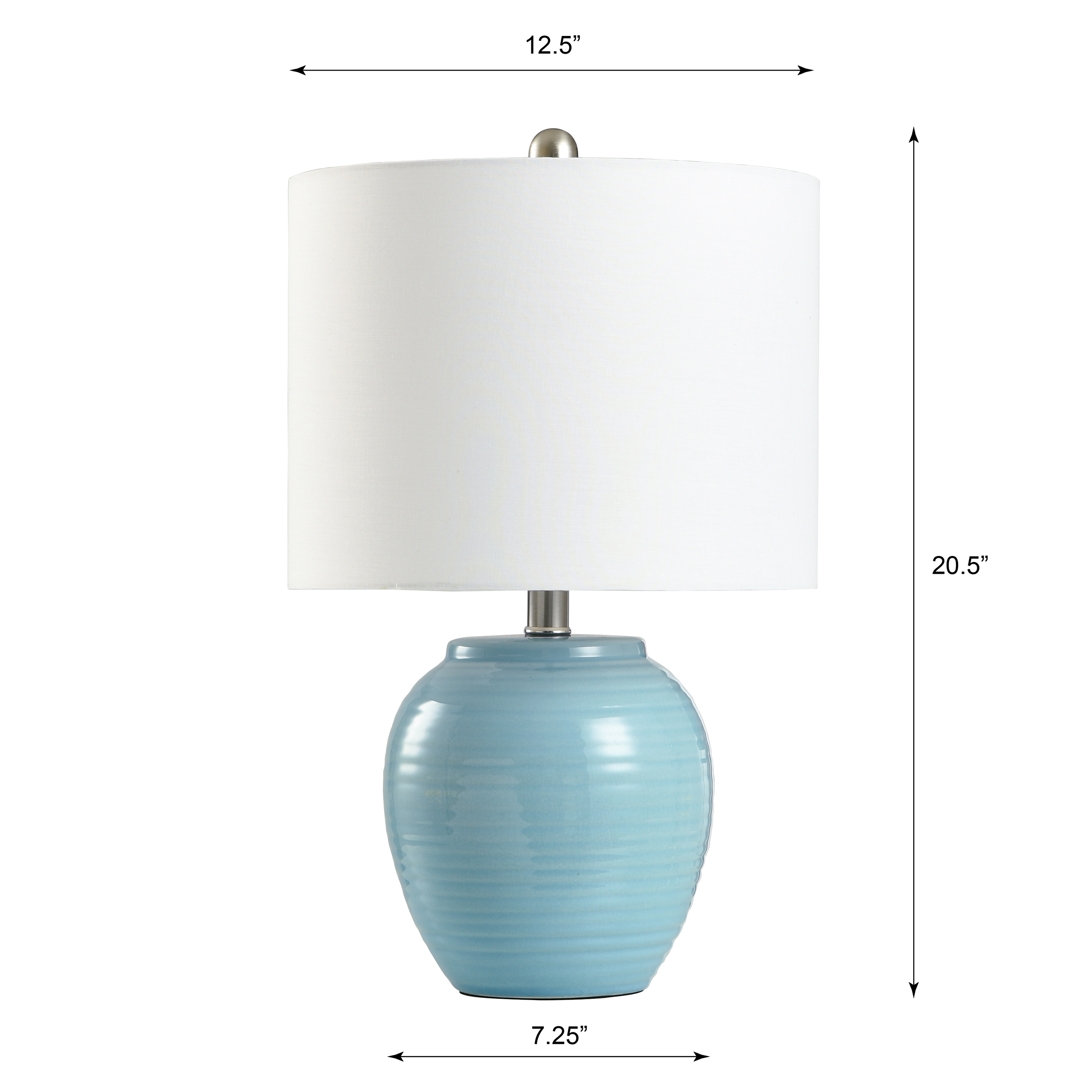 All hardware and metal turn knob in brush nickel finish A handpainted finish means each piece is unique, with possible slight variations. No two lamps are exactly alike. This fixture is UL rated in compliance with the nationally recognized standards. Voltage – 120V Switch Location – Neck Switch Type – 3 Way Shade Dimensions – 12.5diam. x 9.5H in. Requires (1) 100 Watt E26 Medium Base Incandescent Bulb (Not Included)