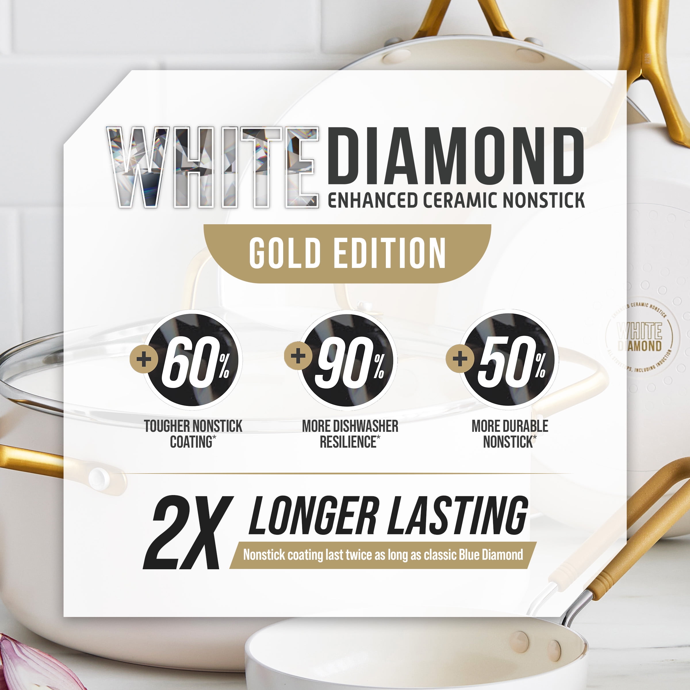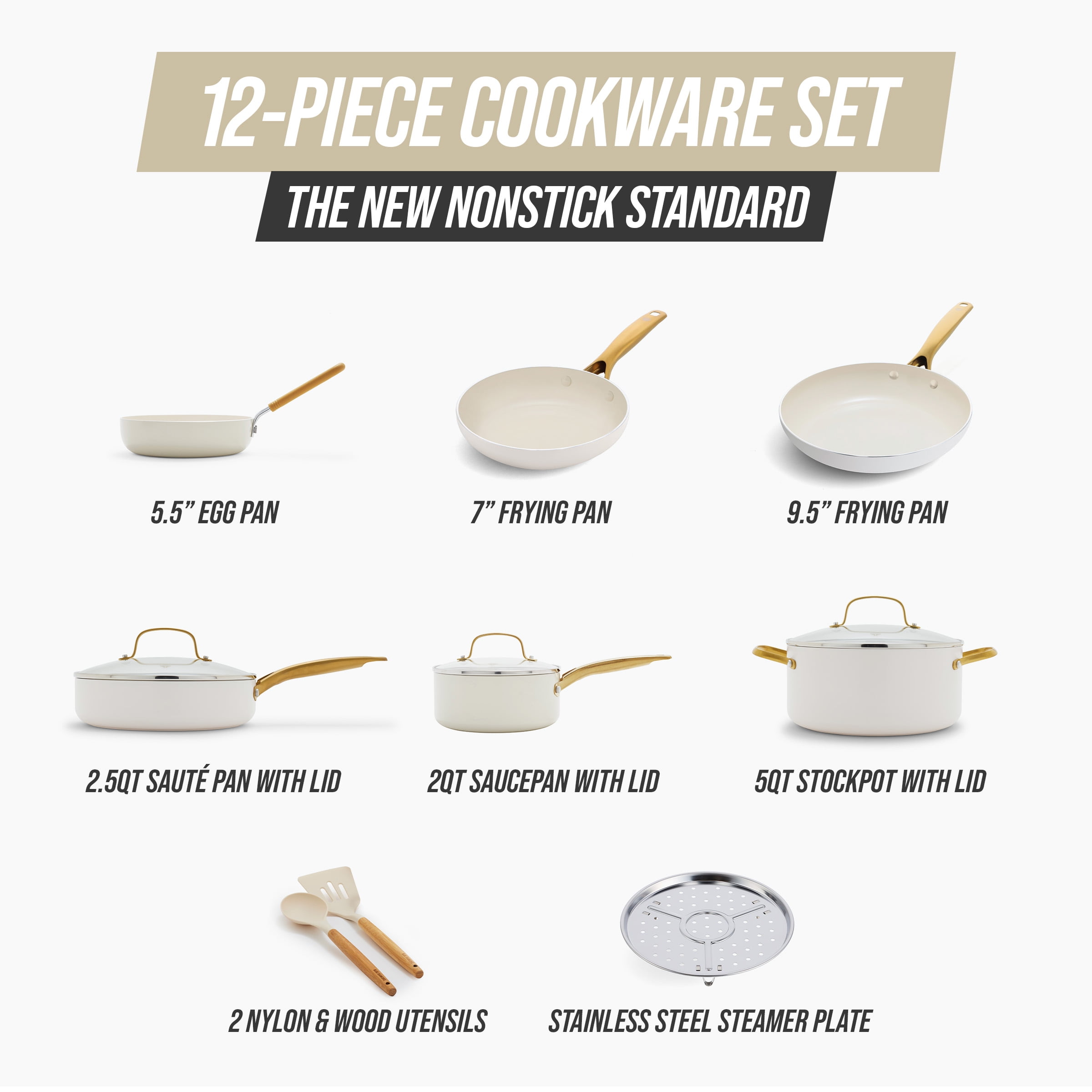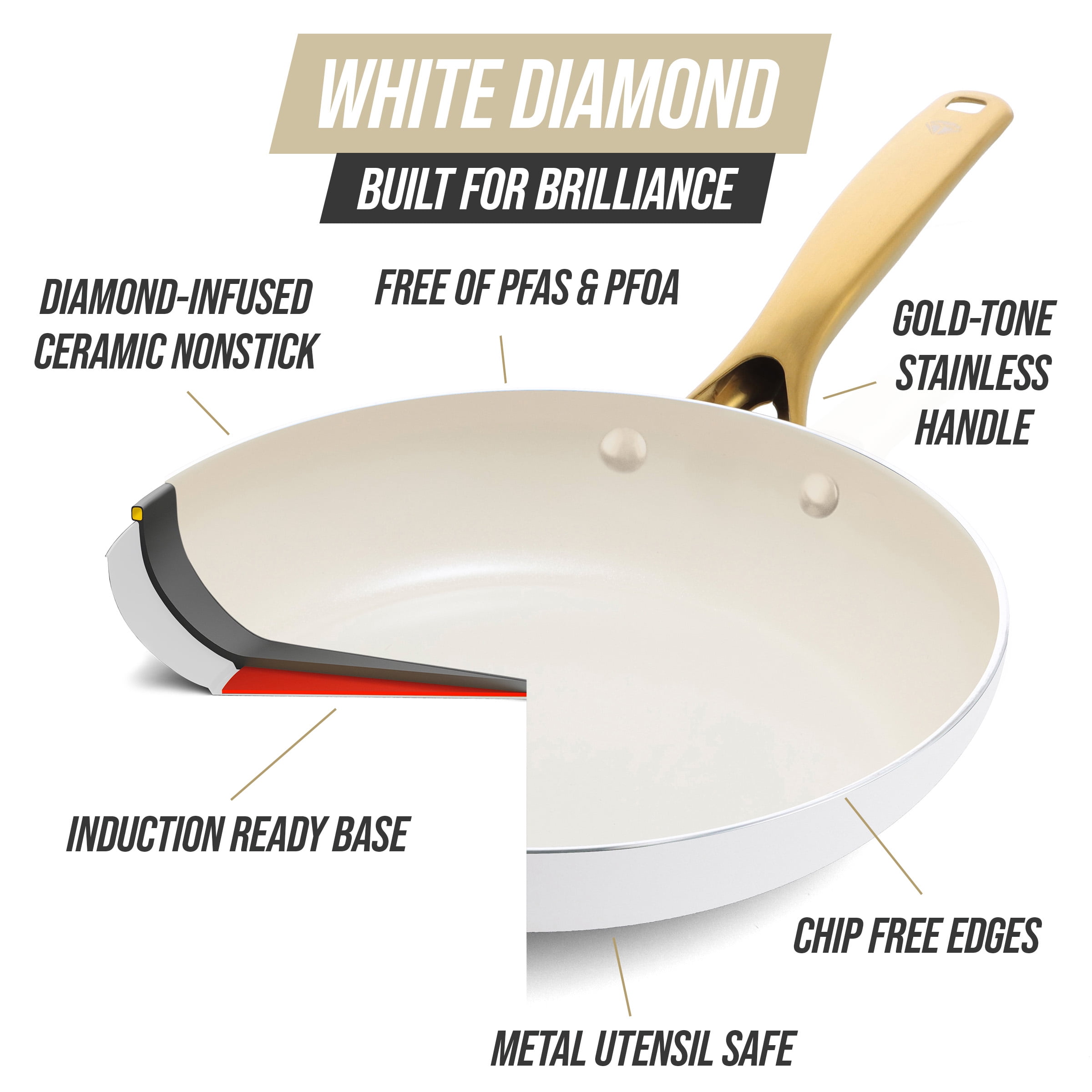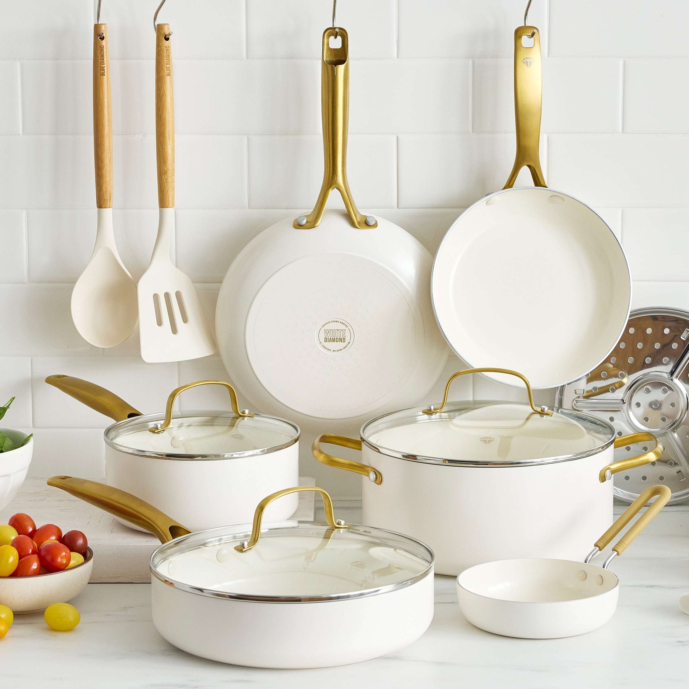 Blue Diamond White 12 Piece Nonstick Aluminum Pot and Pan Cookware Set, Gold