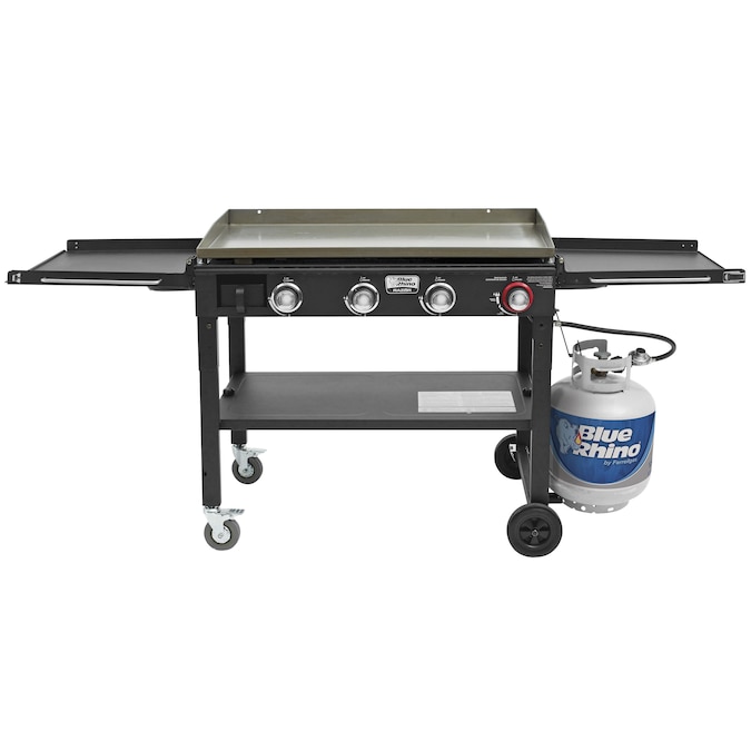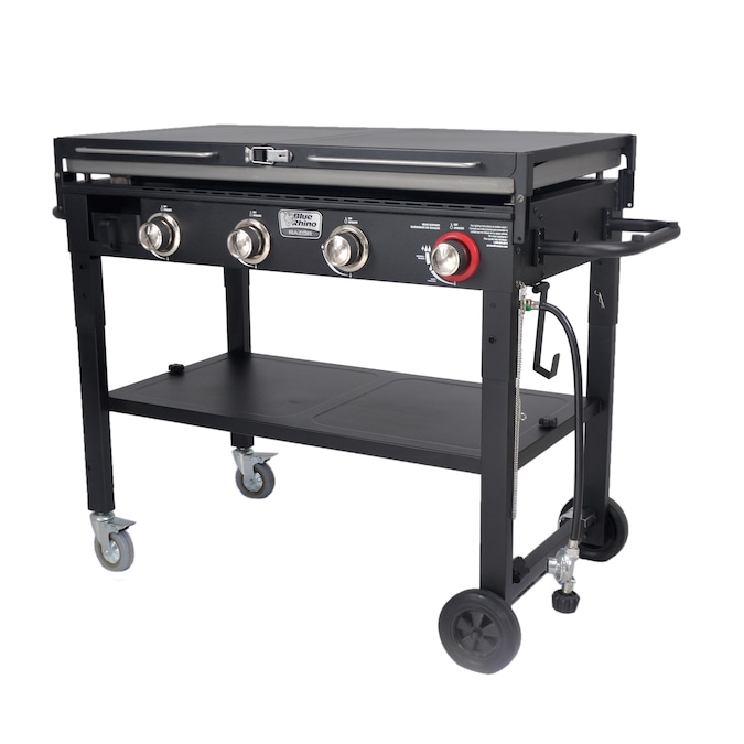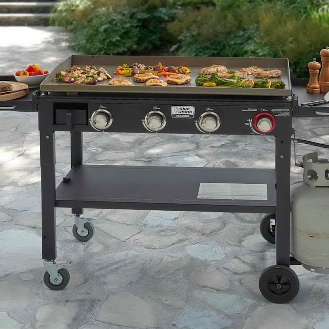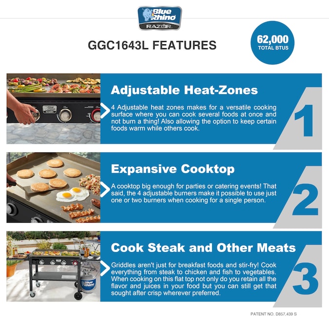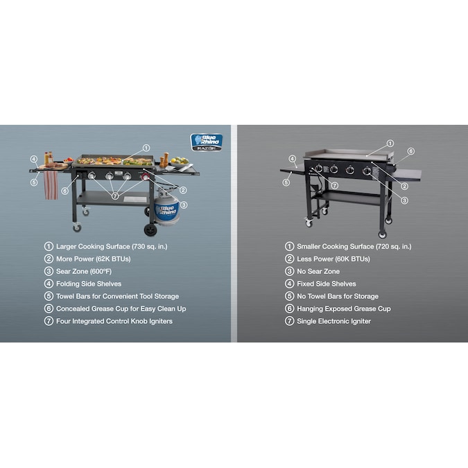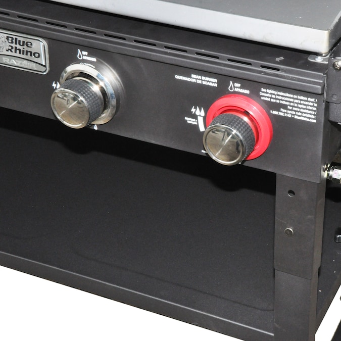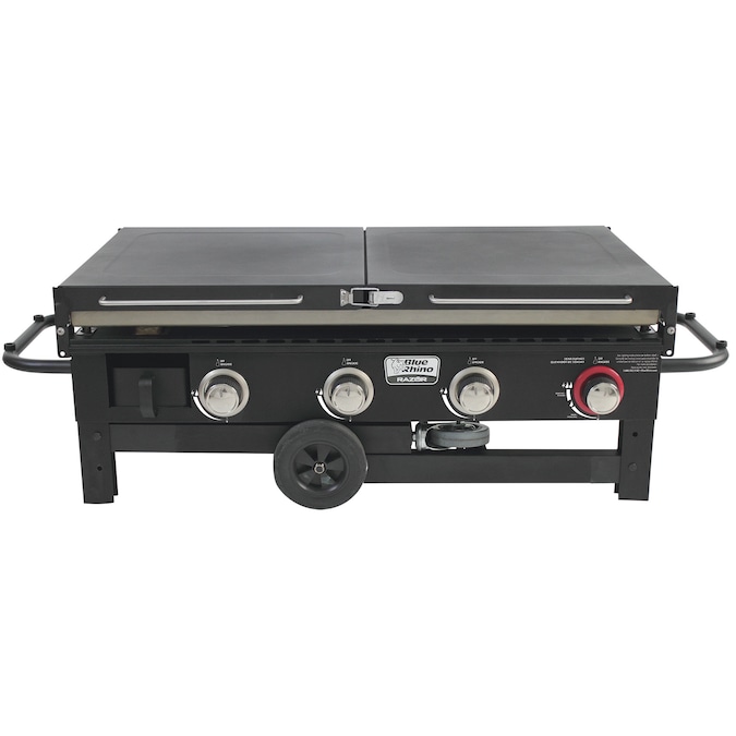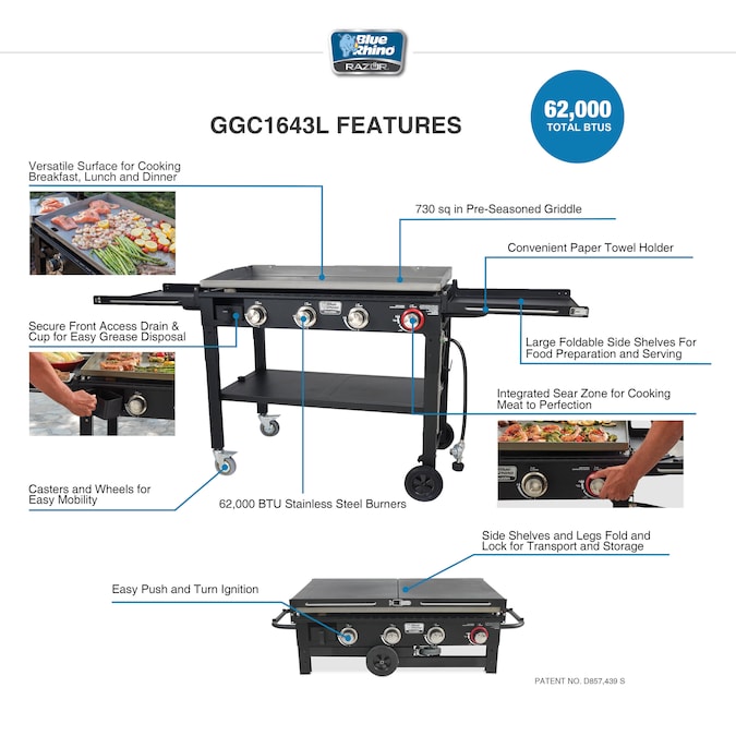 Cook up to 57 burgers at a time, fry up some eggs, sizzle some bacon or even do stir fry…all with the versatile Razor™ super-sized griddle grill by Blue Rhino®. Perfect for camping, tailgating or your backyard, the Razor™ features four stainless steel burners for a total of 62000-BTU of power, including an integrated sear zone. A push and turn ignition makes this grill easy to light and simple to use. Clean up is a snap and no spills with the unique grease management system and concealed cup. Ultra handy shelves fold and double as a fitted lid that locks protecting the cooking surface. The wheels and compact design make transporting easy for your next event.