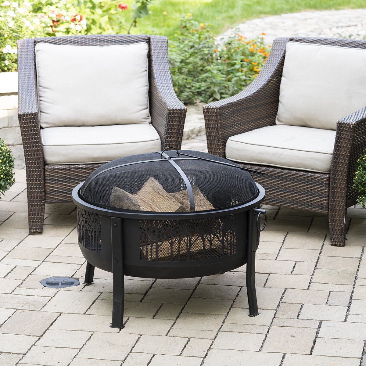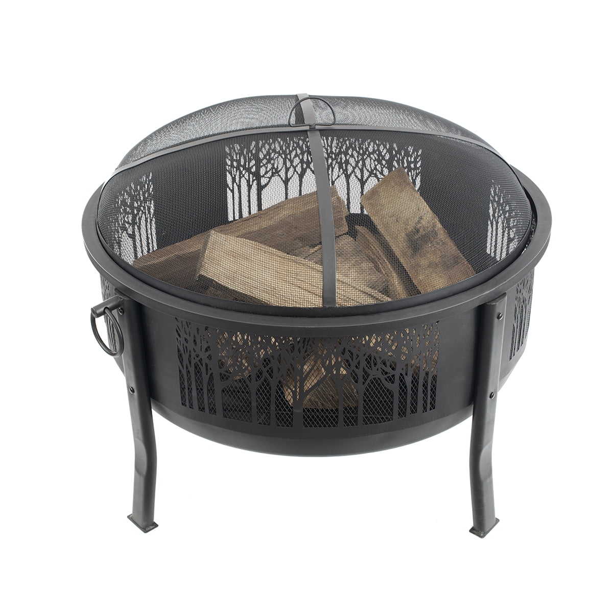 Large wood burning fire barrel with decorative cutouts Steel mesh panels provide a 360 degree view of the fire 30.8″ round fire bowl allows for larger logs and a longer burn