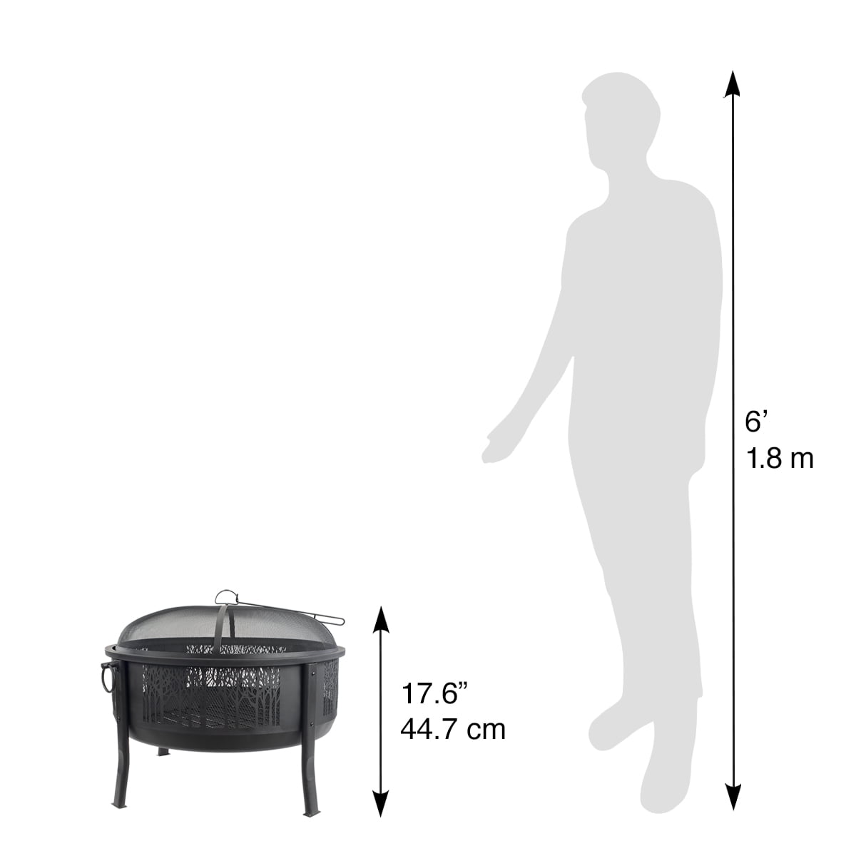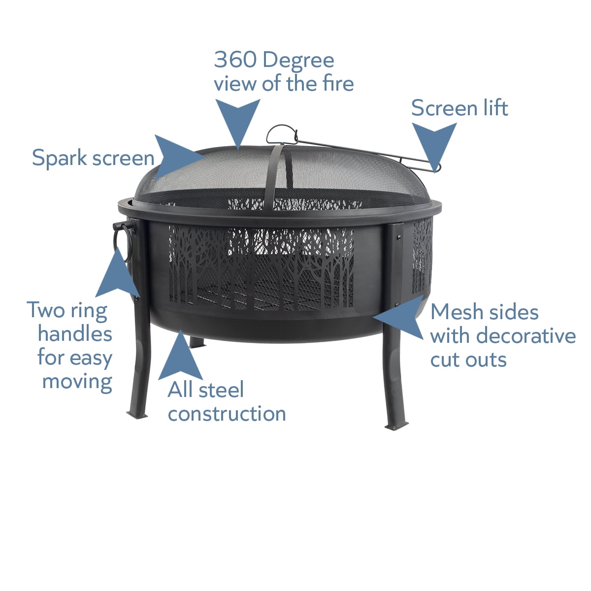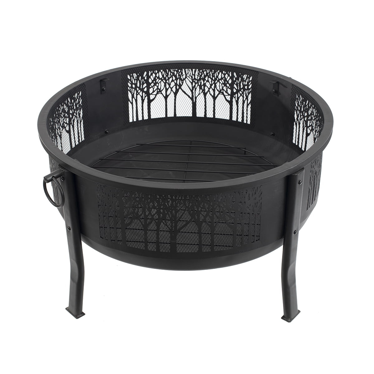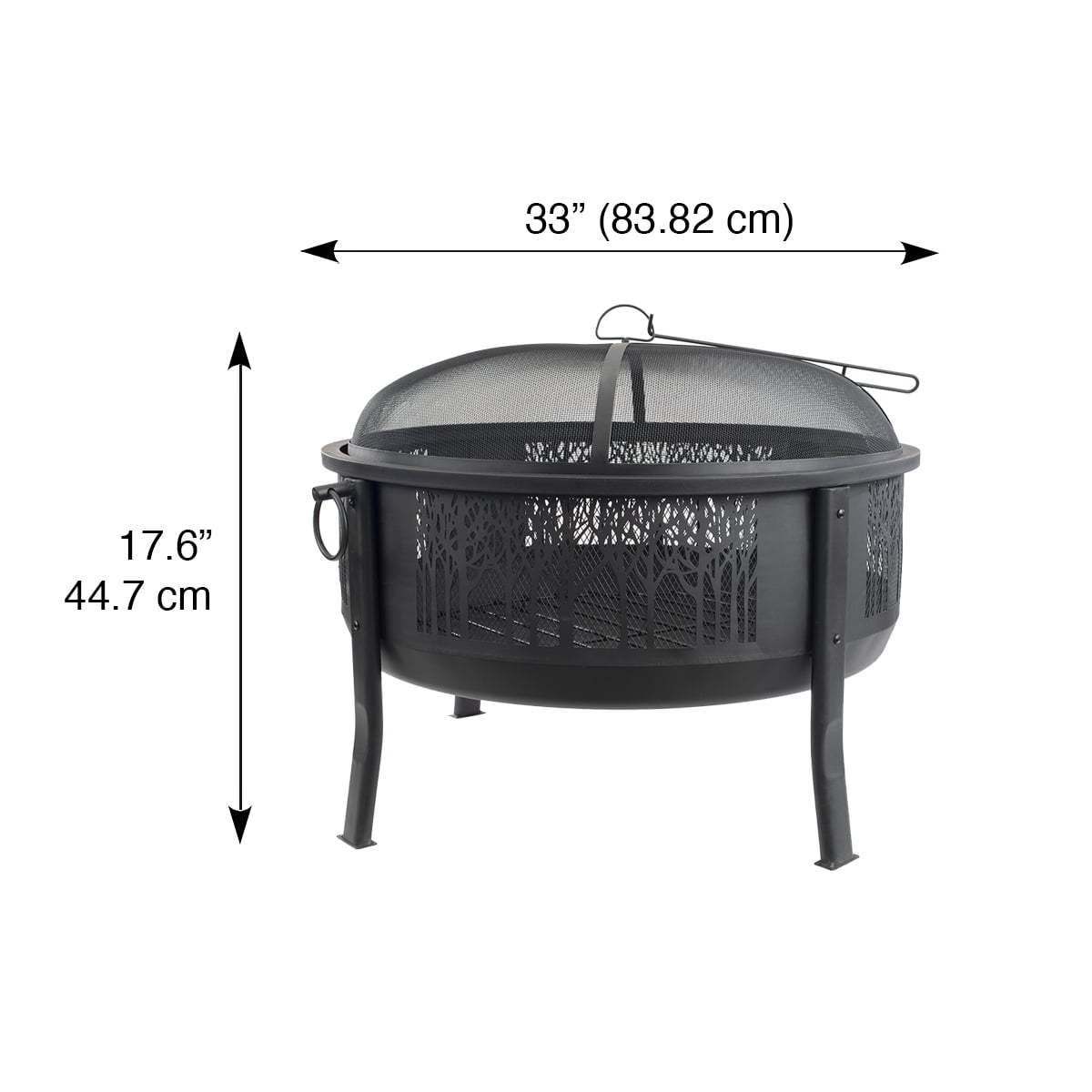 Gather around and enjoy a 360 degree view of the fire’s glow through the decorative, arborescent design of this large decorative fire barrel. This round, steel constructed barrel fire pit with a black high temperature paint coating is built with sturdy steel legs and a wide base for larger and longer lasting fires. It includes a log grate along with mesh paneling on all sides for better airflow to the fire. It also comes with a domed spark screen to keep embers and sparks contained, a screen lift to remove the screen safely, and a unique mesh top and bottom that provides a full view of the fire. Ring handles on either side of the caldron make it easy to move. This fire barrel will provide a warm and consistent fire for entertaining in your outdoor space or backyard patio.