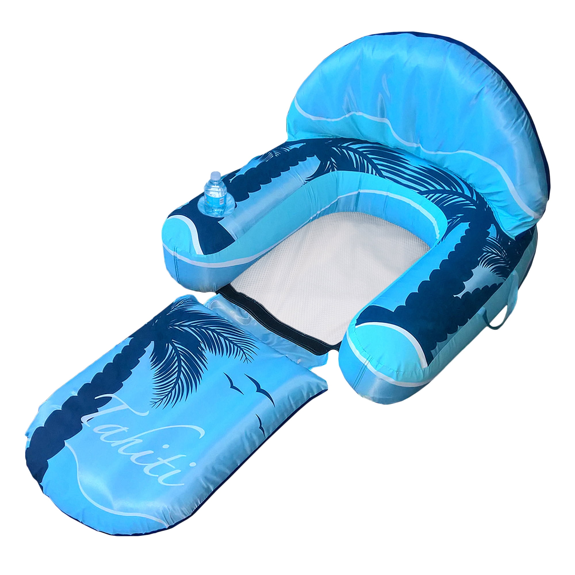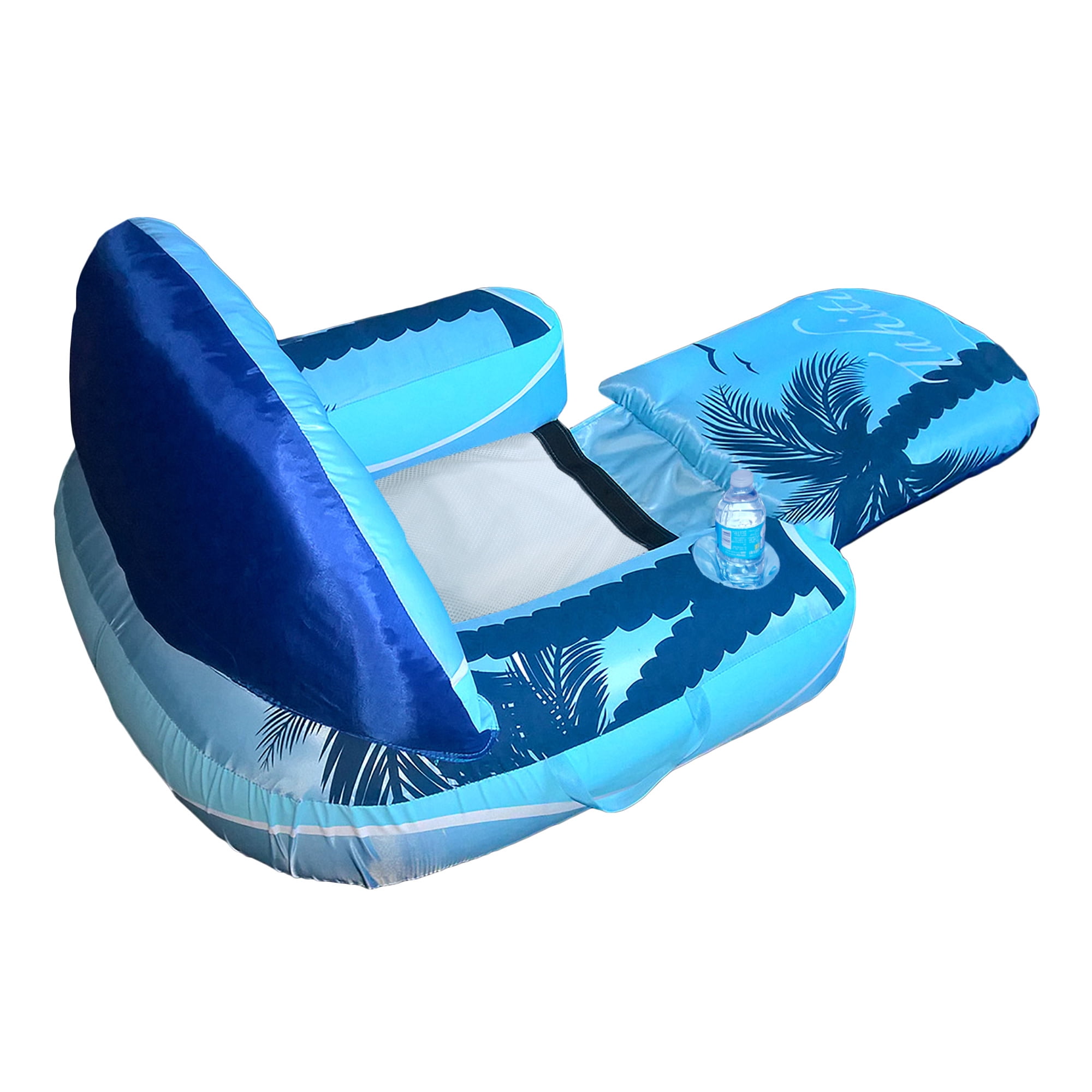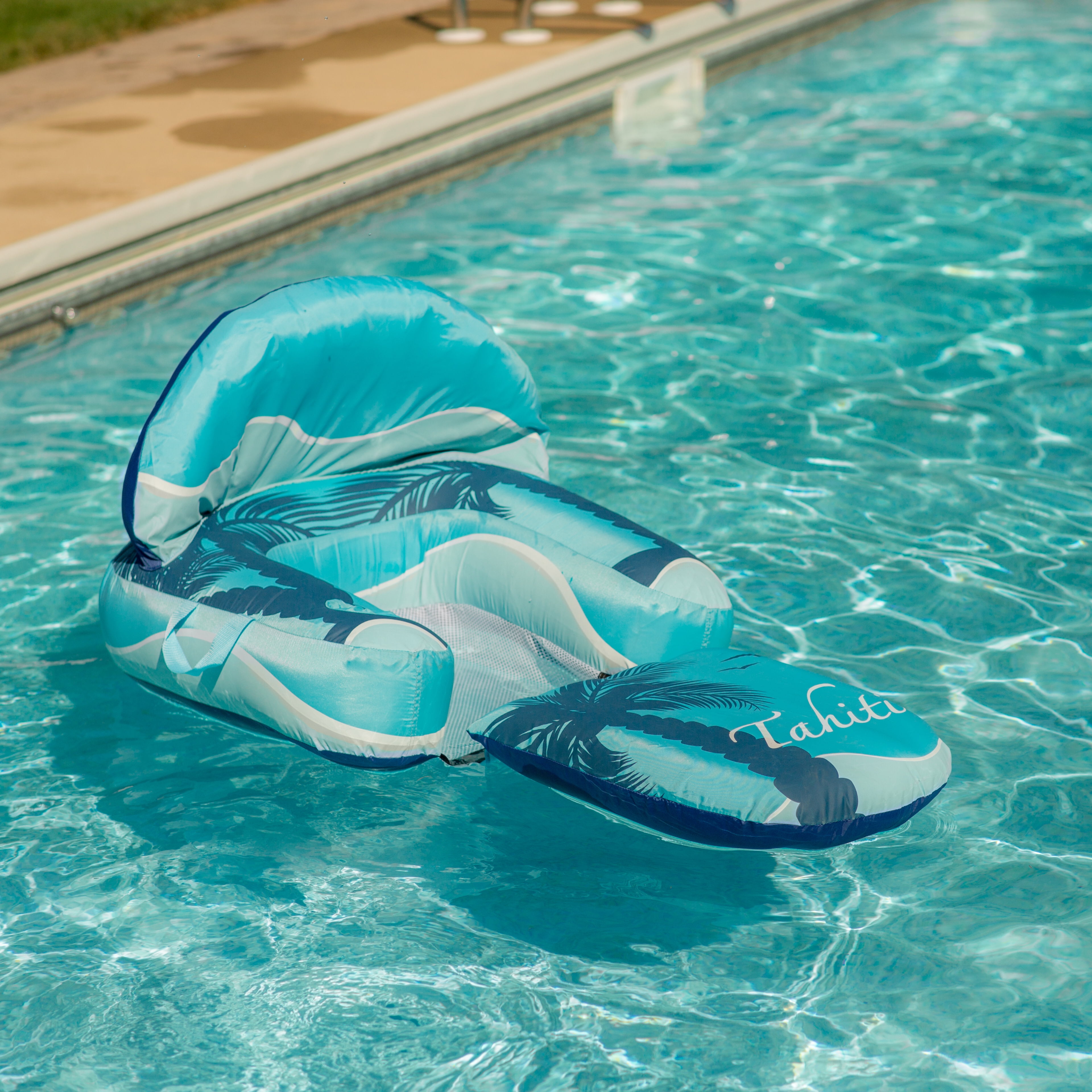 Measures 62-in x 36-in x 26-in when inflated Durable PVC bladder – 3 air chambers. Inflate to desired comfort. Premium colorfast, quick-dry polyester fabric cover with fade-resistant tropical themed graphics Contoured high-back seat for relaxed seating position Generous 20-in W x 22-in D mesh seating area allows continuous water flow to keep you cool while floating 10-in wide arm rests provide ultimate relaxation Built-in backrest for added comfort; 2 grab handles for easy transport INCLUDES: Repair patch kit included