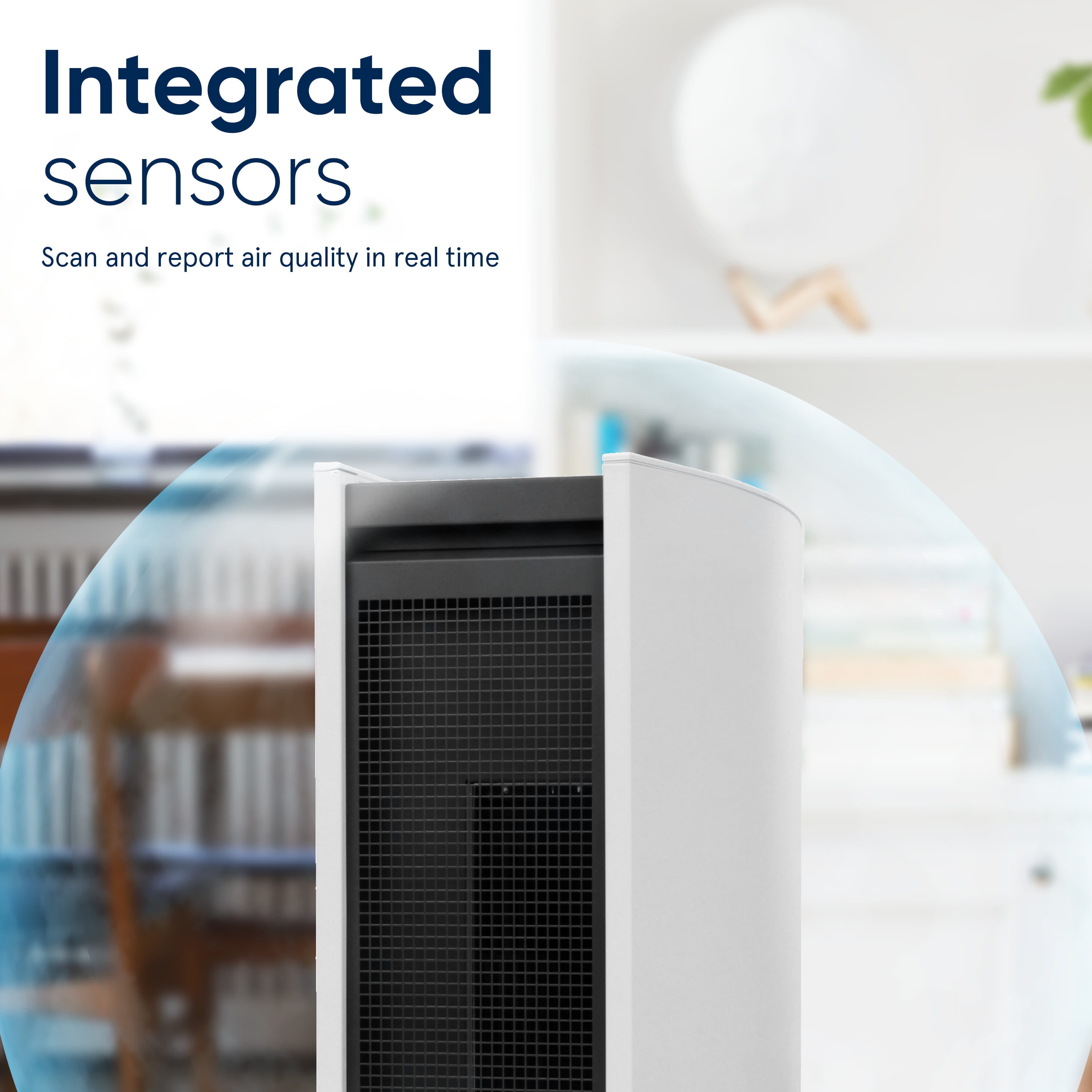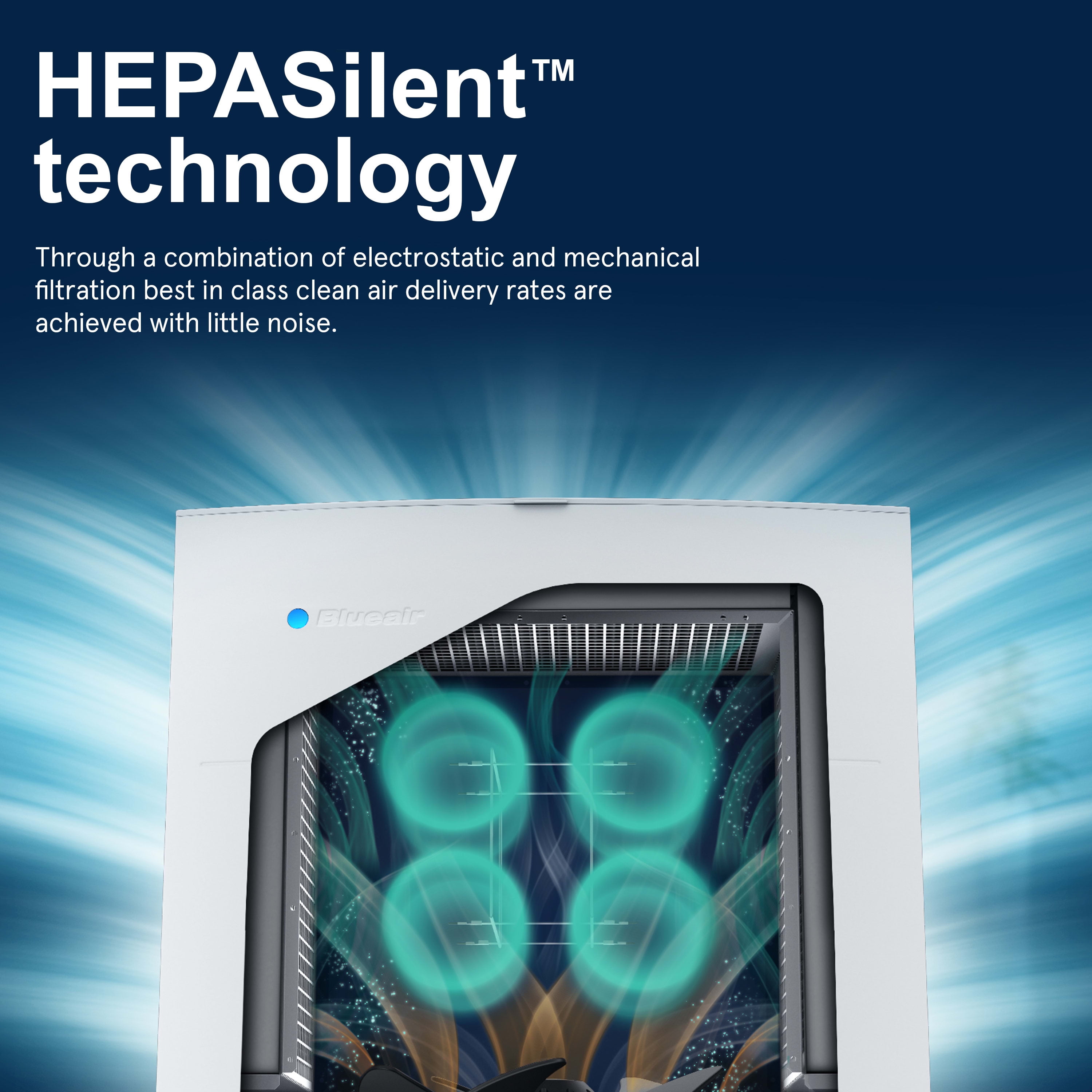 Performance you can trust; Independently evaluated and third-party tested for performance as part of the AHAM Verifide® Program for room air cleaners Medium rooms; Filters the air at rate of approx. 4.8x an hour (every 12.5 minutes at 434 ft² ) to effectively lower and maintain particle levels HEPASilent technology; Removes 99.97% of airborne particles down to 0.1 microns, such as pollen, dust, mold, pet dander, bacteria, and viruses⁰ Automatically keep up with changing conditions to assure air quality never becomes unhealthy with intelligent sensors, AUTO mode, and Wi-Fi Odor removal with DualProtection filters; high-porosity coconut carbon removes gases, chemicals, VOC, and odors from pets, cooking, and smoking Wi-Fi enabled; Change settings remotely from your smartphone via the Blueair app or connect with your Amazon Alexa enabled device for voice control Built to last with durable, galvanized steel housing; backed by up to 5-years of warranty coverage when you register your air purifier Sleep without disruption with noise-levels no louder than a whisper on low speed (32 dB) and equivalent to the noise level of rainfall on high (56 dB)