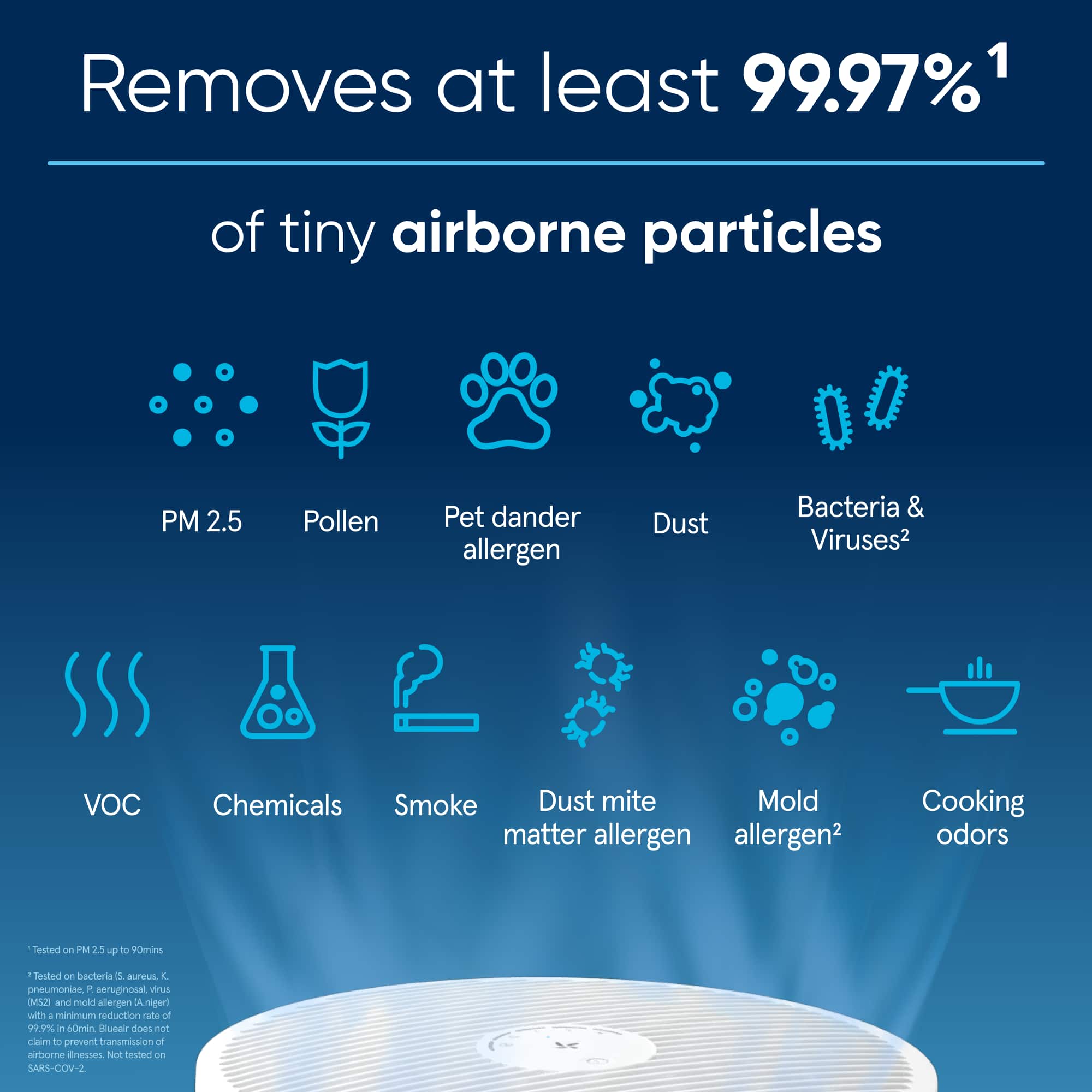 §Tested PM 2.5 (0.1 – 2.5 microns) up to 90min in a 30m3 room. Tested to remove min. 99.9% of S. aureus, K. pneumoniae, P. aeruginosa, MS2, E.Coli, H1N1, A.Niger.