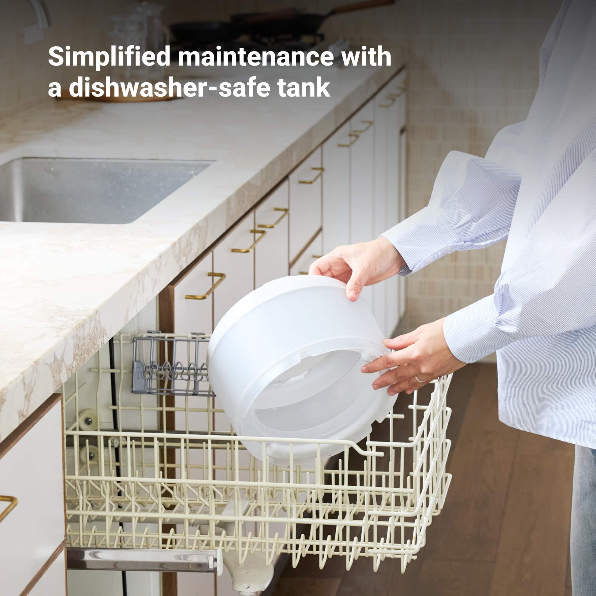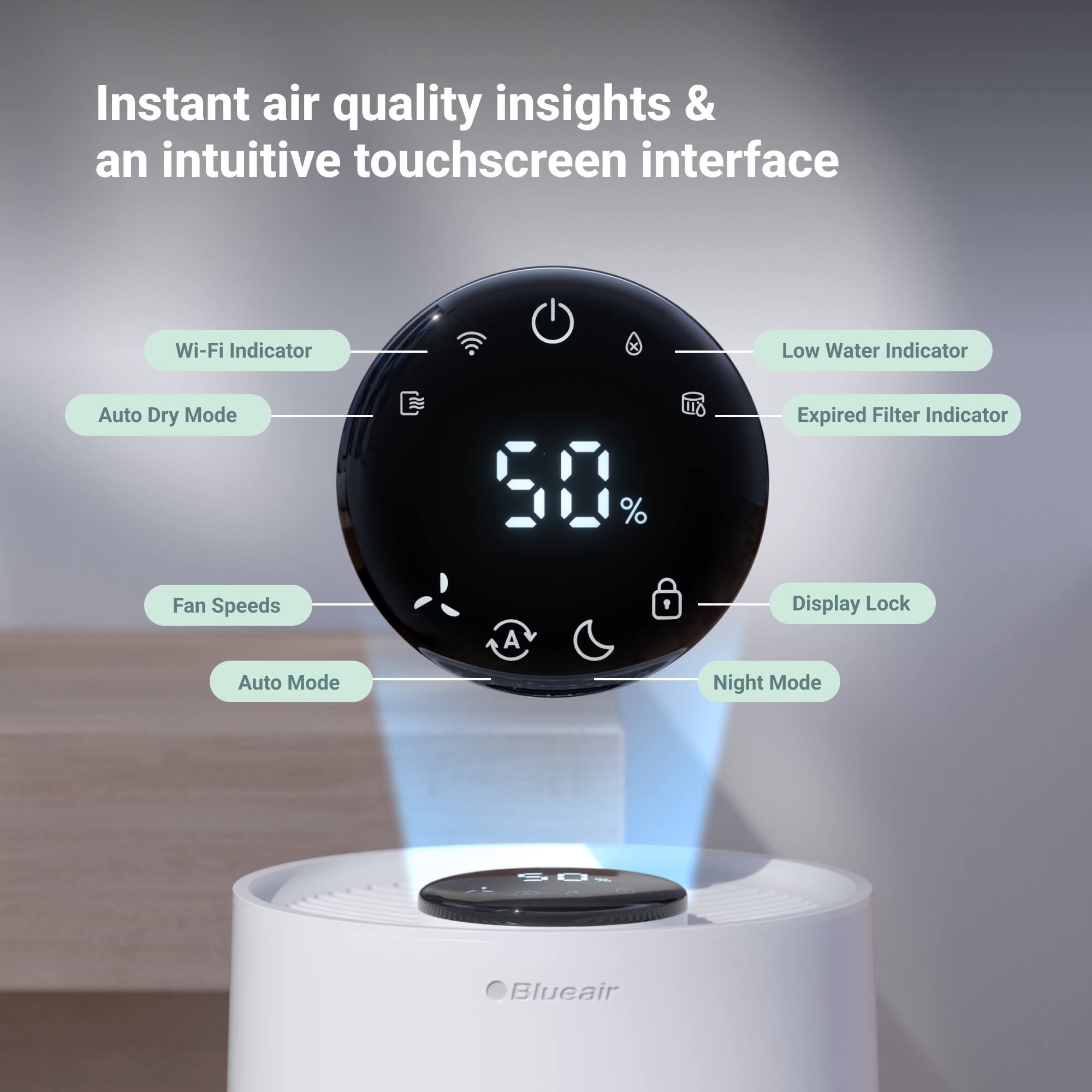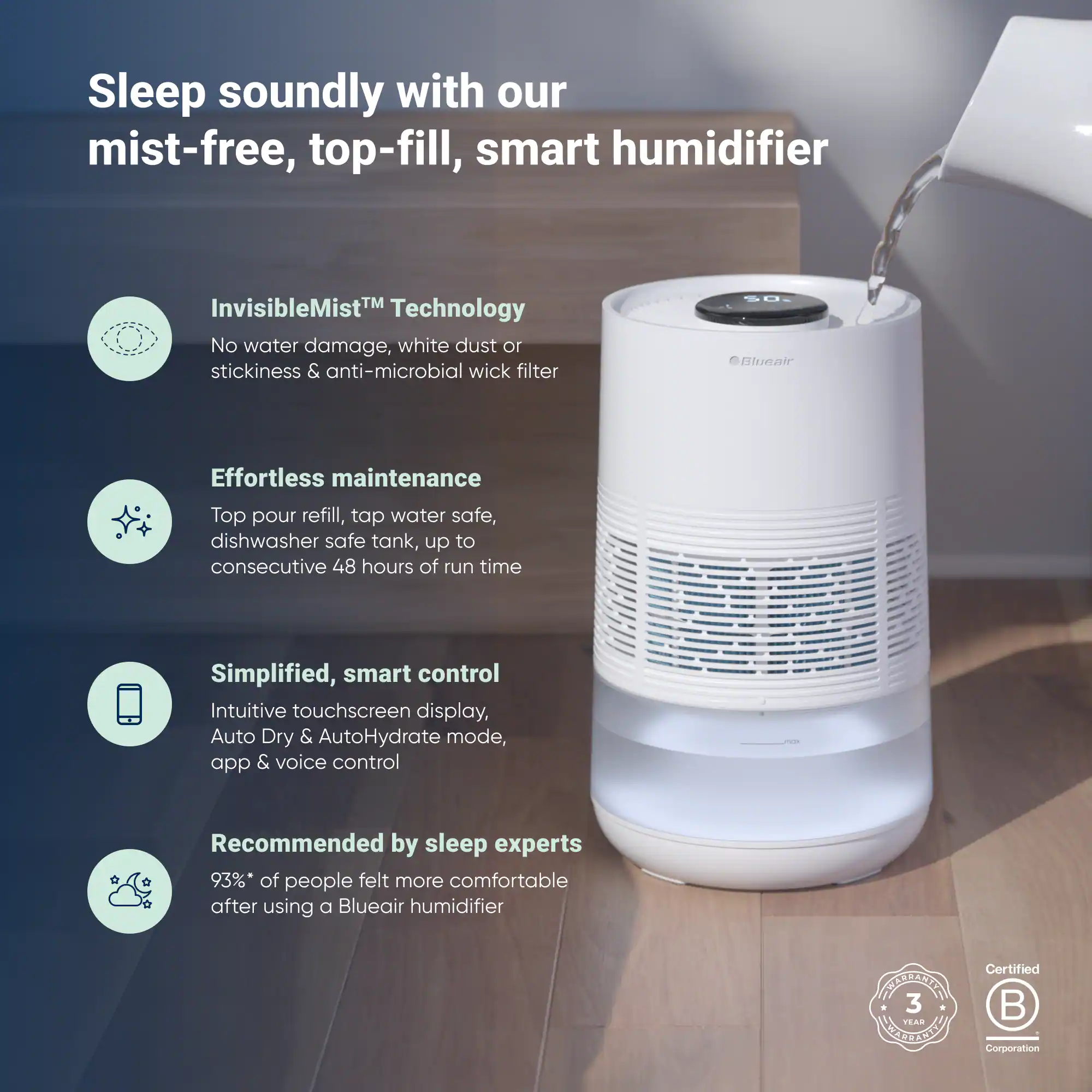Blueair Humidifier for Large Rooms and Bedrooms – 500 Sqft Coverage, 360° InvisibleMist Technology, UV-Integrated Water Pump, AutoHydrate, Quiet Night Mode, Easy Maintenance, Dishwasher Safe The Blueair Humidifier offers rapid, efficient humidification for large rooms and bedrooms, covering up to 500 sqft. Designed to improve your sleep environment, this humidifier uses cutting-edge 360° InvisibleMist Technology, delivering up to 48 hours* of clean, moisture-rich air. The anti-microbial coated wick filter traps impurities, releasing pure water vapor without stickiness, residue, or white dust. Our upgraded UV-integrated water pump now automatically detects water refills, enhancing user convenience. Continuous recirculation of water helps reduce the risk of bacteria growth in still water. With easy top-fill or bucket refill options, the large tank opening ensures hassle-free maintenance, and the tank is also dishwasher safe for deep clean. Experience optimal comfort with the Blueair app, allowing you to personalize your environment. The AutoHydrate feature automatically adjusts to your desired humidity levels, while Night Mode ensures quiet, continuous humidification for undisturbed sleep. *48 hour runtime is based on 77°F (25°C), 50% RH in night mode. Results may vary based on room conditions.