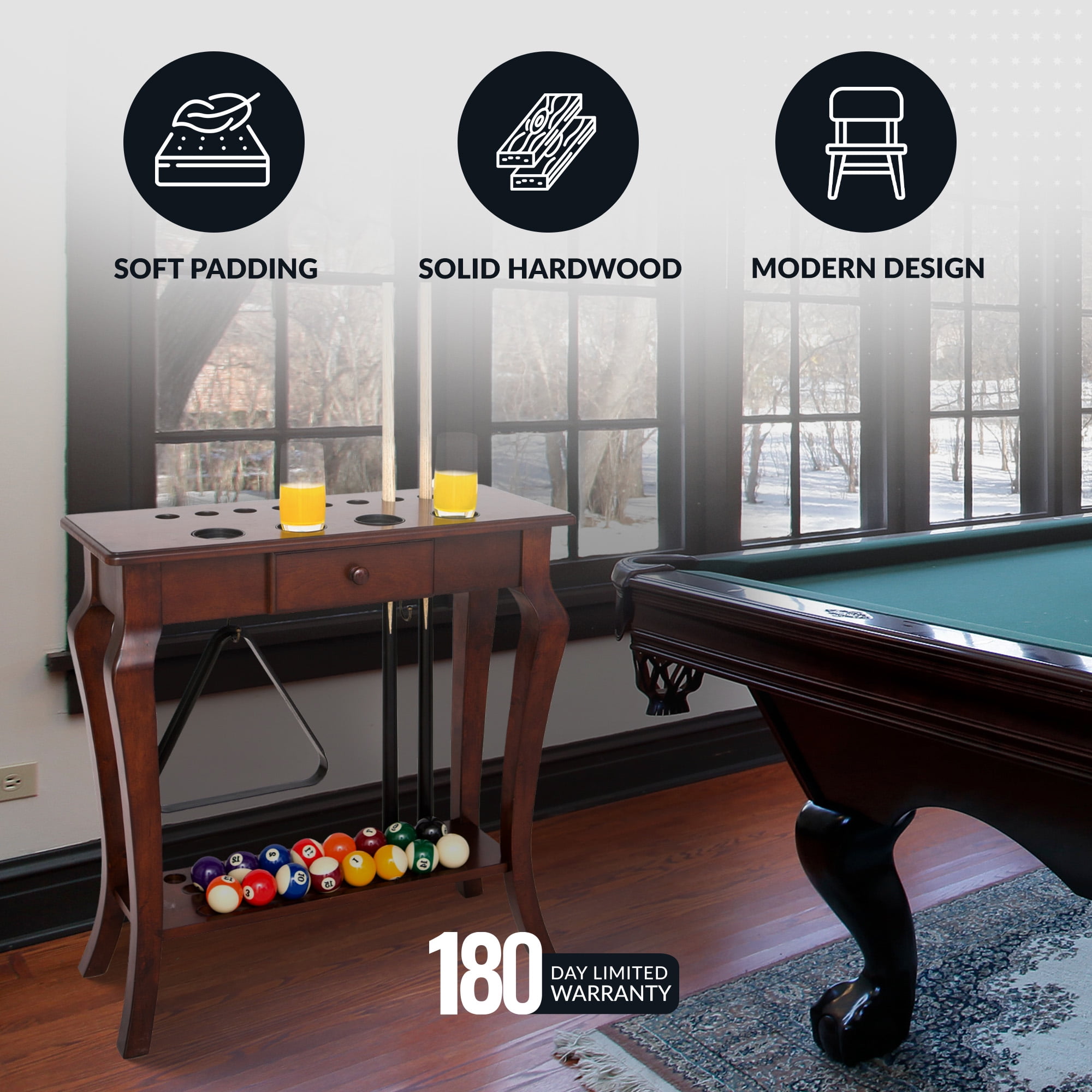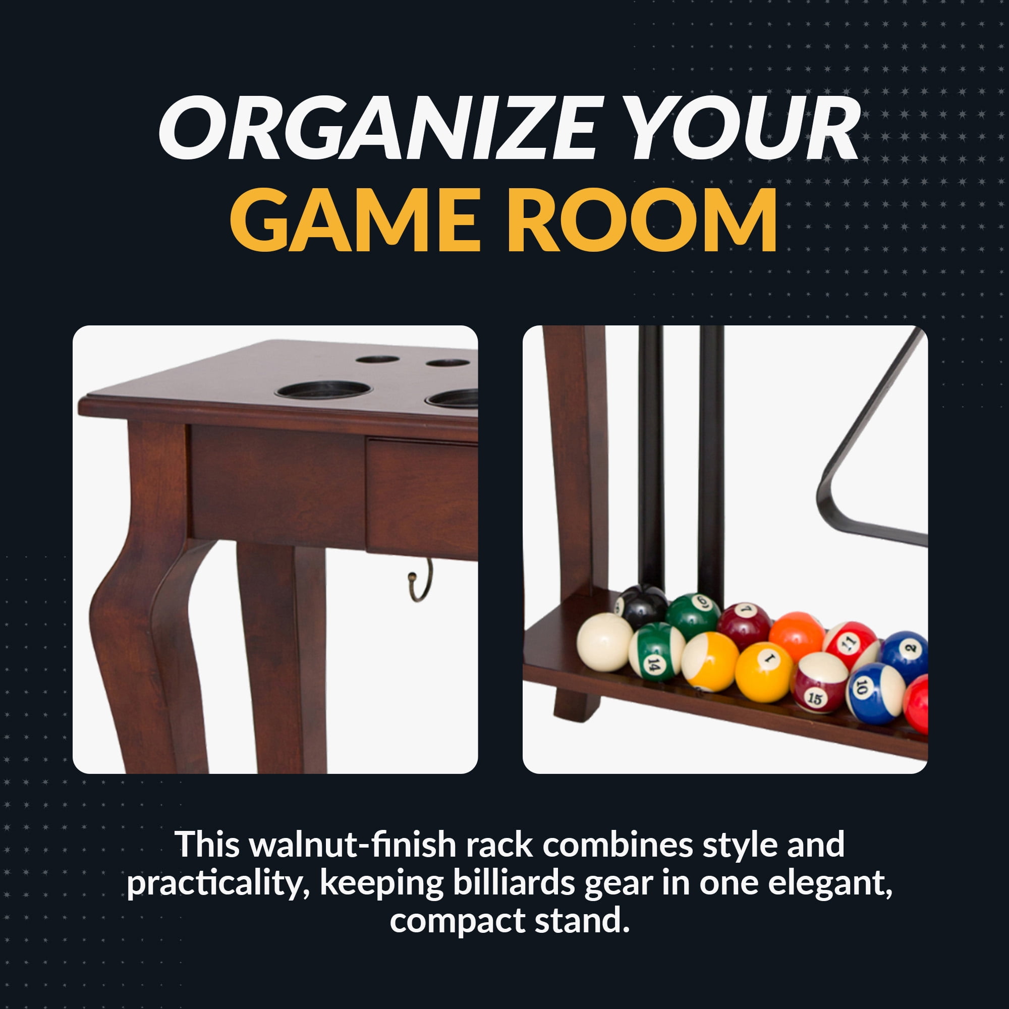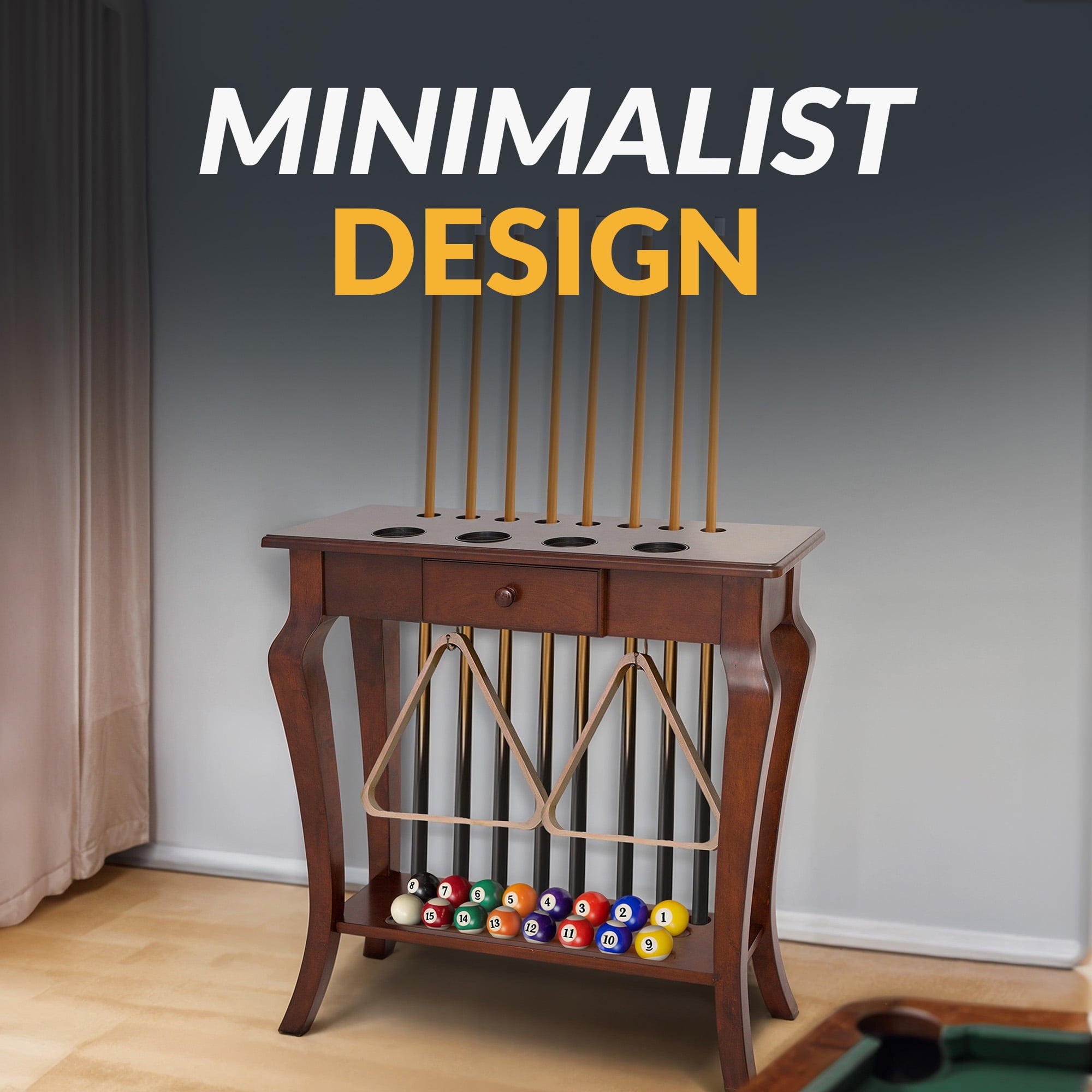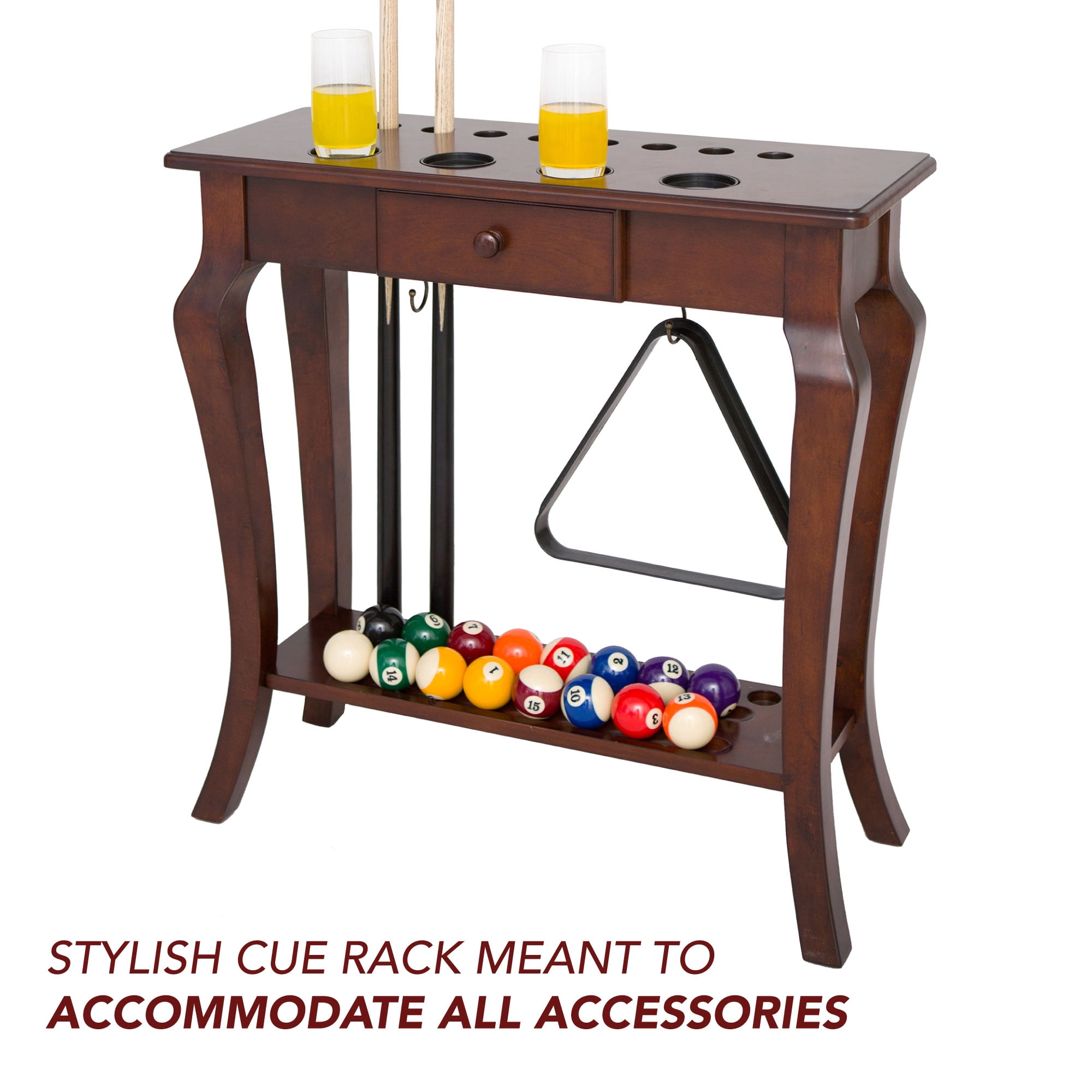 Bluewave Deluxe Floor Cue Rack – Walnut FinishThe Deluxe Floor Cue Rack in a beautiful Walnut furniture finish is ideal for anyone with a billiards table. This rack holds eight 57-in cues, a full set of billiard balls, 2 ball racks and accommodates most other pool accessories. It is the perfect way to keep your game room neat and looking great. A functional attractive addition to any billiards room. 180-day limited warranty.Features Dimensions: 30-in W x 12-in D x 30-in H Stylish design crafted from solid hardwood 10-step, high quality furniture finish in Walnut Convenient drawer for smaller accessories Accommodates all accessories keeping them neat and organized