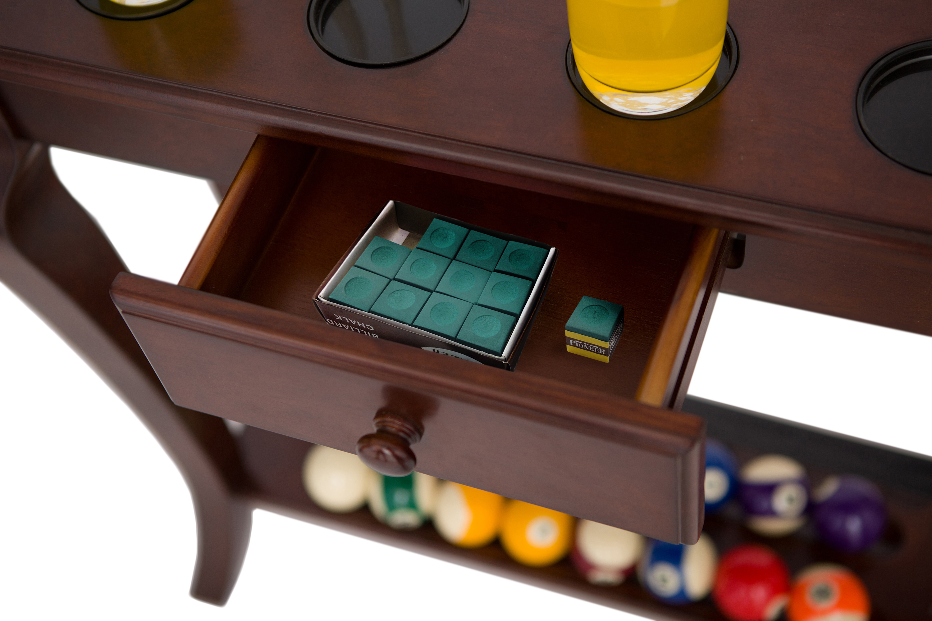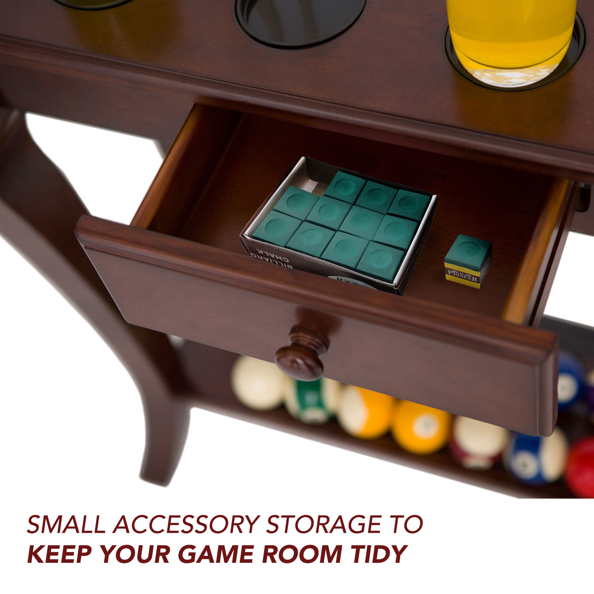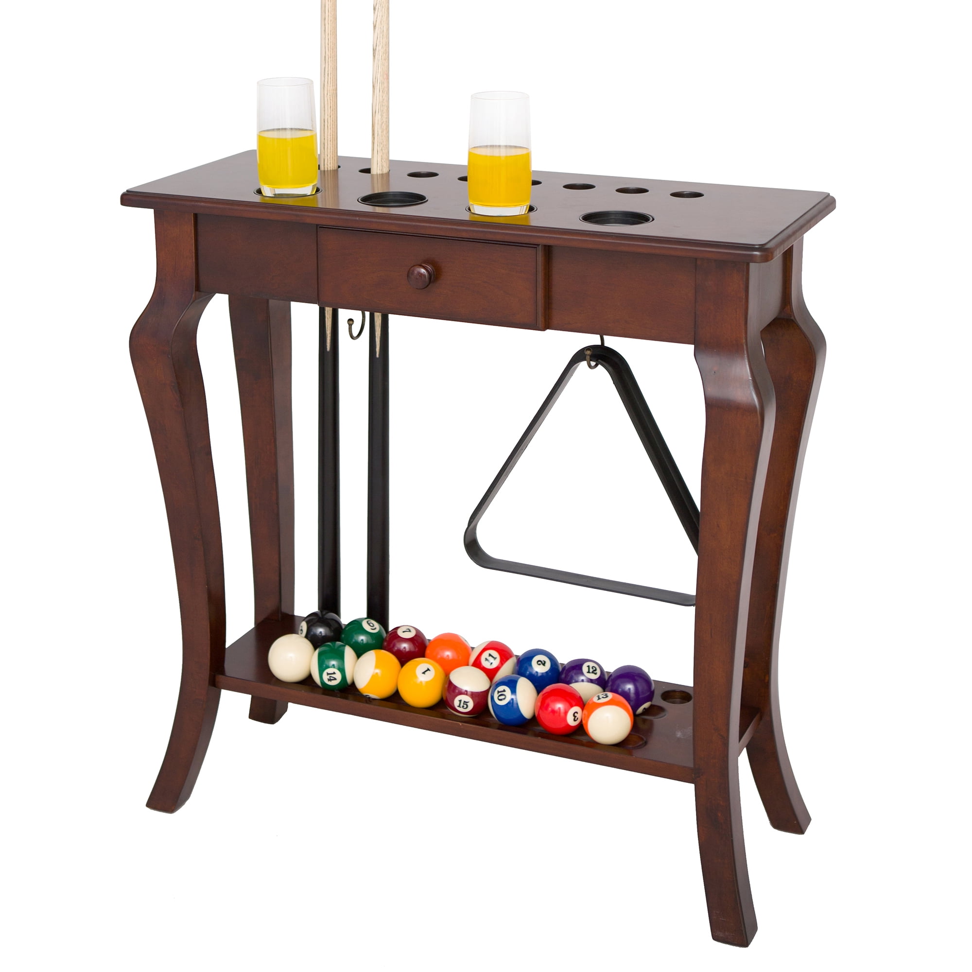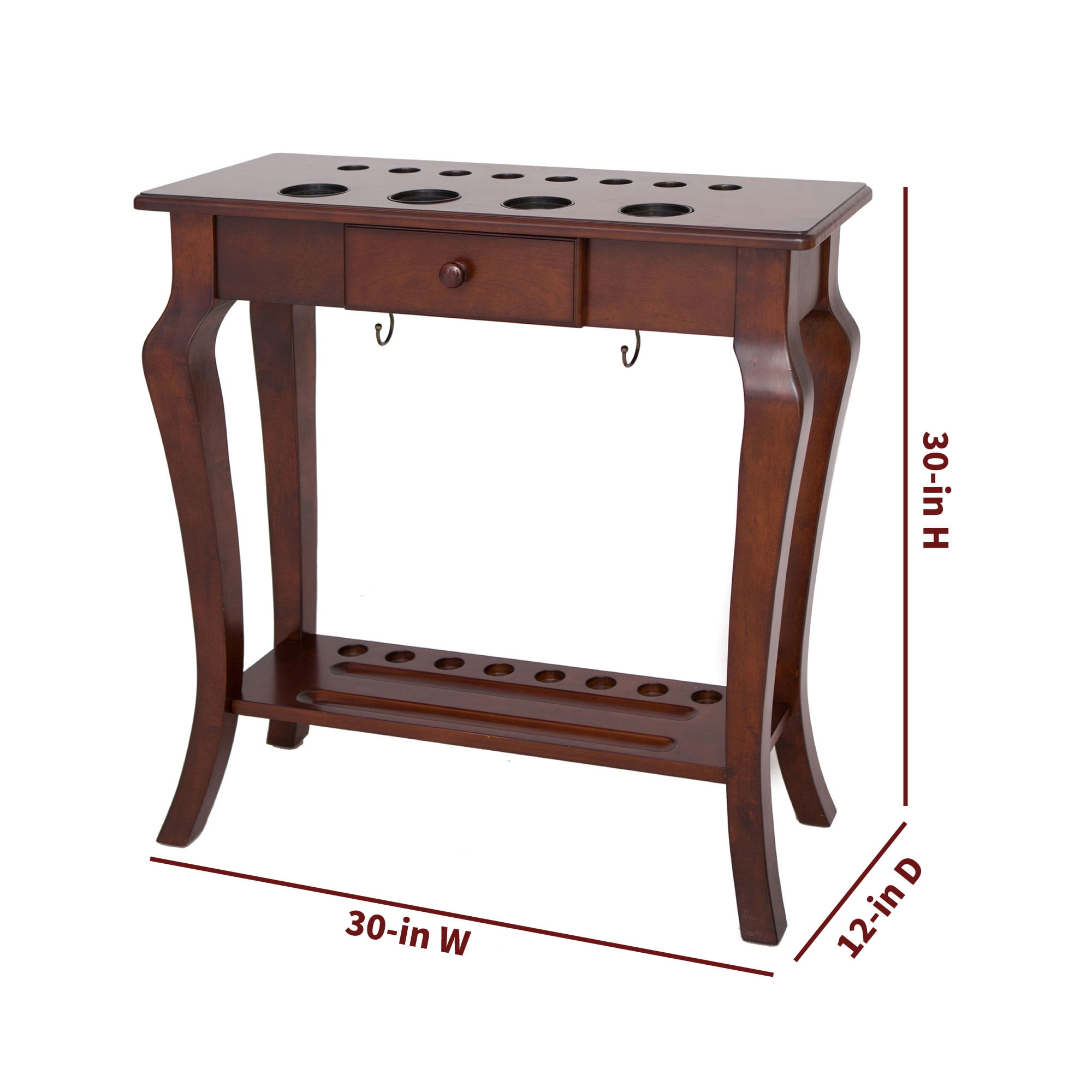 Bluewave Deluxe Floor Cue Rack – Walnut FinishThe Deluxe Floor Cue Rack in a beautiful Walnut furniture finish is ideal for anyone with a billiards table. This rack holds eight 57-in cues, a full set of billiard balls, 2 ball racks and accommodates most other pool accessories. It is the perfect way to keep your game room neat and looking great. A functional attractive addition to any billiards room. 180-day limited warranty.Features Dimensions: 30-in W x 12-in D x 30-in H Stylish design crafted from solid hardwood 10-step, high quality furniture finish in Walnut Convenient drawer for smaller accessories Accommodates all accessories keeping them neat and organized